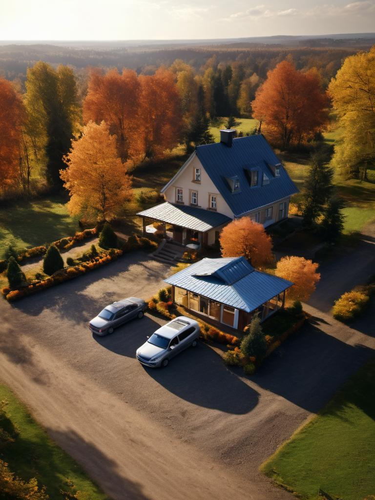 tip: You can use autumn, outdoors, sky, day, cloud, tree, blue_sky, no_humans, nature, scenery, mountain, road, house, landscape, these prompts or part of them to assist in the generation.