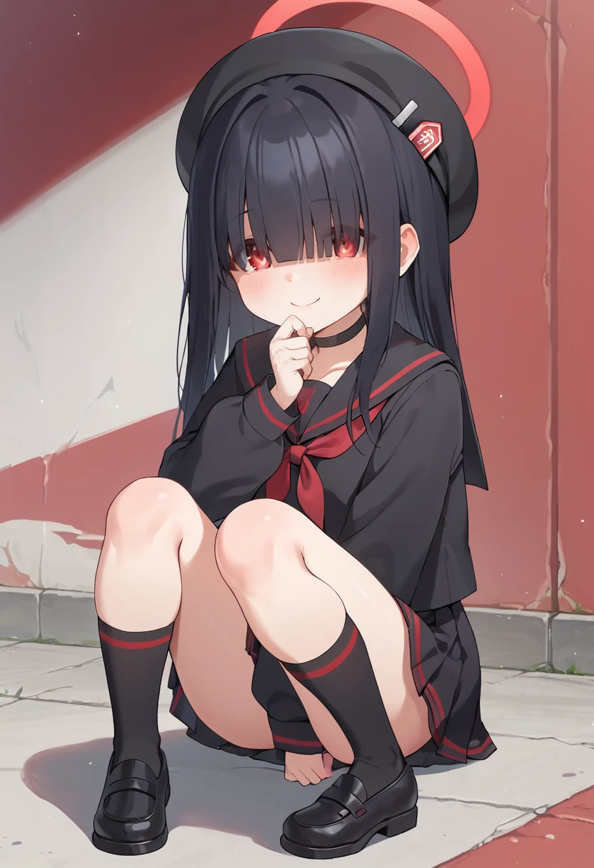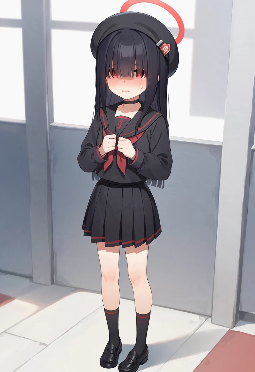 seijitsu-eyes,justice task force member \(blue archive\),red eyes,hair over eyes, black hair,halo,choker,beret,black serafuku,skirt,black socks,black footwear