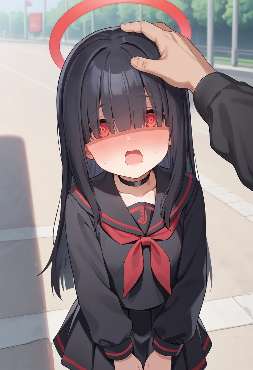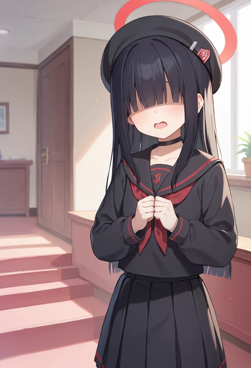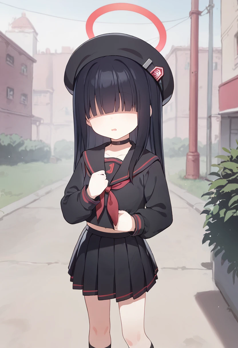 seijitsu-noeye,justice task force member \(blue archive\),(no eyes:1.2),hair over eyes, black hair,halo,choker,beret,black serafuku,skirt,black socks,black footwear
