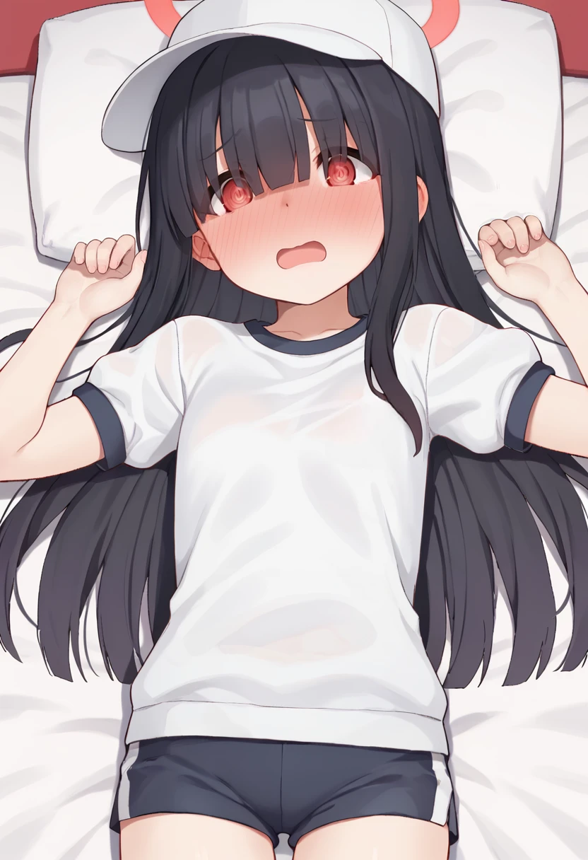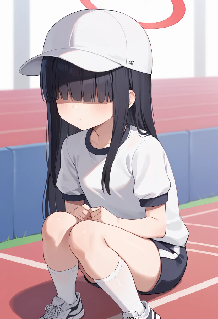 (seijitsu-gym:1.2),justice task force member \(blue archive\),(no eyes:1.2),hair over eyes, black hair,halo,white headwear,baseball cap,gym uniform,(white shirt:1.2),short sleeves,shorts,white socks,sneakers