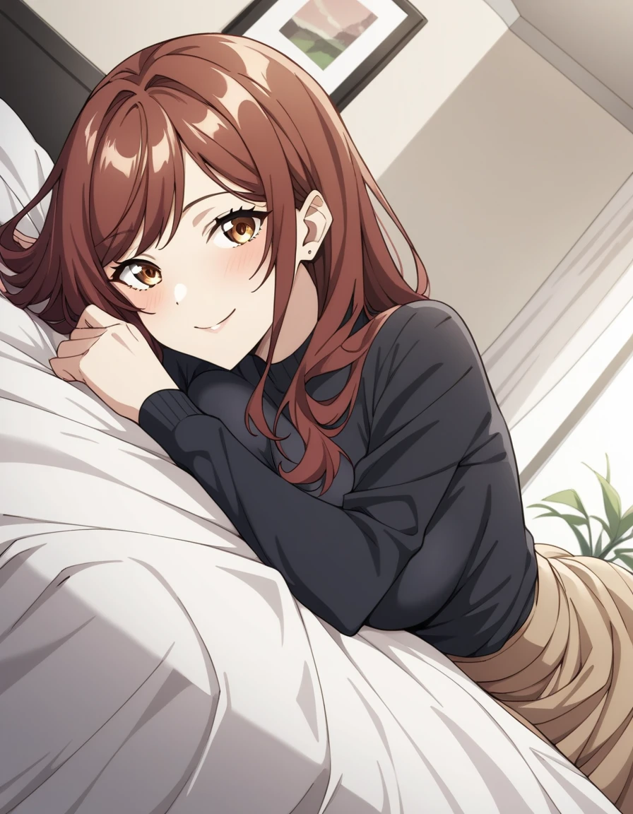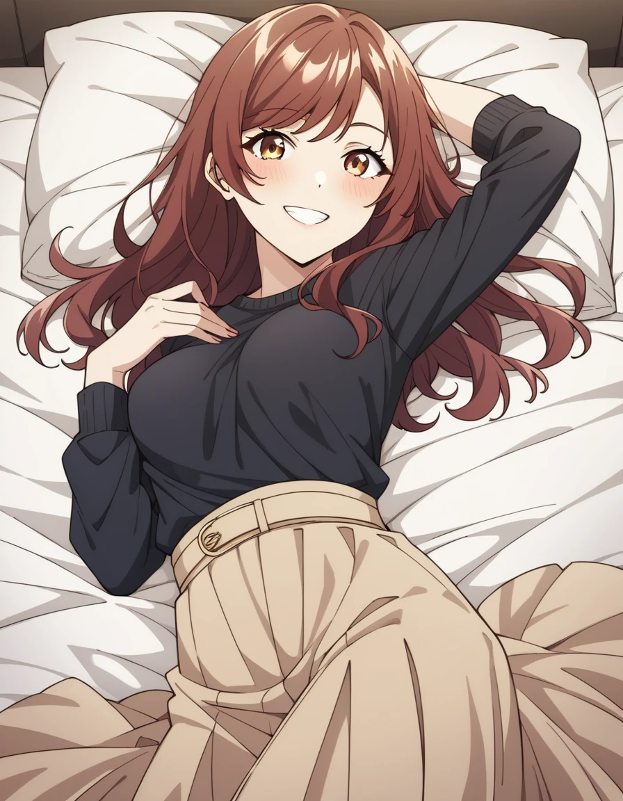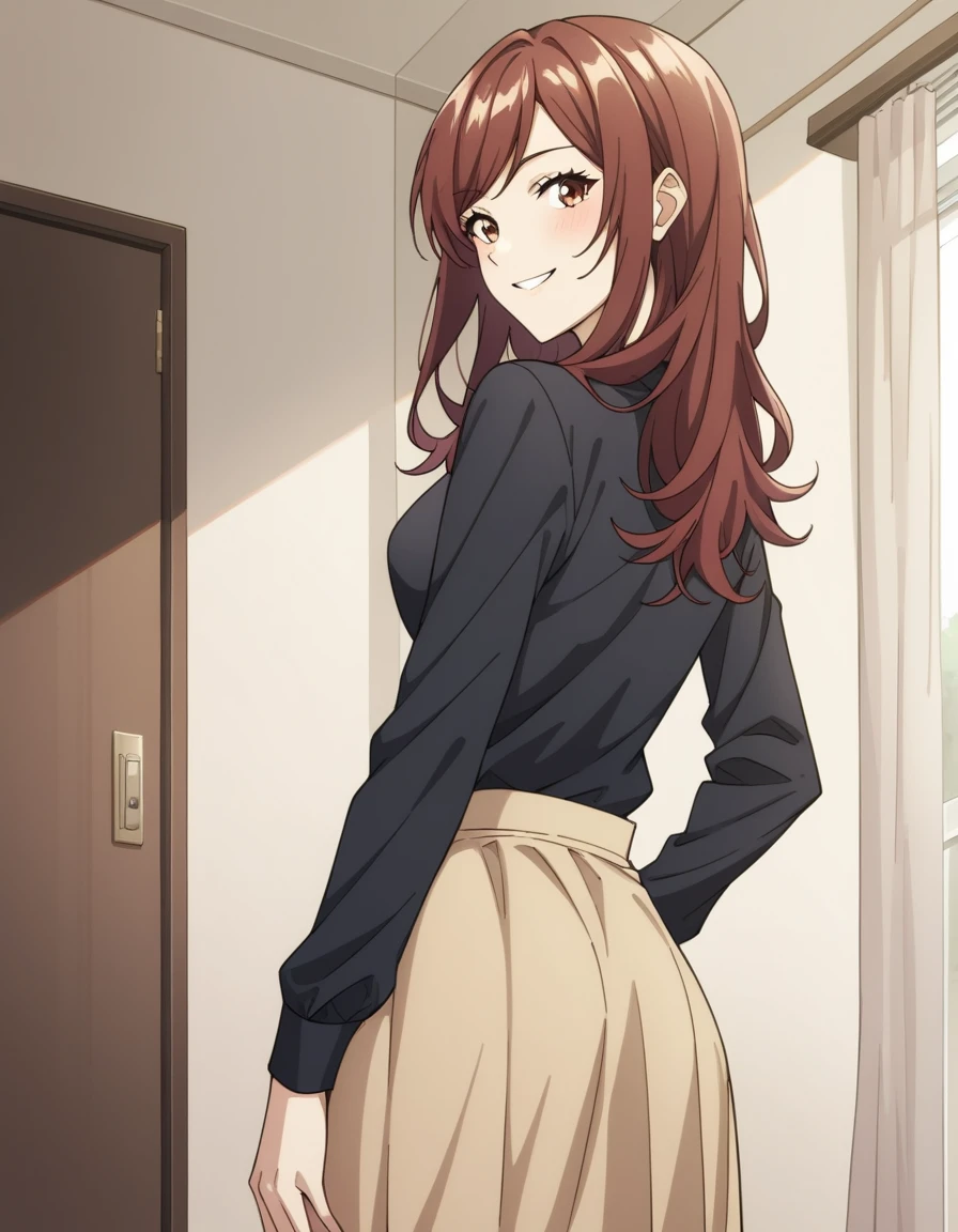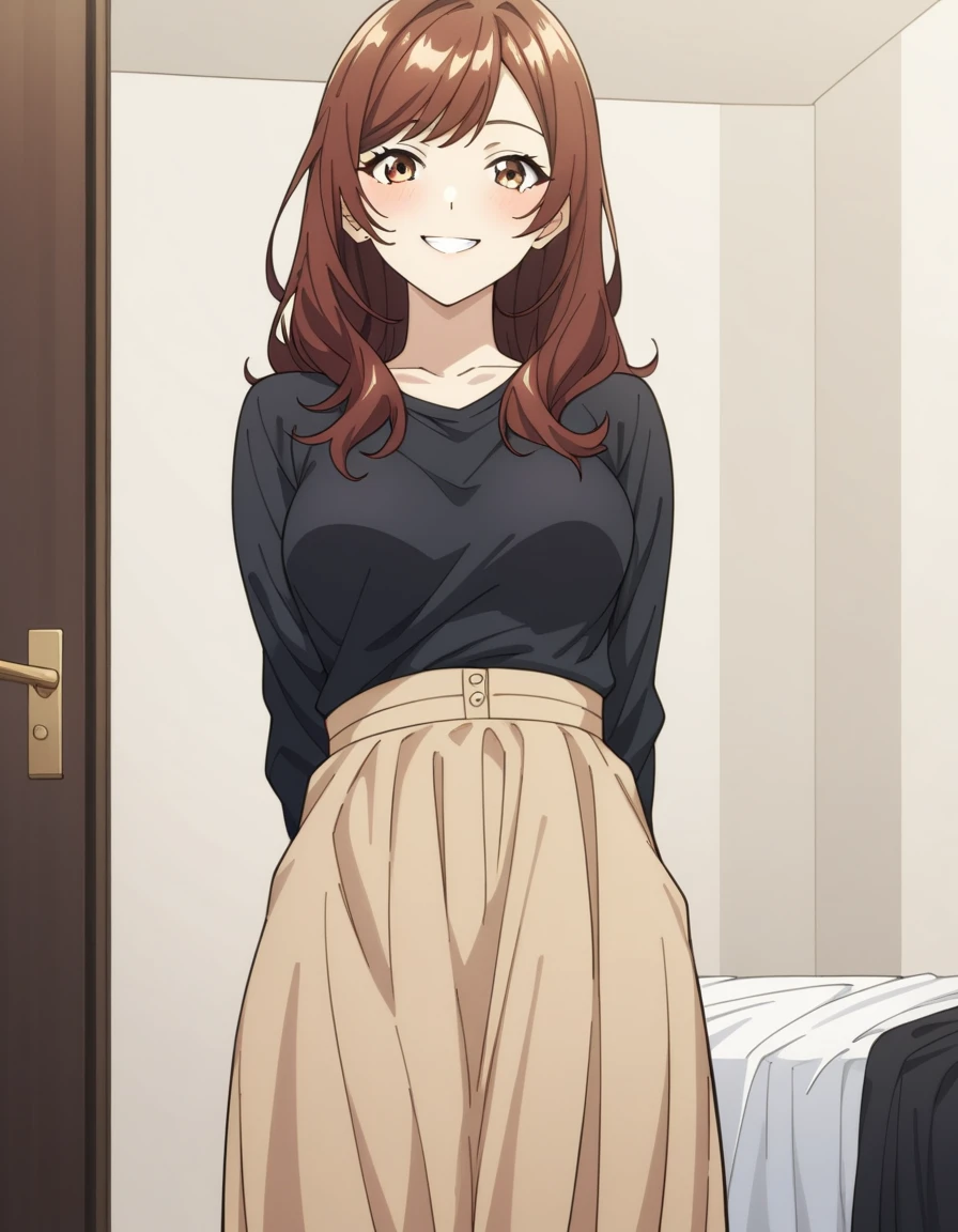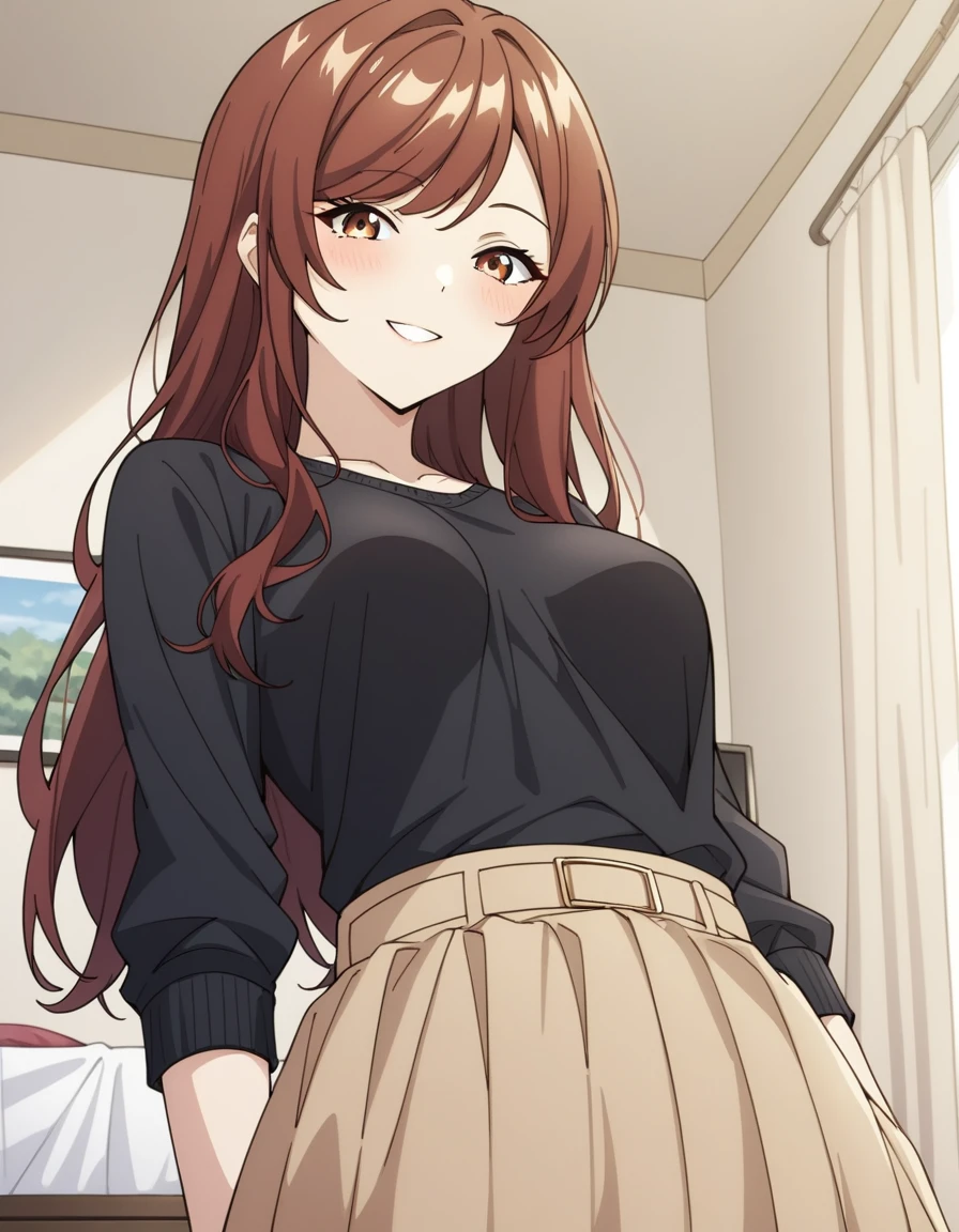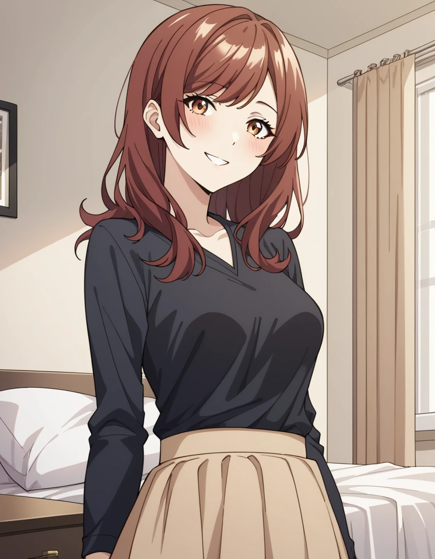 MiuMidou, brown eyes, brown hair, red hair, long hair, bangs, medium breasts,