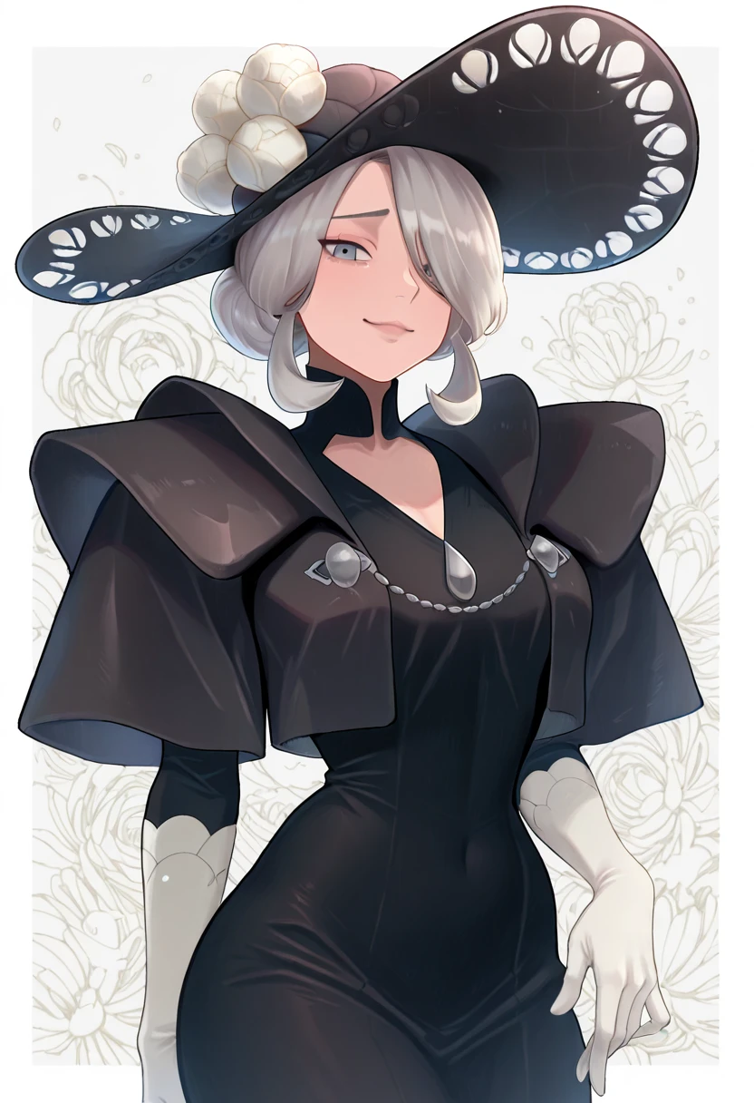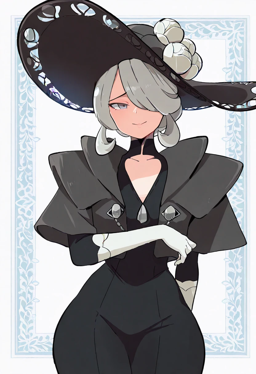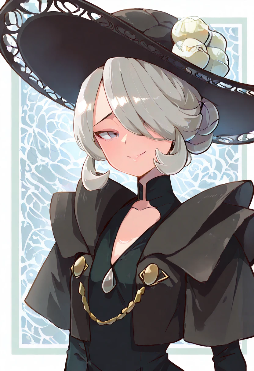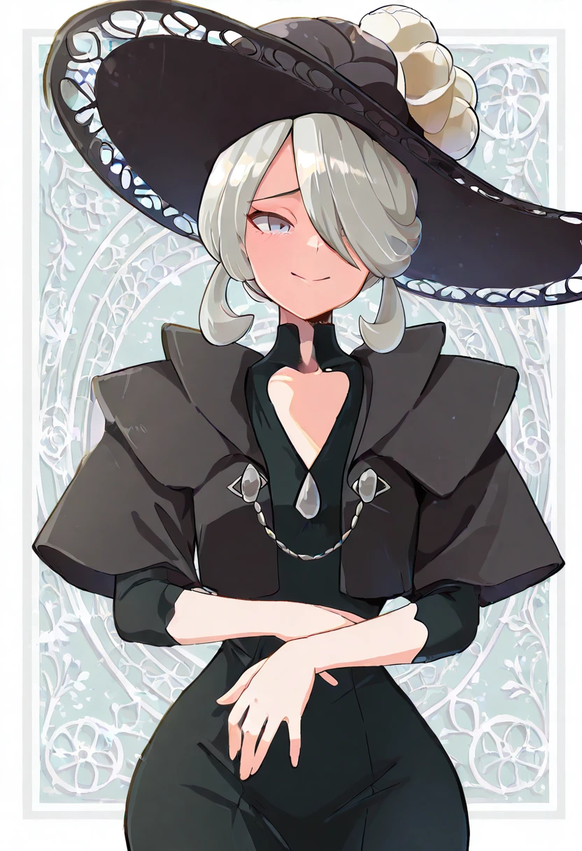 zzCogita, hair over one eye, grey hair, white hair, short hair, grey eyes, black hat, black dress,