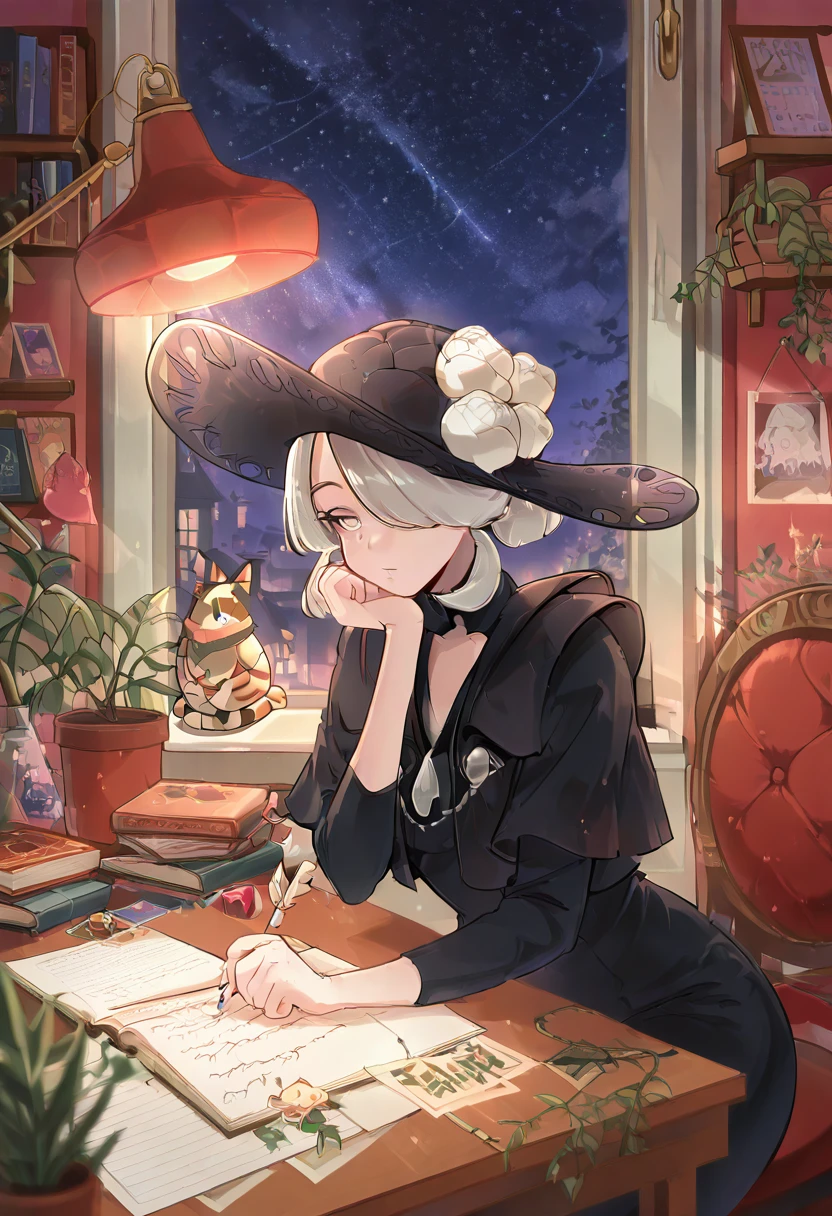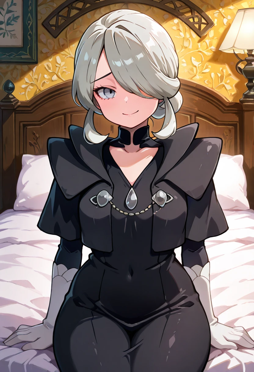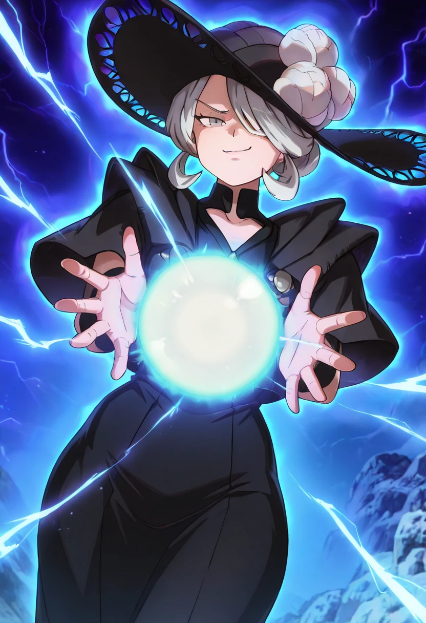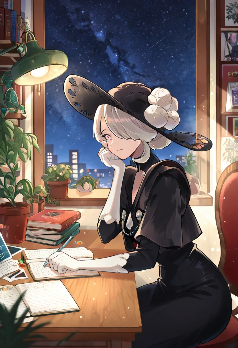 zzCogita, hair over one eye, grey hair, white hair, short hair, grey eyes, black hat, black dress,