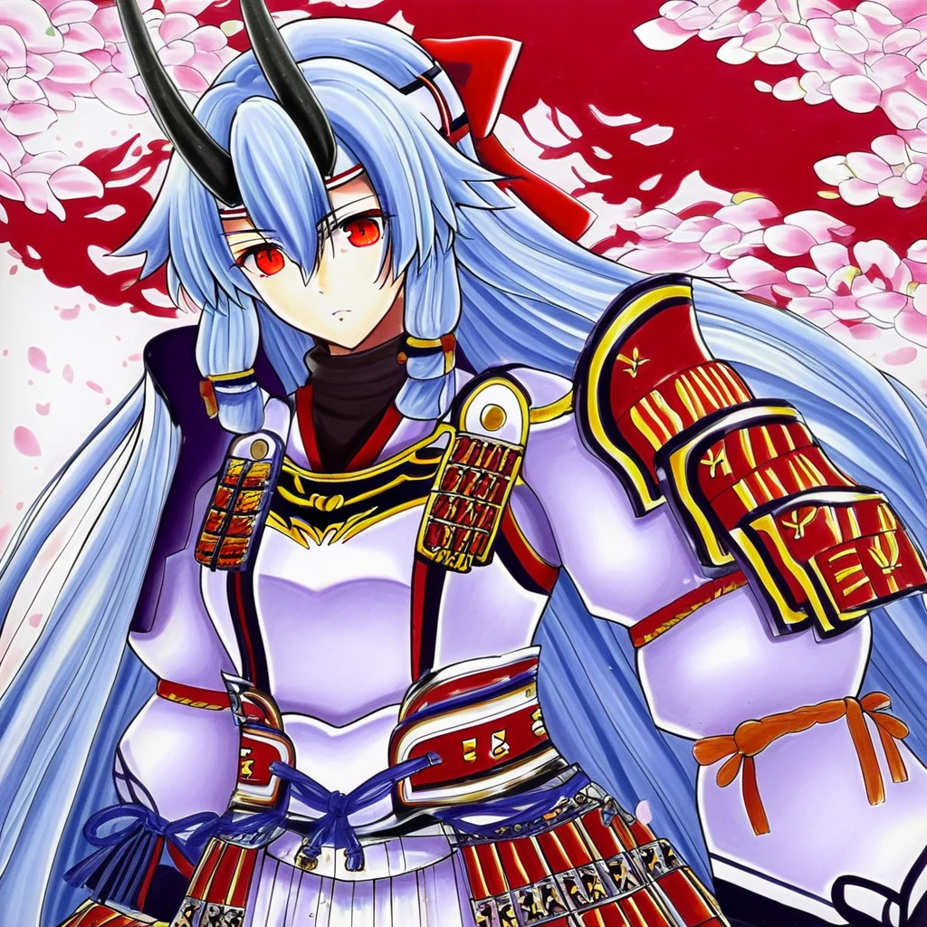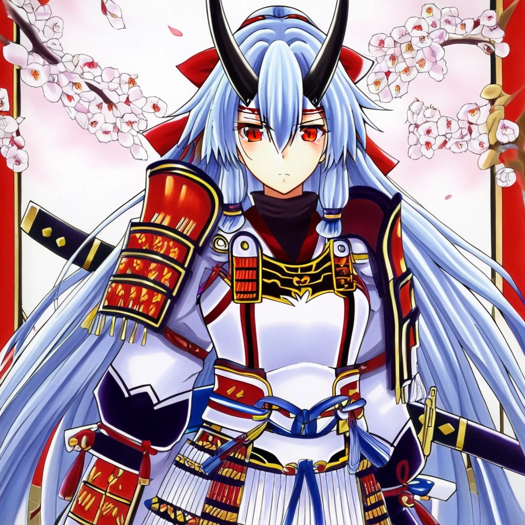 Tomoe, 1girl, solo, red eyes, light blue hair, very long hair, hair between eyes, parted bangs, oni horns, hair ornament, white Headband, Samurai armor, Traditional Japanese armor plating, Decorative chest plate, Shoulder guards armor, White hakama-style pants, Armored gauntlets (black and red)