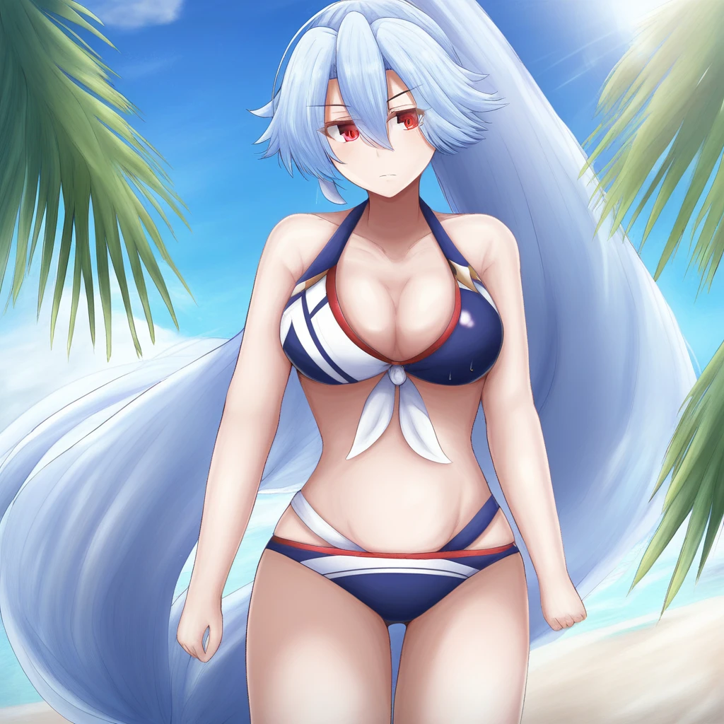 Tomoe, 1girl, solo, red eyes, light blue hair, very long hair, ponytail, hair between eyes, parted bangs, bikini, swimsuits, panties, blue thighights, cleavage,