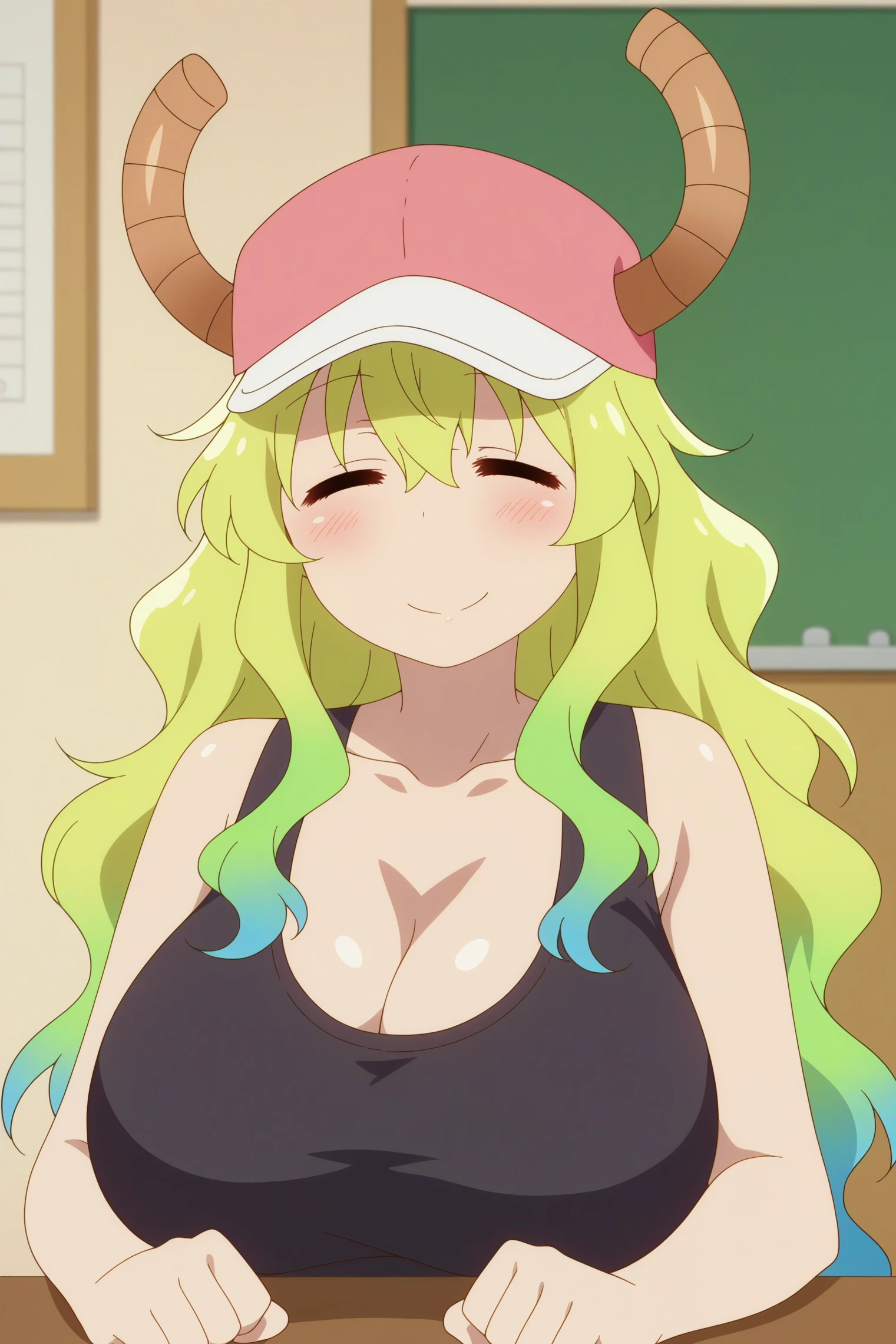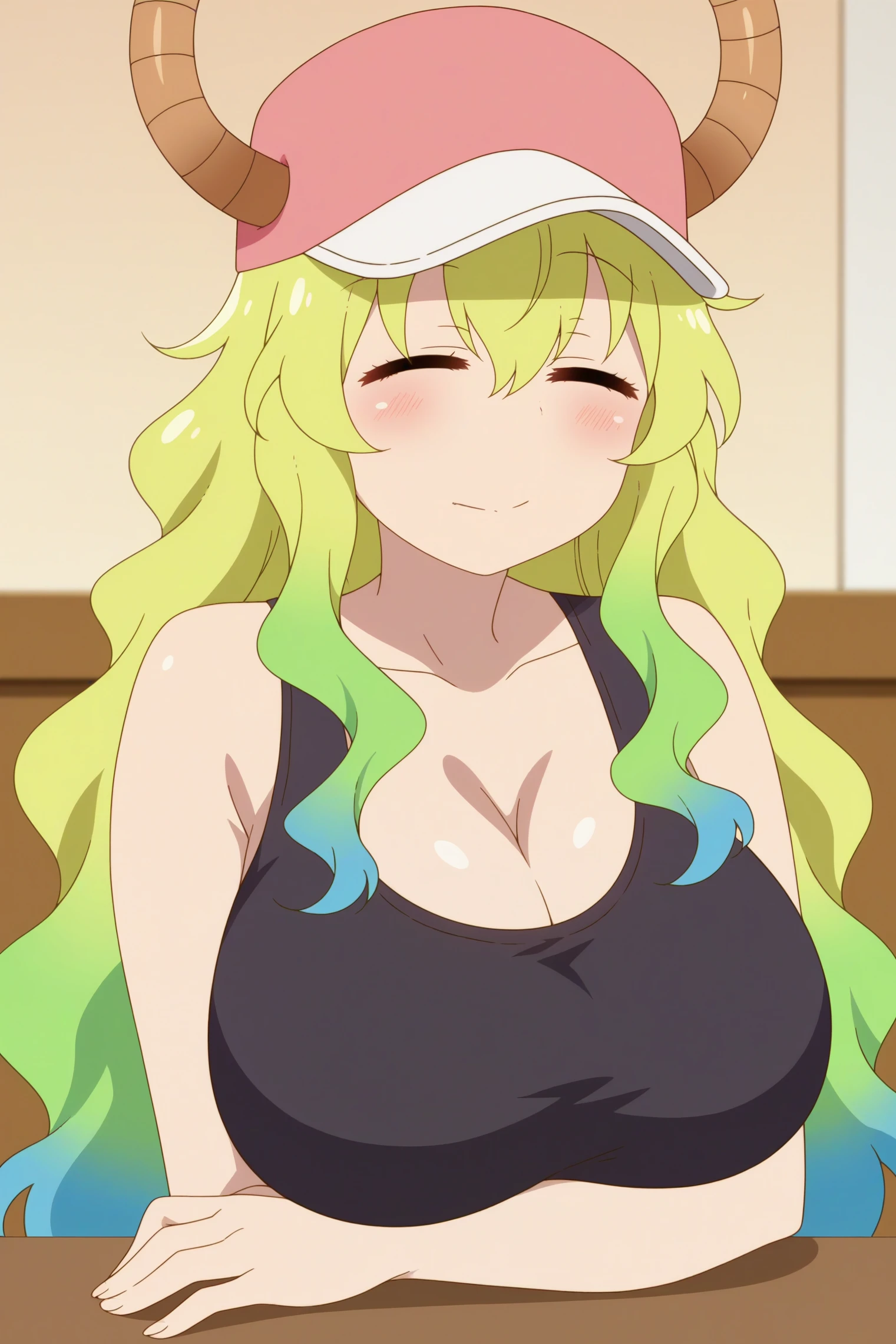 Triggers : 1girl,solo,quetzalcoatl,orns through headwear,horns,hat,breasts,closed eyes,dragon horns,smile gradient hair,multicolored hair,long hair,green hair,baseball cap,cleavage,black tank top