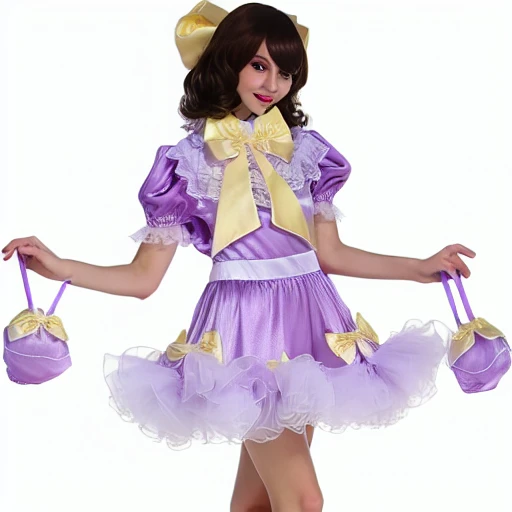 light purple shiny satin puffy dress, white lace peter pan collar, light purple lace-trimmed puffy short sleeves, white lace, white lace trim, (white lace trim on puffy short sleeves), light purple short attached ribboned dress skirt, white (puffy petticoat), petticoat under dress, yellow bows, yellow large shiny satin bowtie