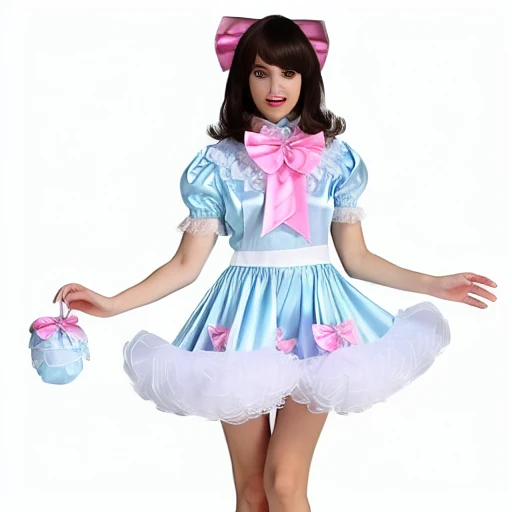 light blue shiny satin puffy dress, white lace peter pan collar, light blue lace-trimmed puffy short sleeves, white lace, white lace trim, (white lace trim on puffy short sleeves), light blue short attached ribboned dress skirt, white (puffy petticoat), petticoat under dress, pink bows, pink large shiny satin bowtie