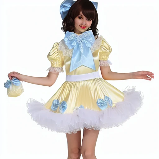 light yellow shiny satin puffy dress, white lace peter pan collar, light yellow lace-trimmed puffy short sleeves, white lace, white lace trim, (white lace trim on puffy short sleeves), light yellow short attached ribboned dress skirt, white (puffy petticoat), petticoat under dress, blue bows, blue large shiny satin bowtie