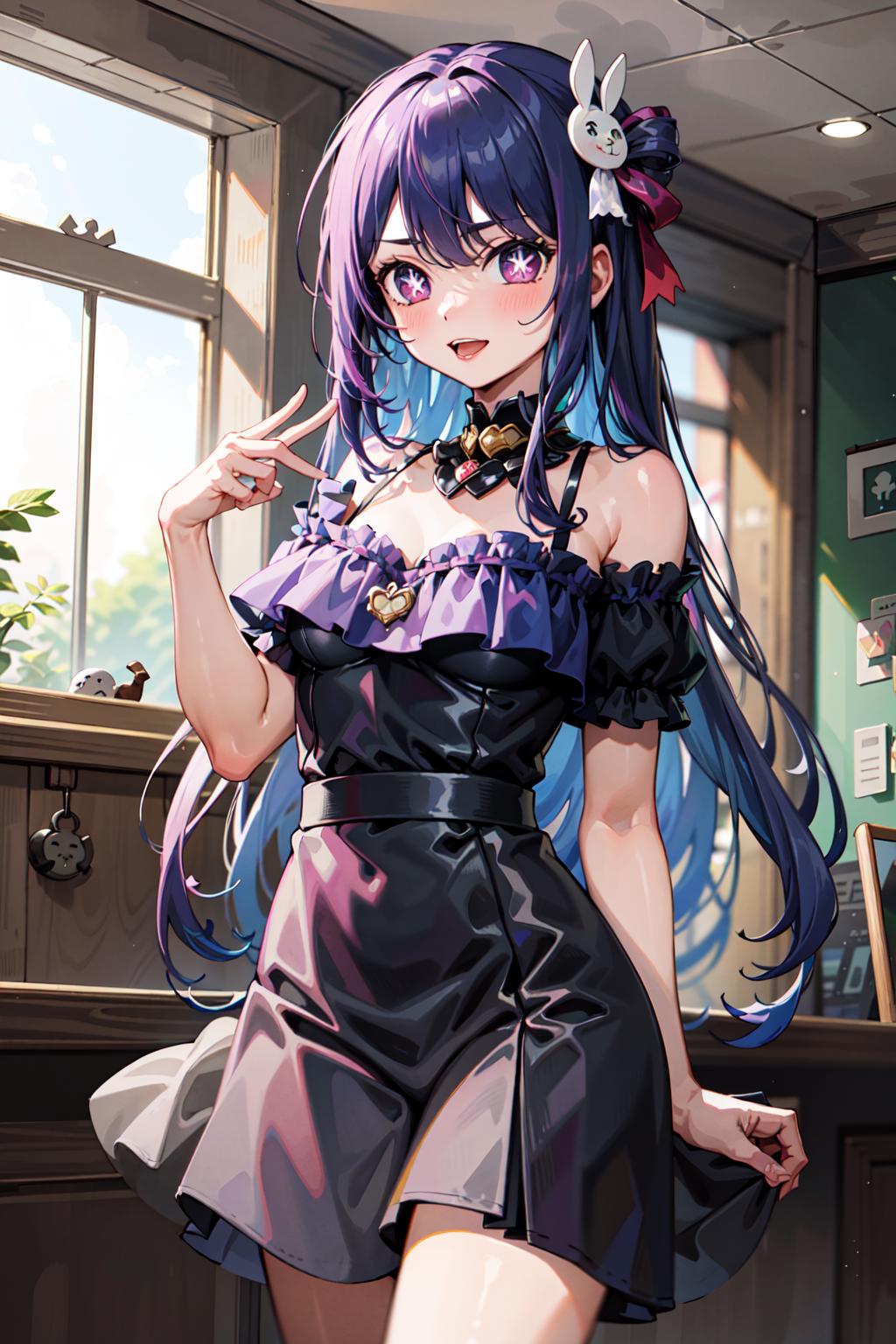 No activation is required, but adding hoshino_ai to the start of your prompt will pretty reliably reinforce Ai's key features. (ie, dark purple hair, pink streaks, the general shape of the bangs, ect.) For her idol costume refer to the showcase. (no special effort was made to train specific costumes)