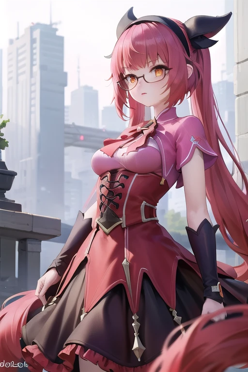 appearance : red hair, orange eyes, very long hair, hair bow, glasses, black hairband, twintails, medium breasts