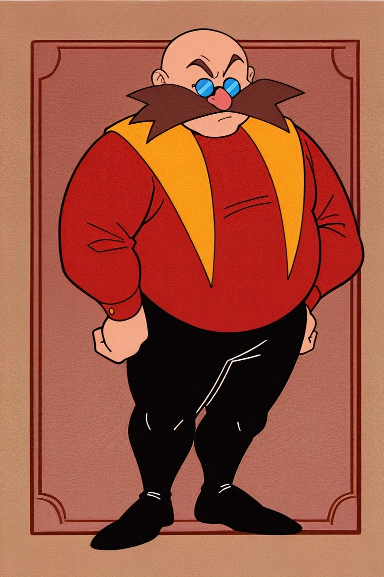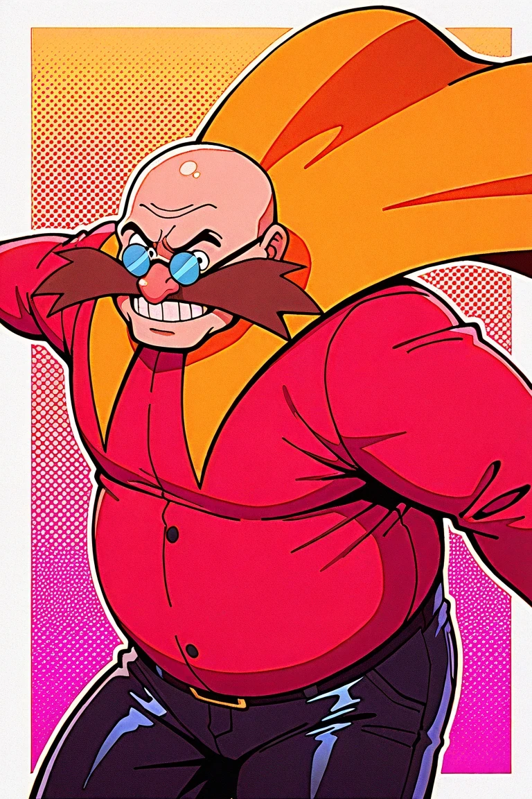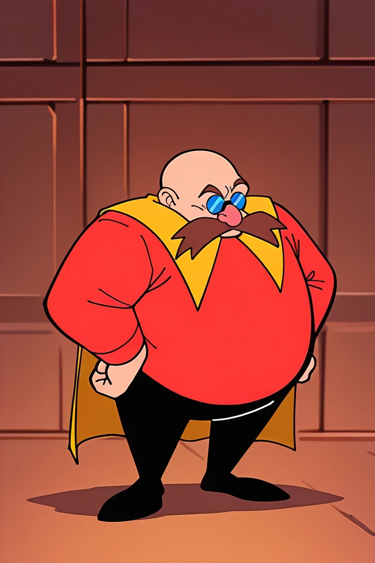 DrEggmanOVA, 1boy, red shirt, yellow cape, black leggings, round body, chubby, bald, bushy brown mustache, blue glasses, distinct pink nose,