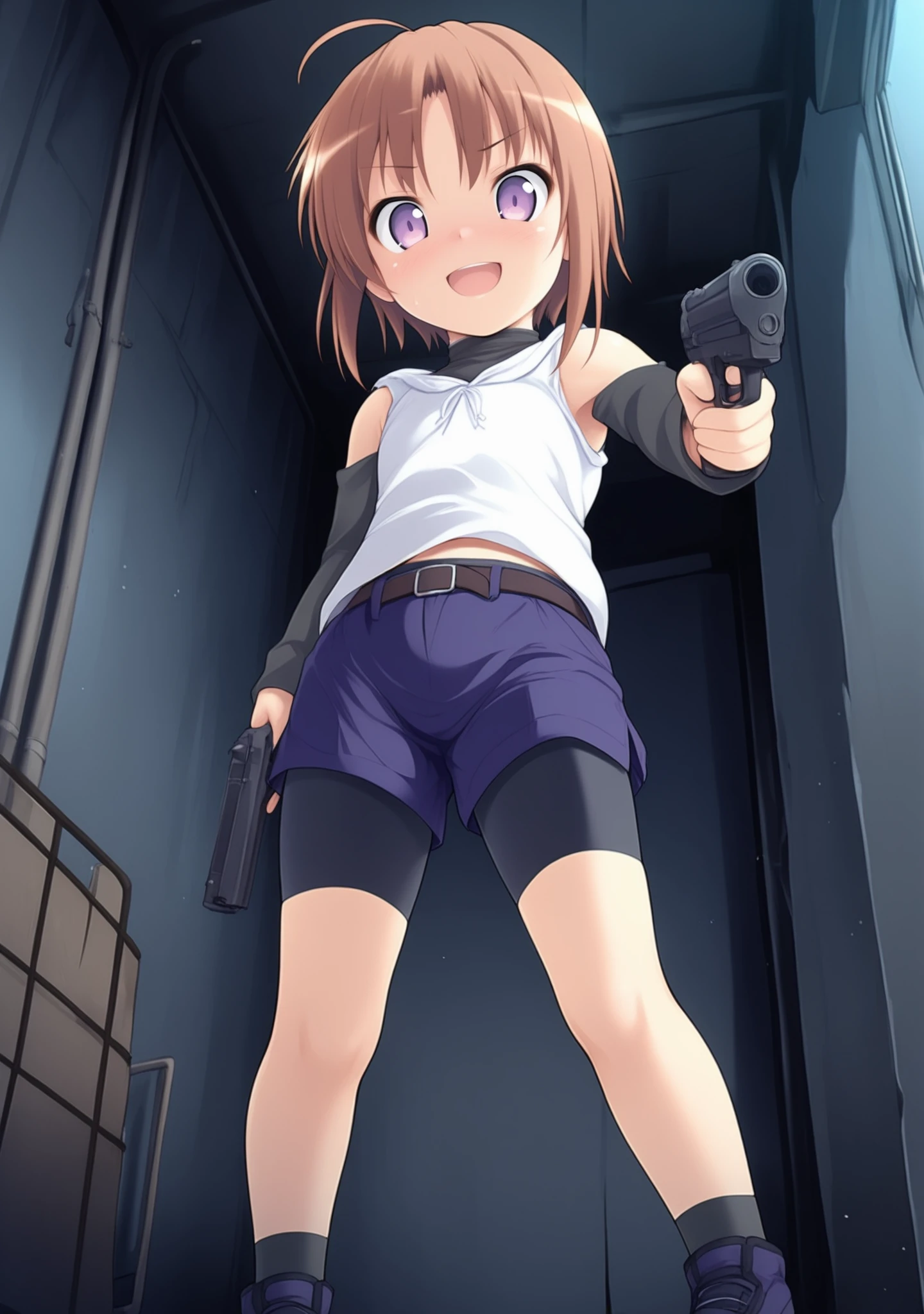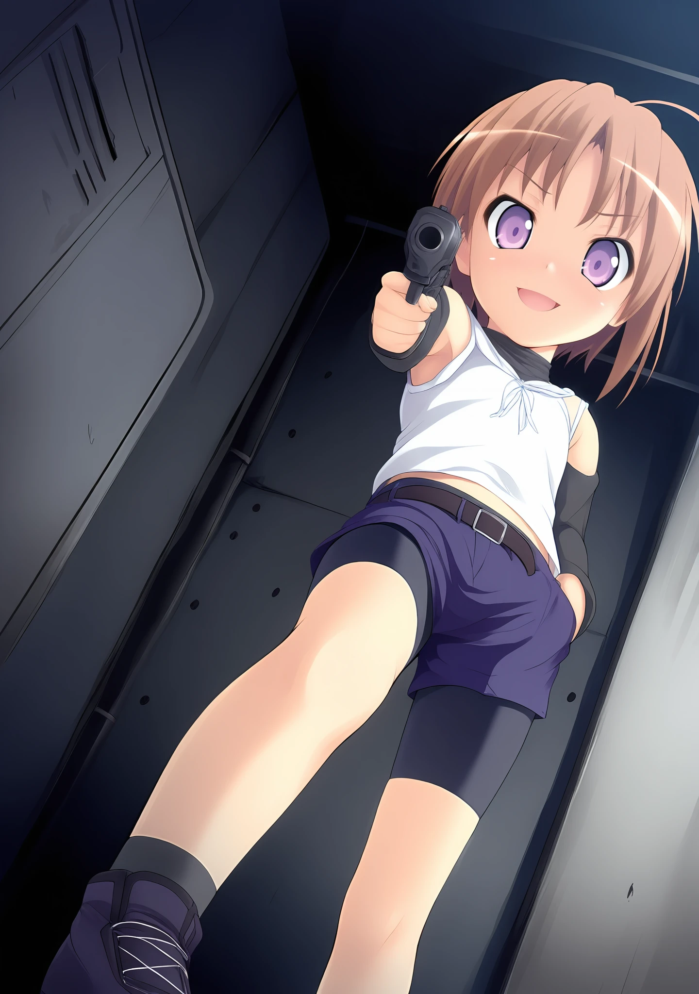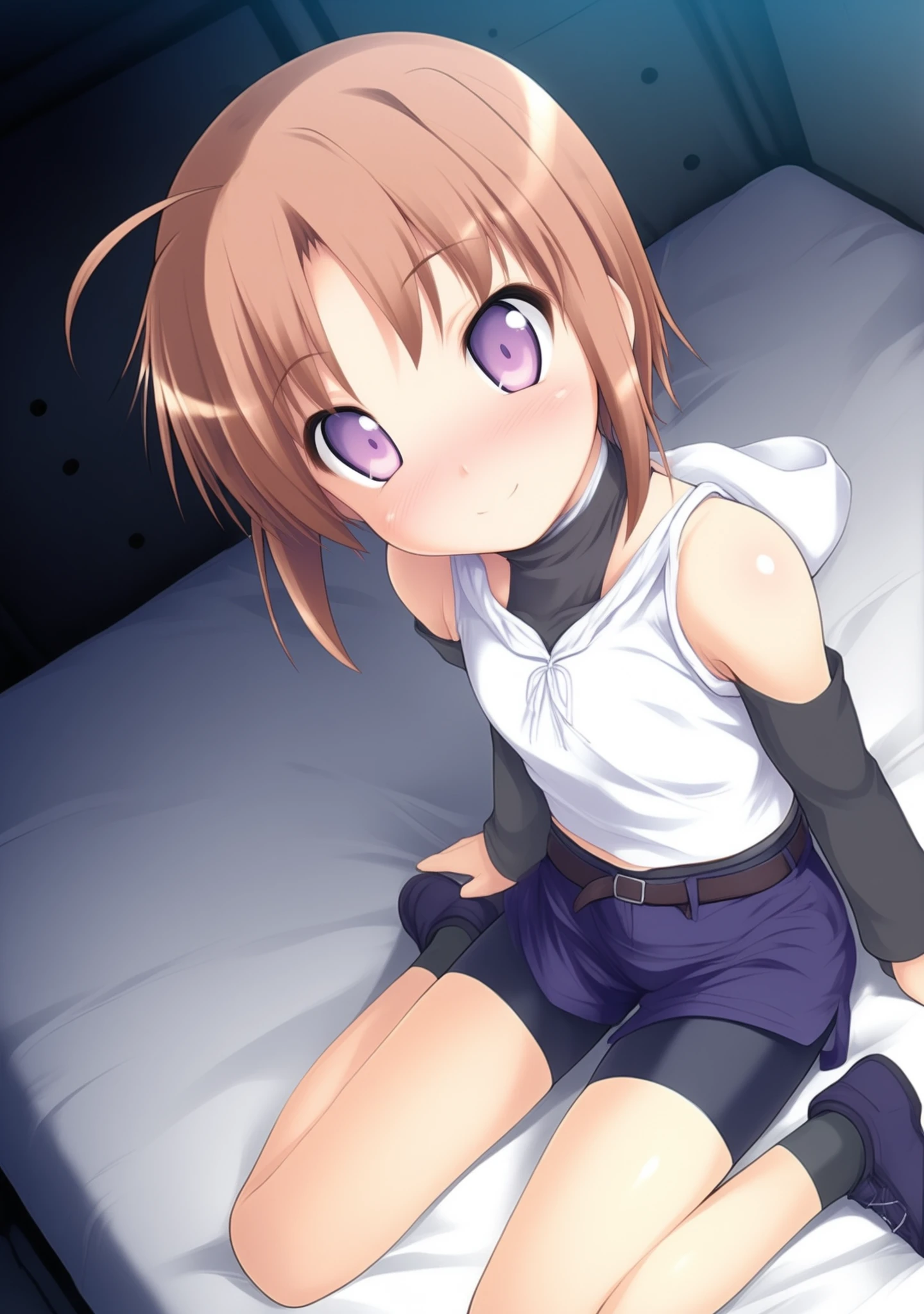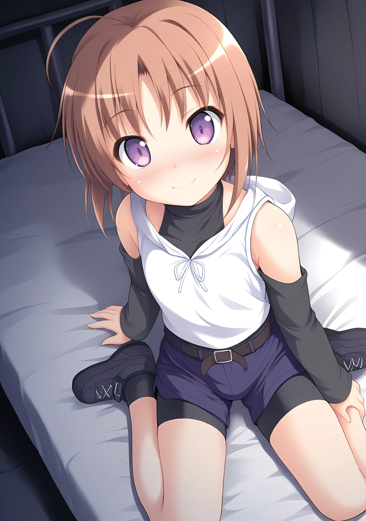 trigger:karin-sg,ahoge,bare shoulders,belt,bike shorts,bike shorts under shorts,black socks,blue shorts,brown hair,detached sleeves,long sleeves,purple eyes,shoes,short hair,sleeveless hoodie,turtleneck,