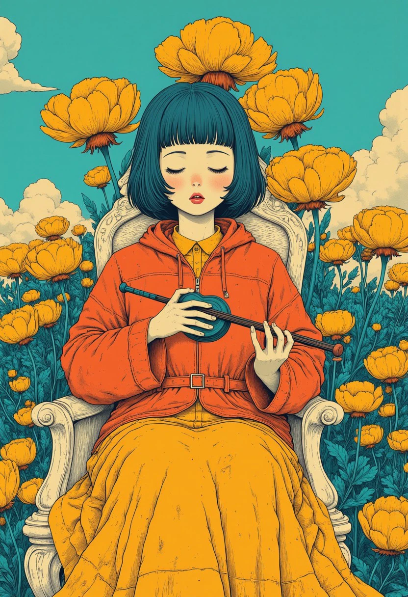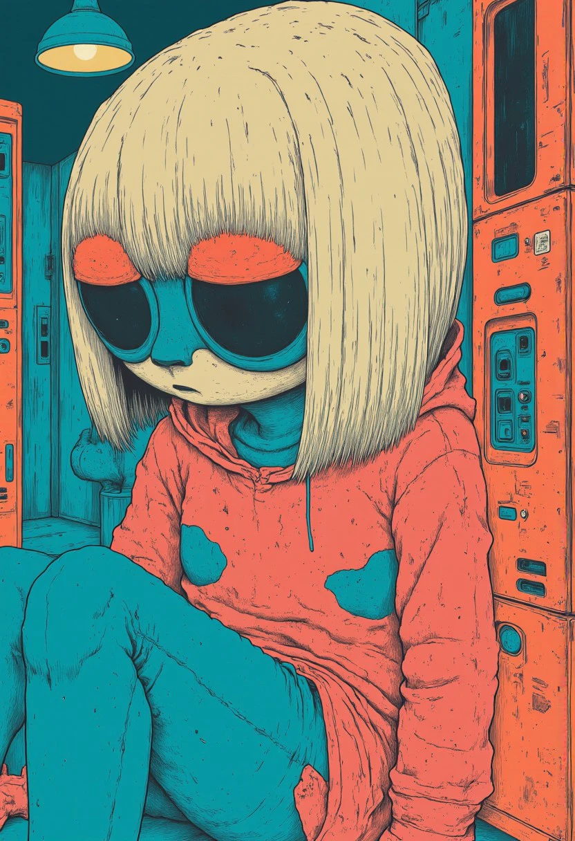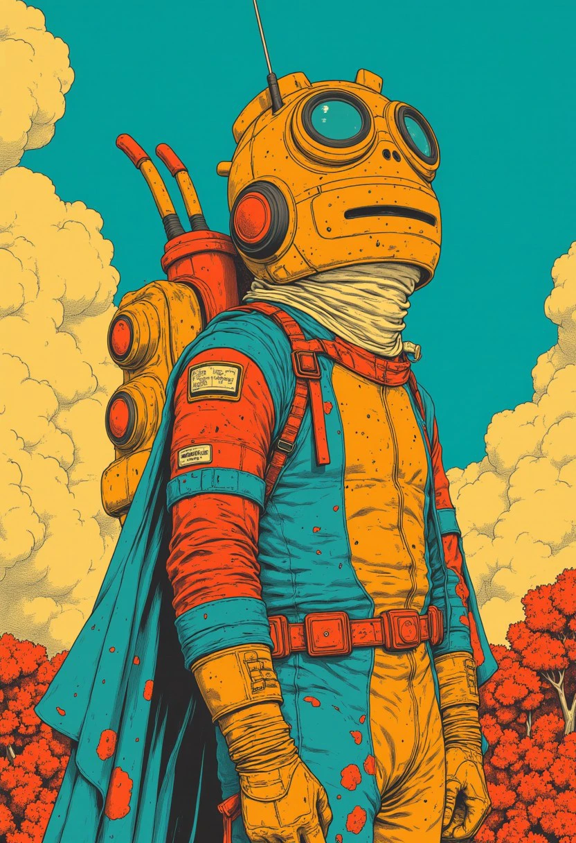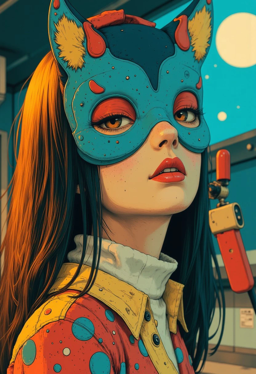 This version is clearly over-trained with artifacts like cat, googles or skull but at least it goes in the right direction. This is a 'teal/orange/red simple anime' style. Flat colors with black linework drawing.