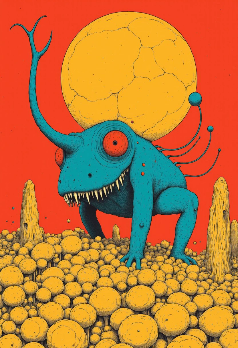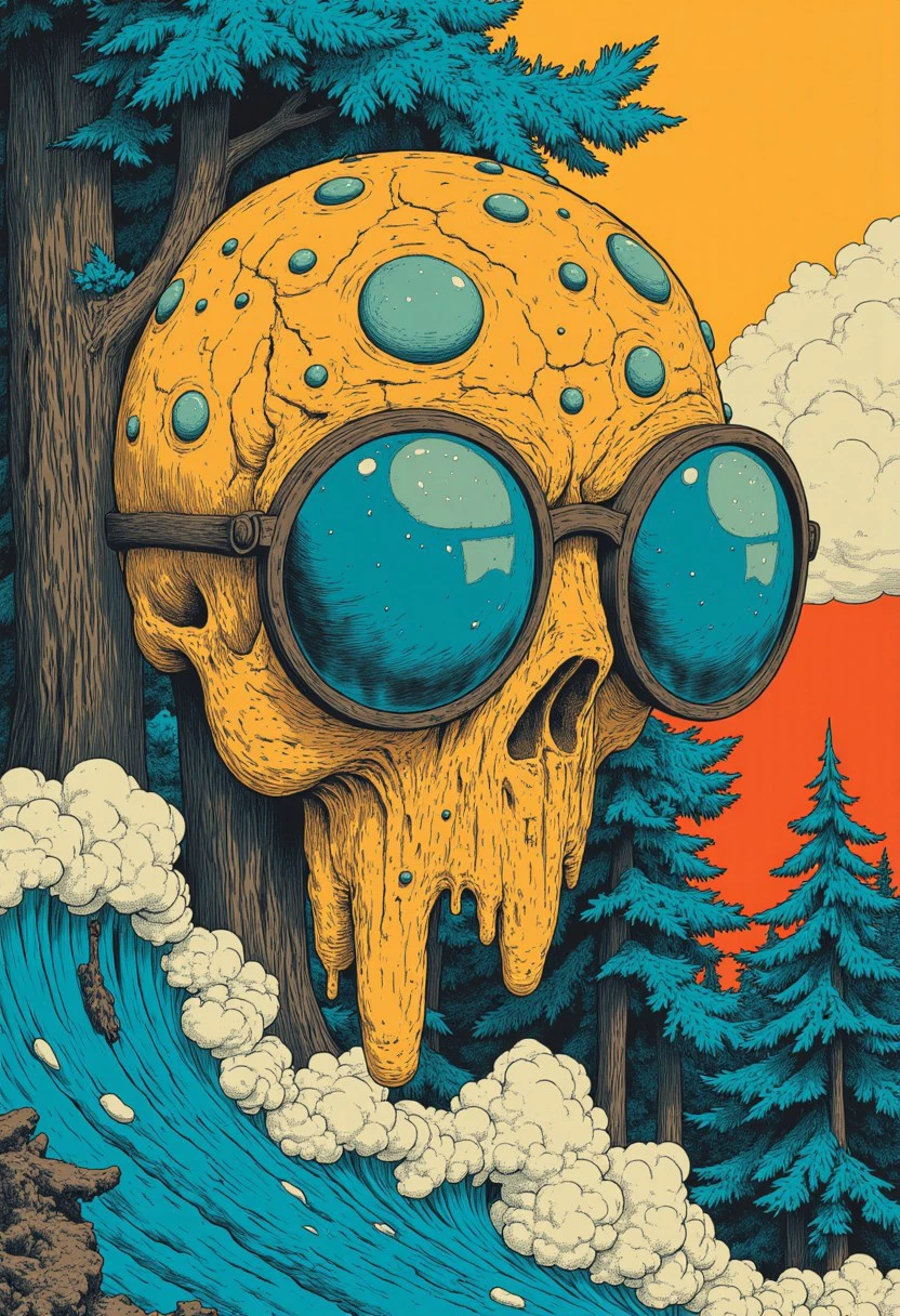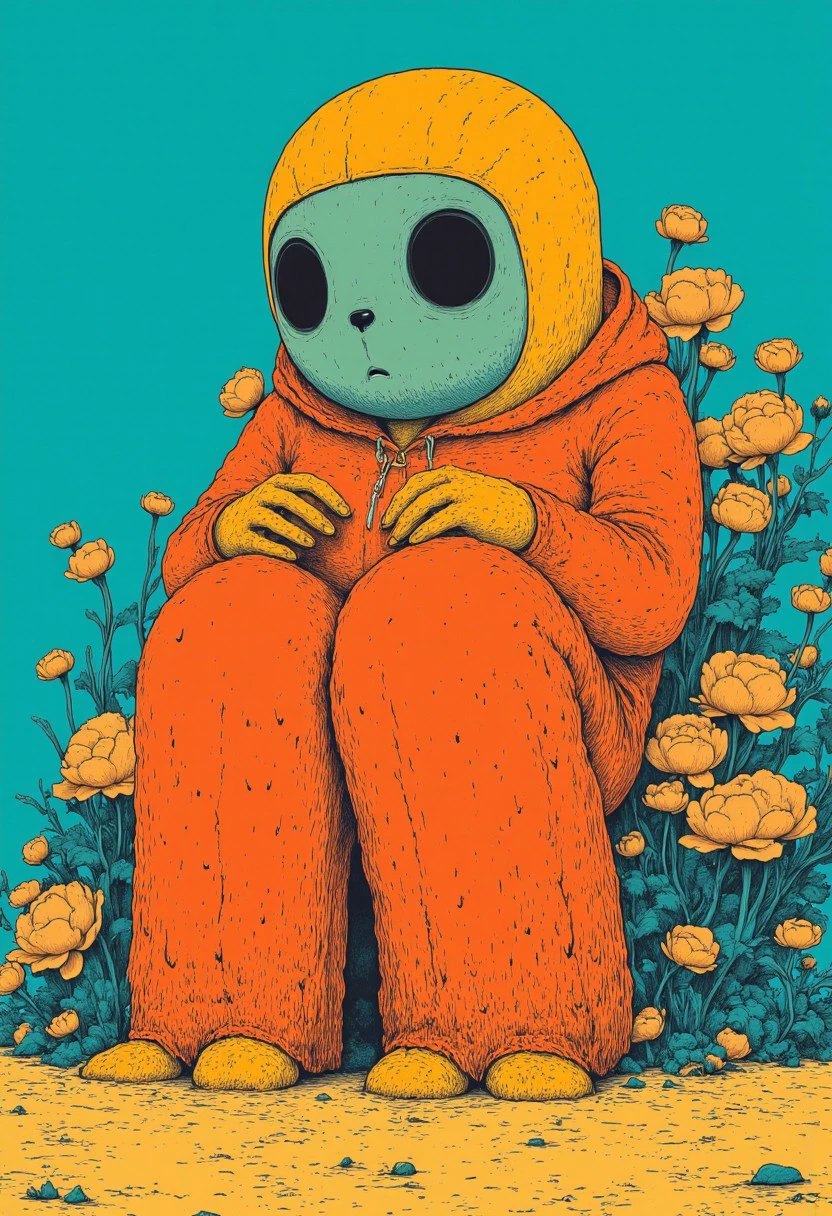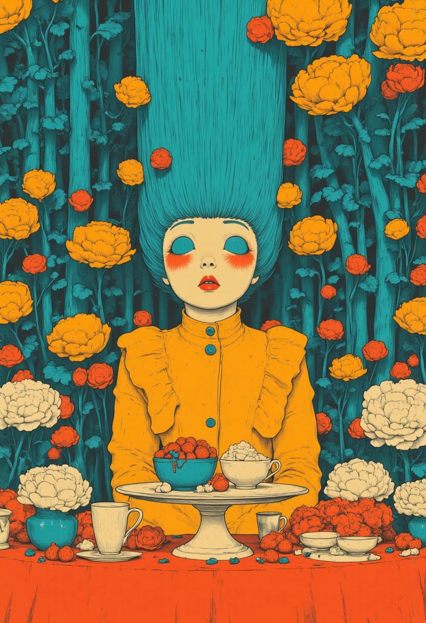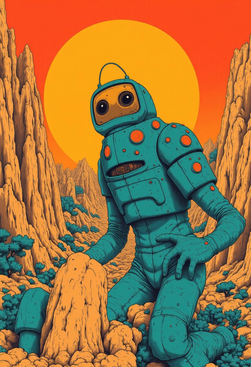 This version is clearly over-trained with artifacts like cat, googles or skull but at least it goes in the right direction. This is a 'teal/orange/red simple anime' style. Flat colors with black linework drawing.
