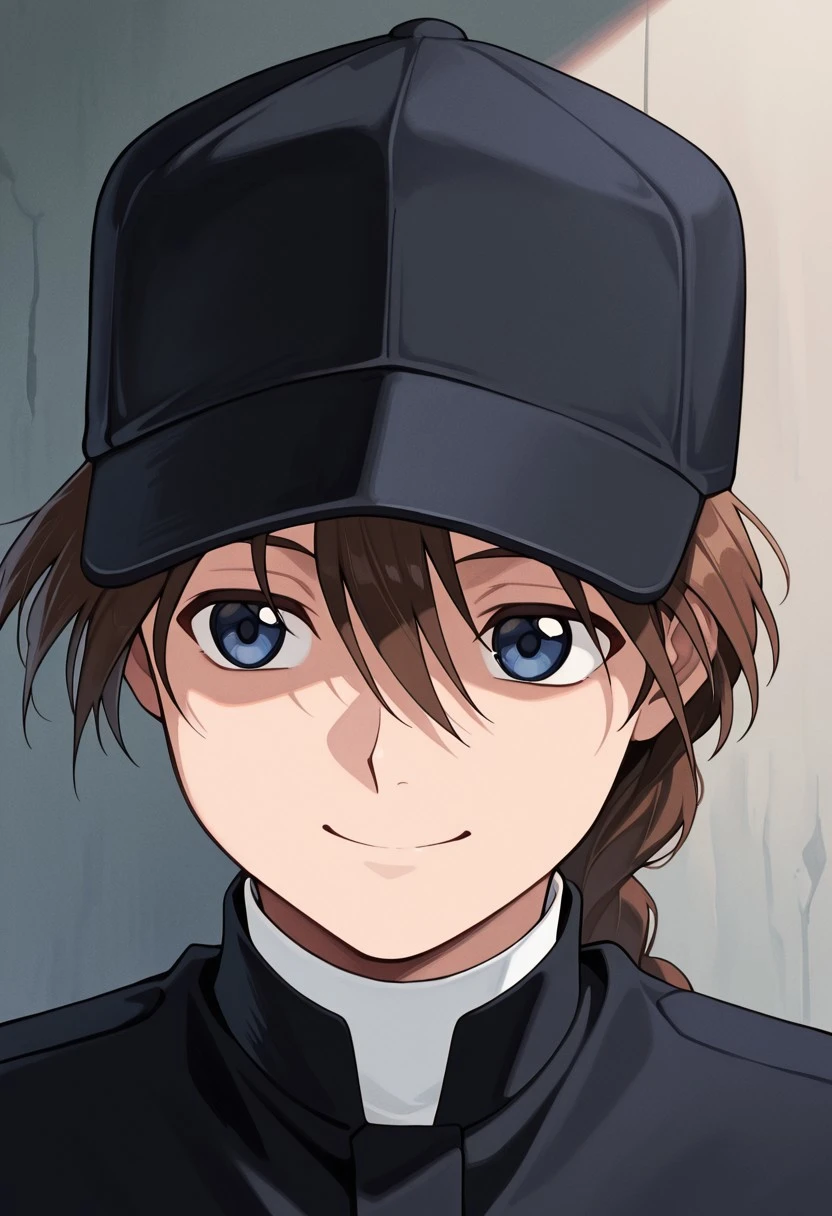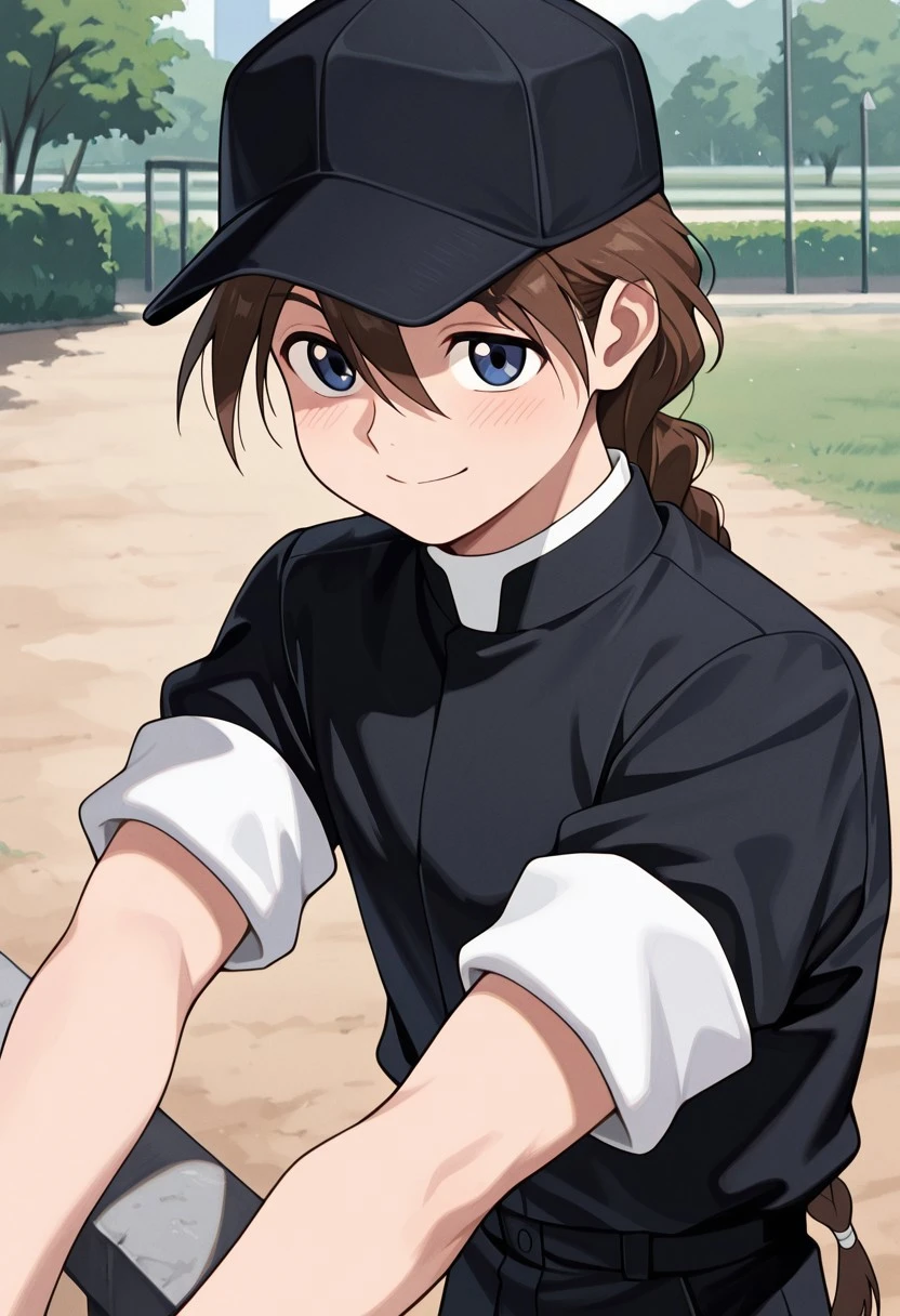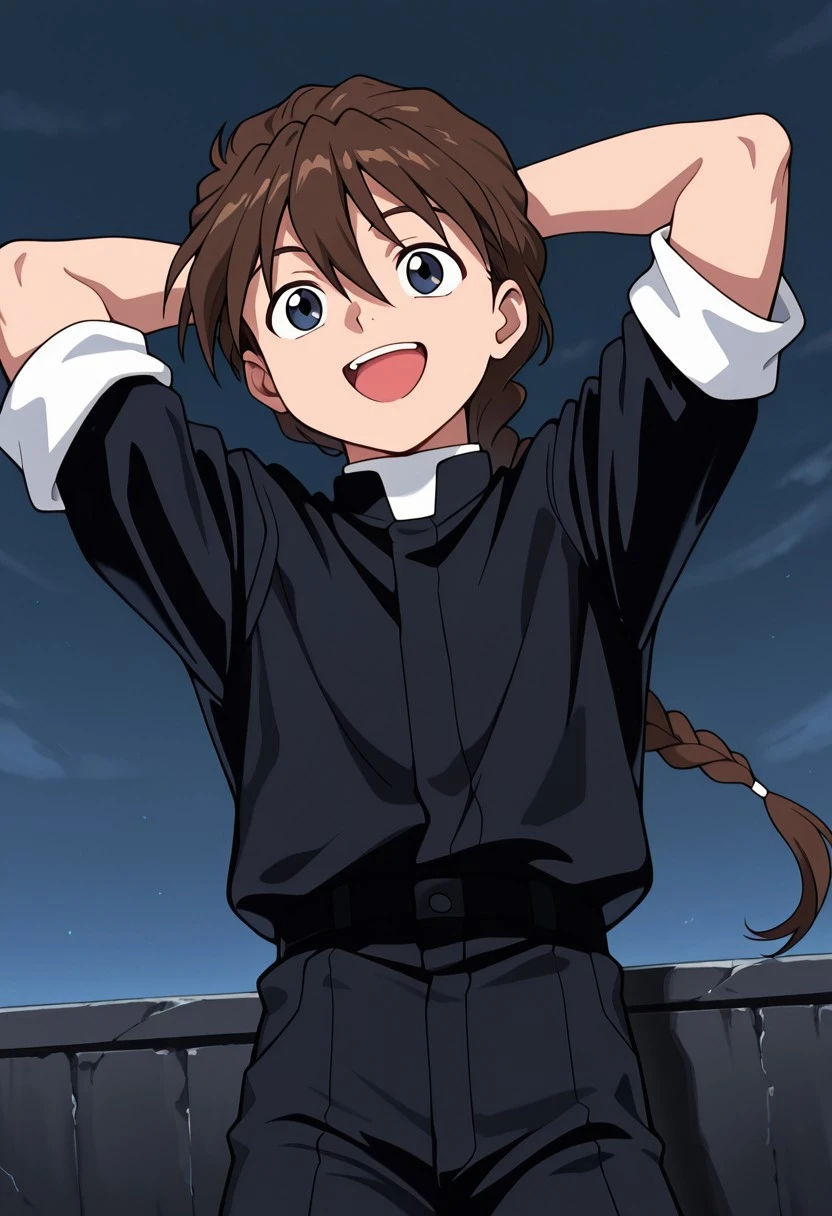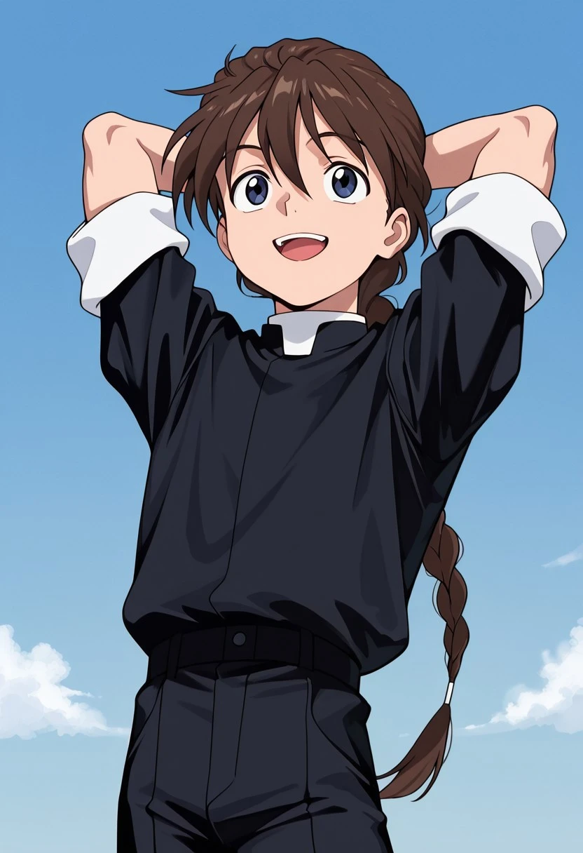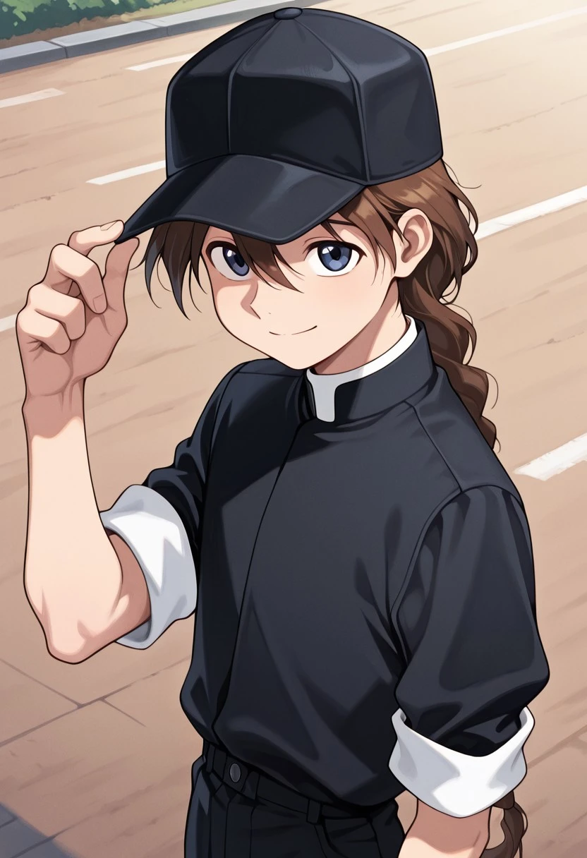 DyuoMakkusu, 1boy, male focus, solo, blue eyes, brown hair, single braid, baseball cap, black headwear, black jacket, clerical collar, sleeves rolled up, black pants, shoes, black footwear,