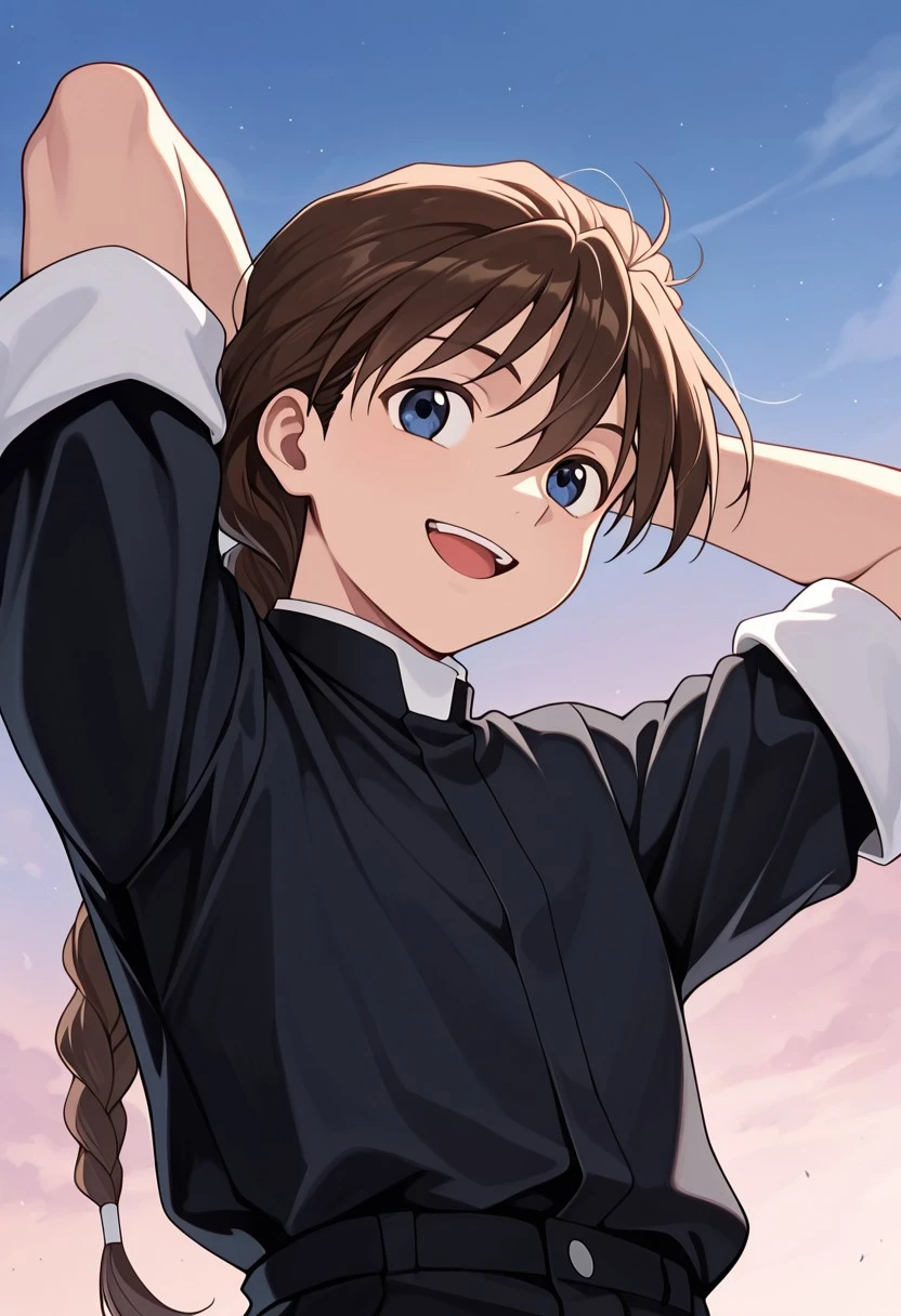 duomaxwell, 1boy, male focus, brown hair, braid, single braid, long hair, very long hair, blue eyes, shirt, black shirt, sleeves rolled up, belt, black pants, priest collar