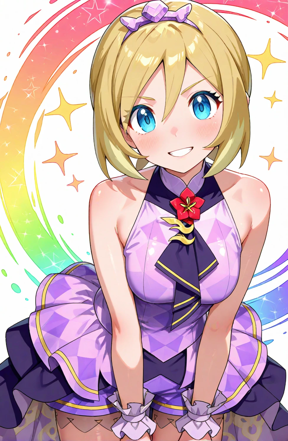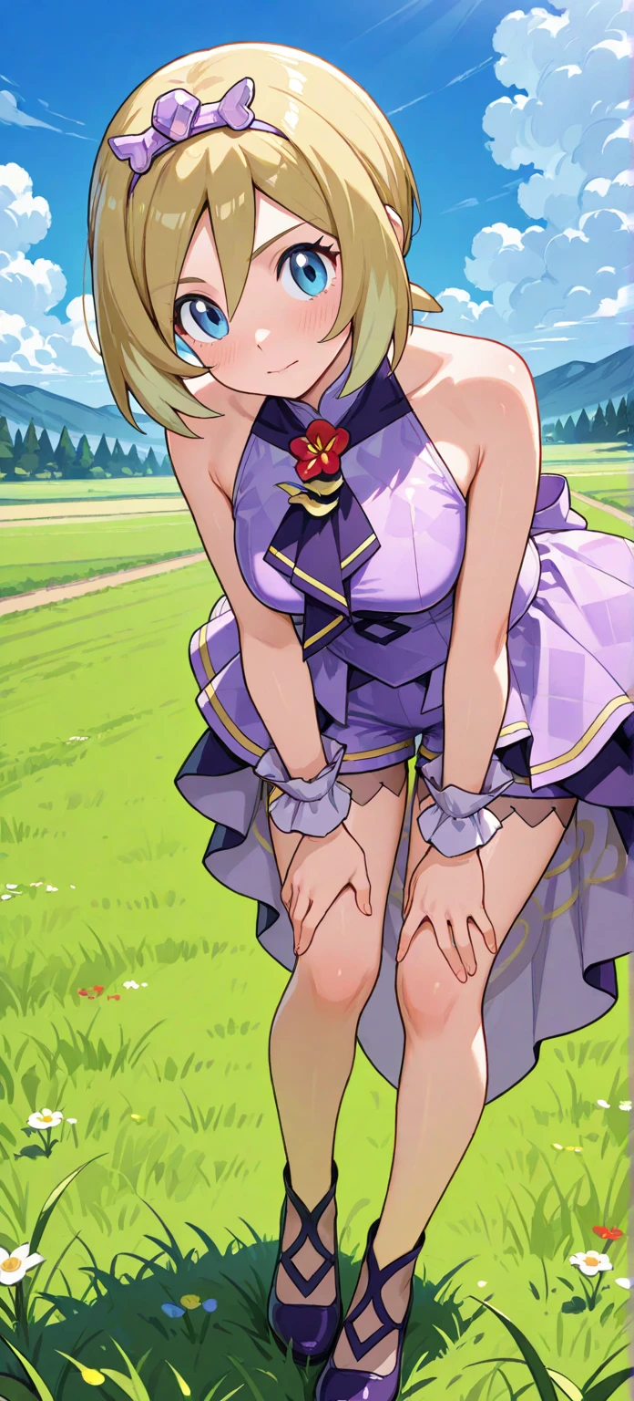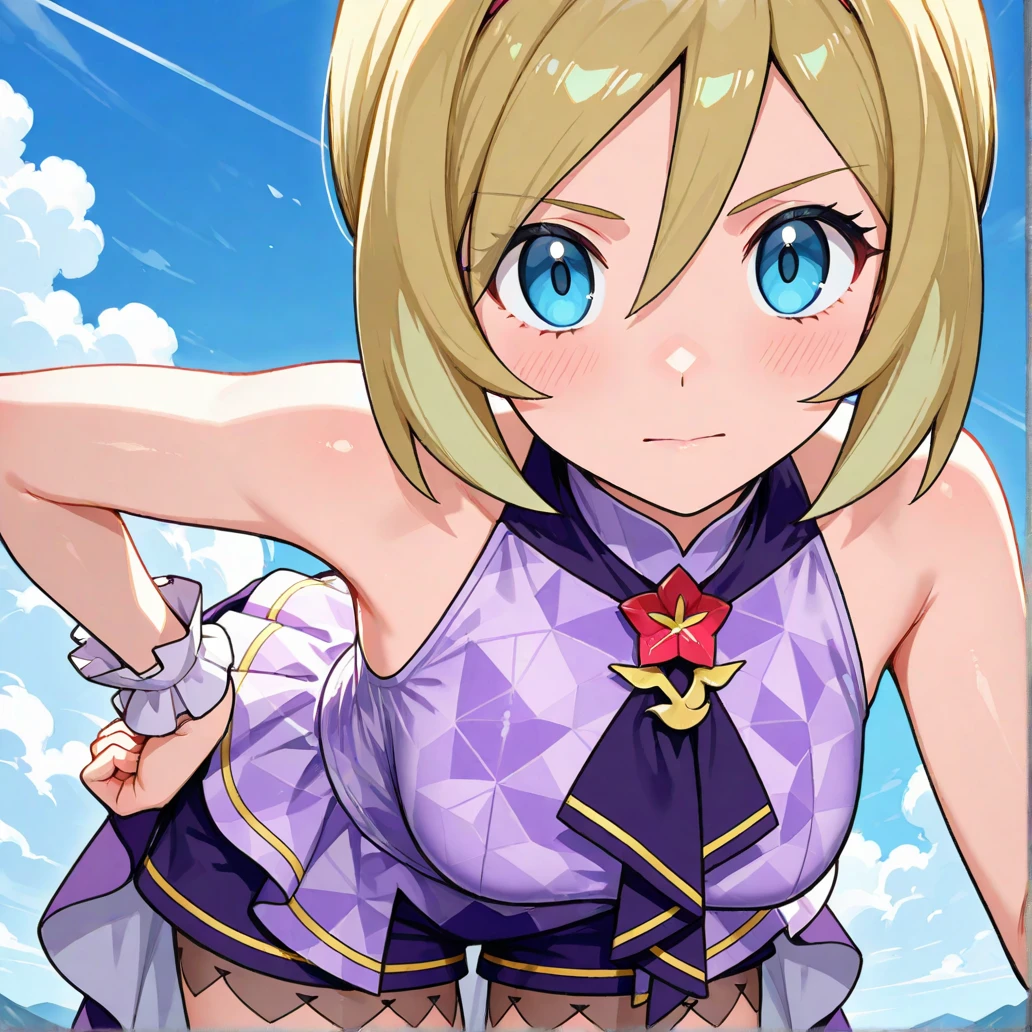 annirida, aged up, irida \(pokemon\), blonde hair, blue eyes, short hair, hair between eyes