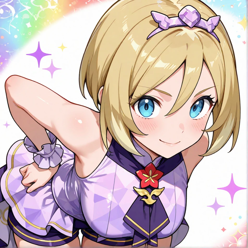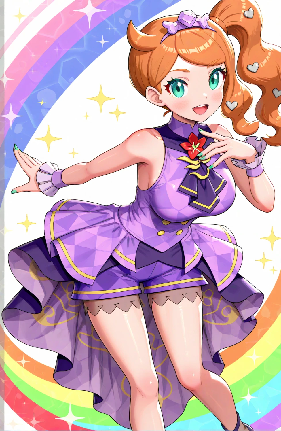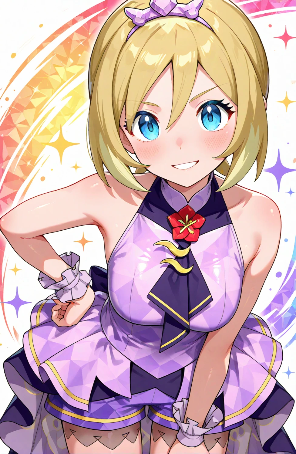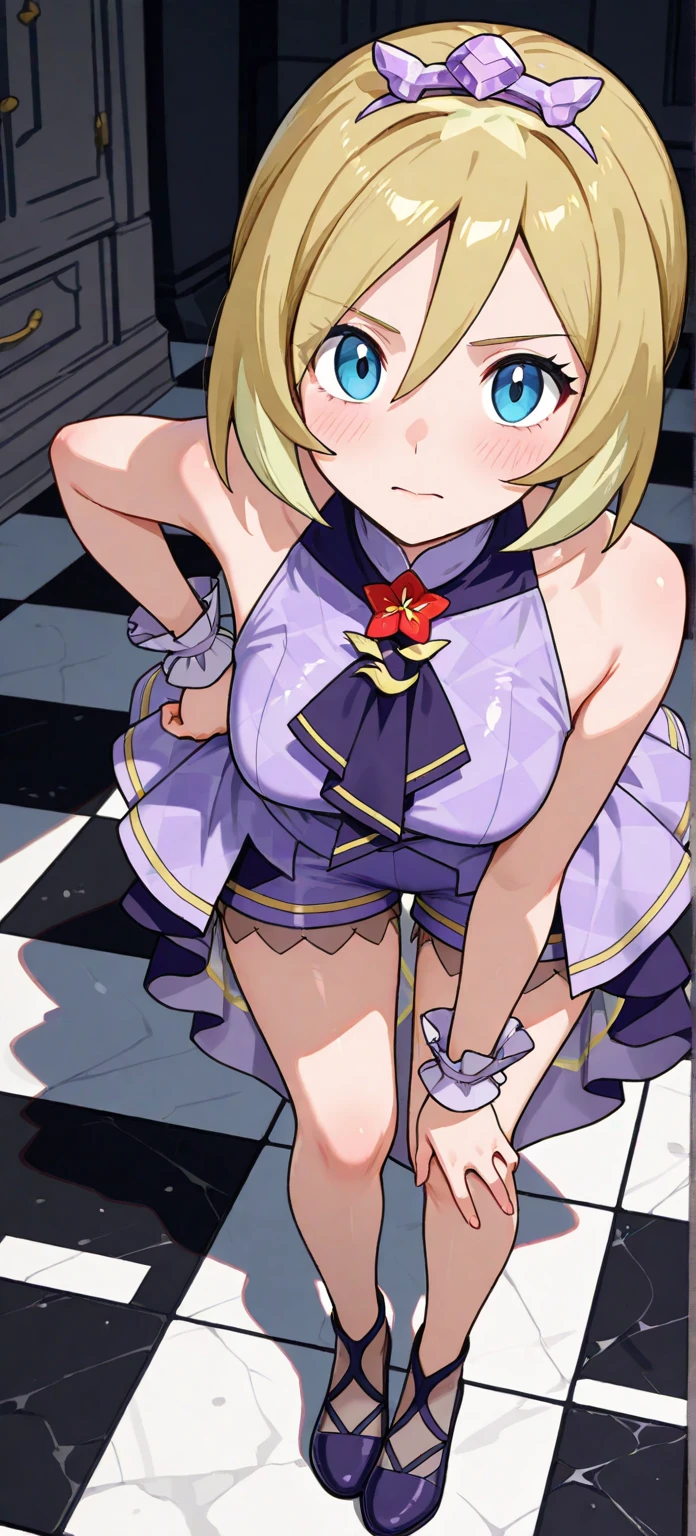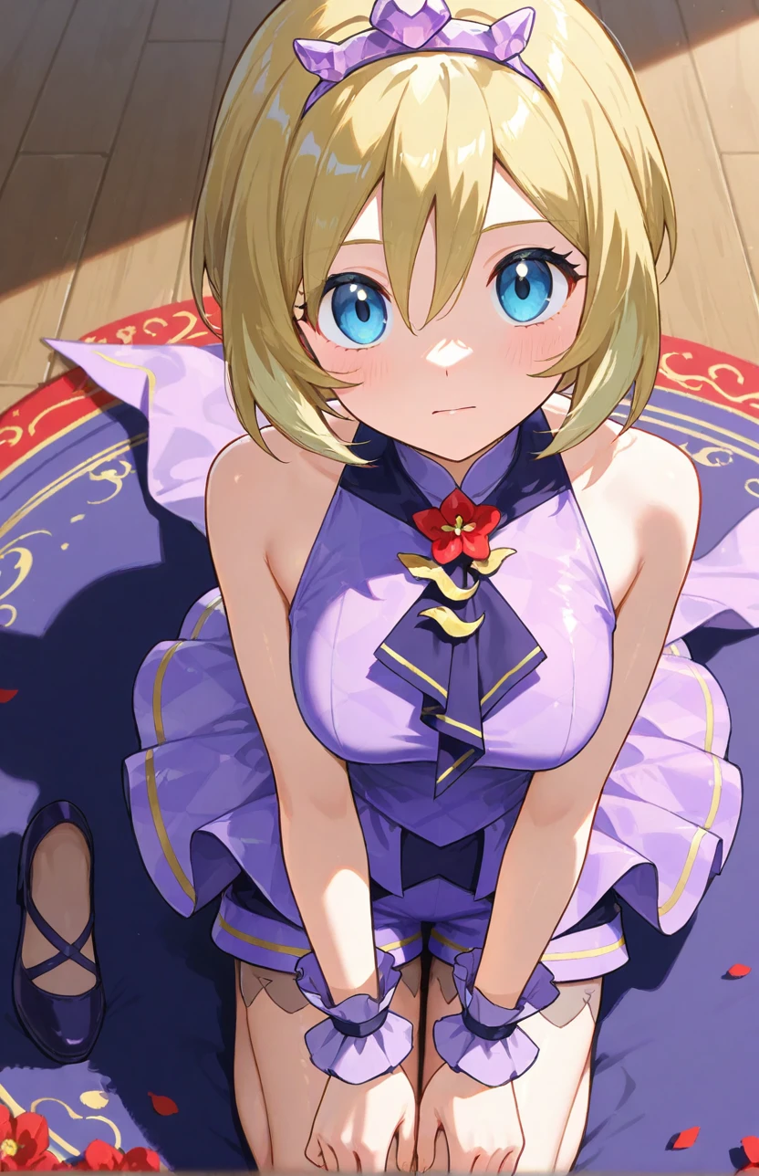 jewelry, tiara, purple ascot, sleeveless dress, purple dress, wrist cuffs, shorts under dress, purple shorts, shoes, purple footwear