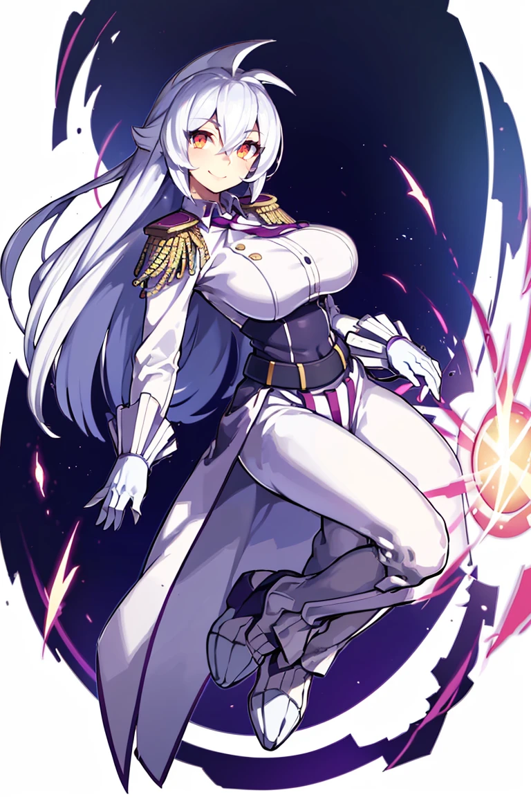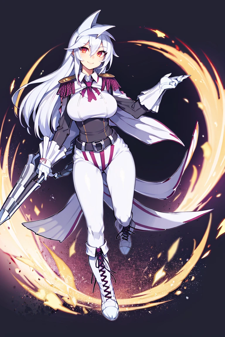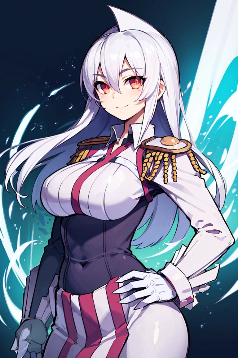 1girl, energy, eye trail, glint, glowing, glowing eyes, smile, big breasts, epaulettes, gloves, long sleeves, personification, red eyes, long hair,