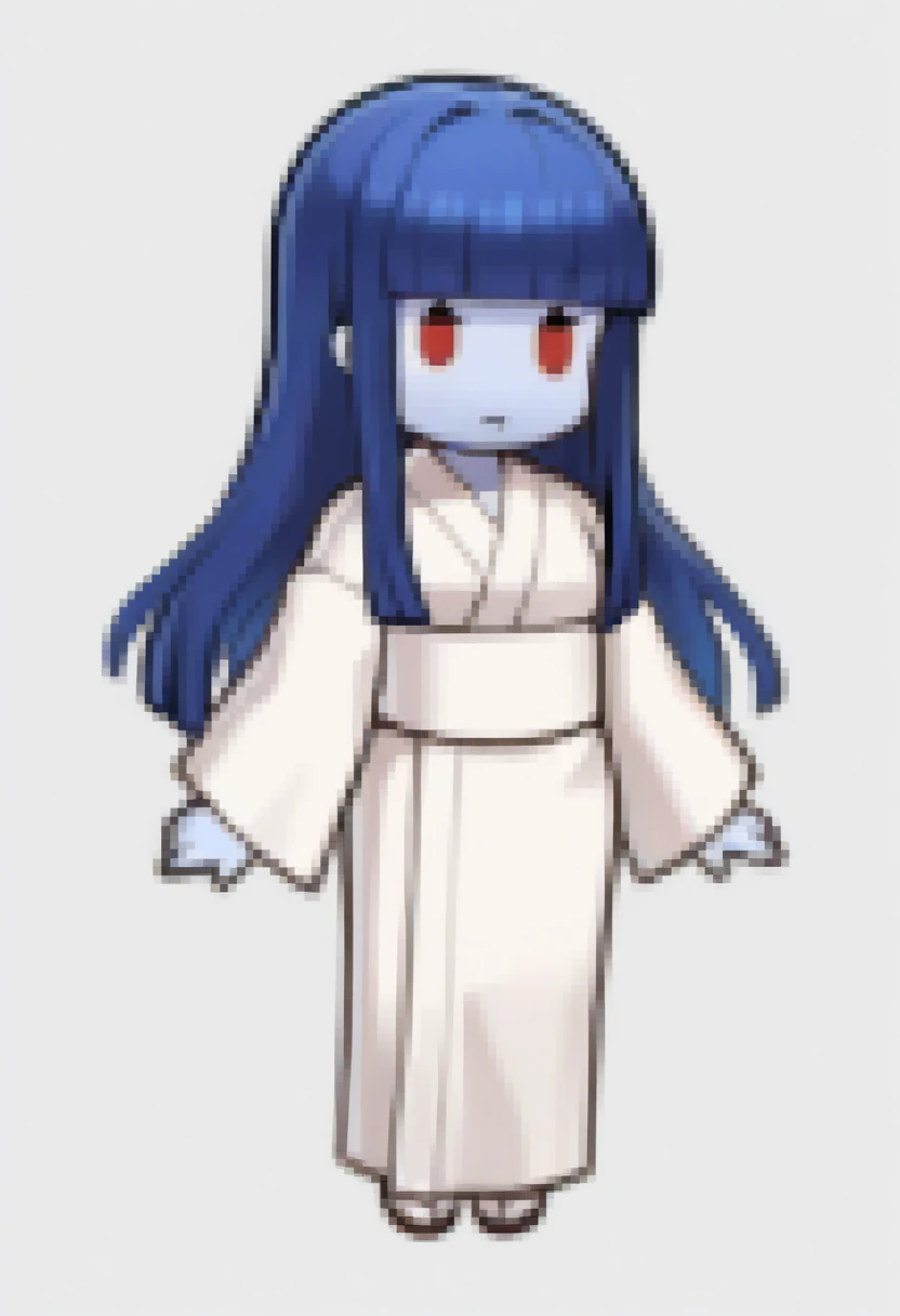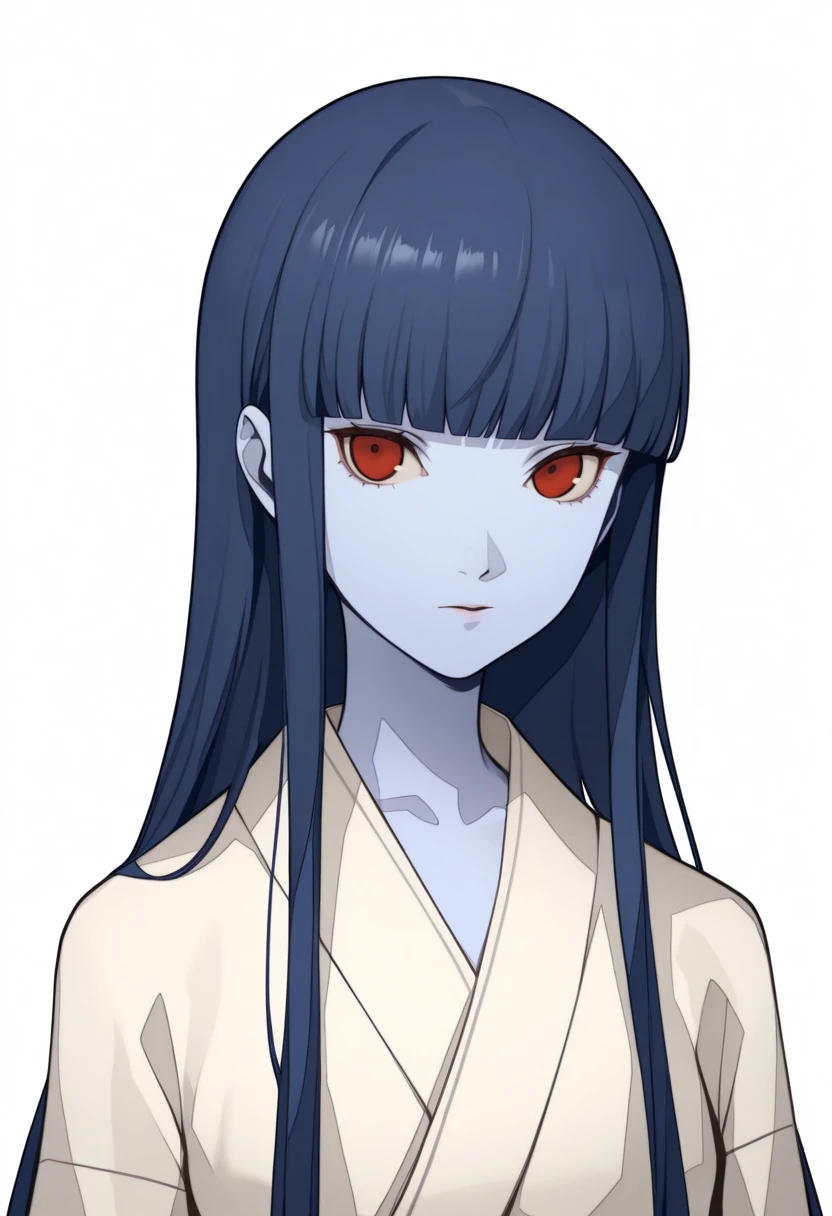 yuk1jy0rousmt, colored skin, blue skin, long hair, blunt bangs, blue hair, red eyes, white kimono,