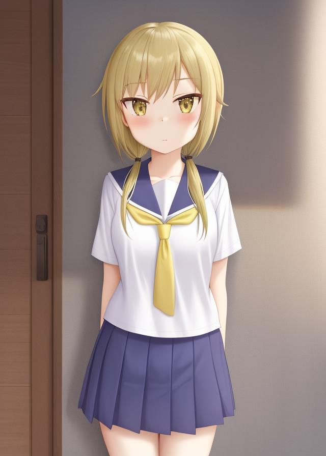 1girl, solo, long hair, blonde hair, twintails, school uniform, yellow eyes, pleated skirt, serafuku, low twintails, blue sailor collar
