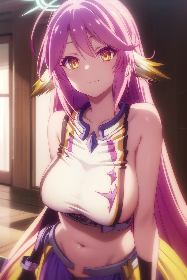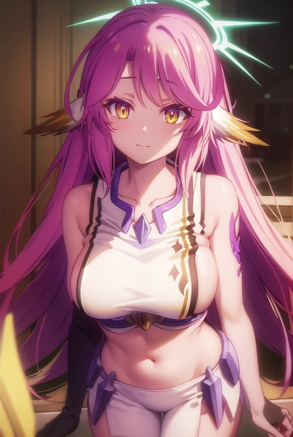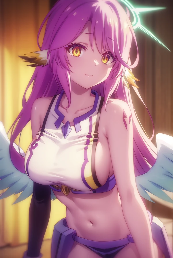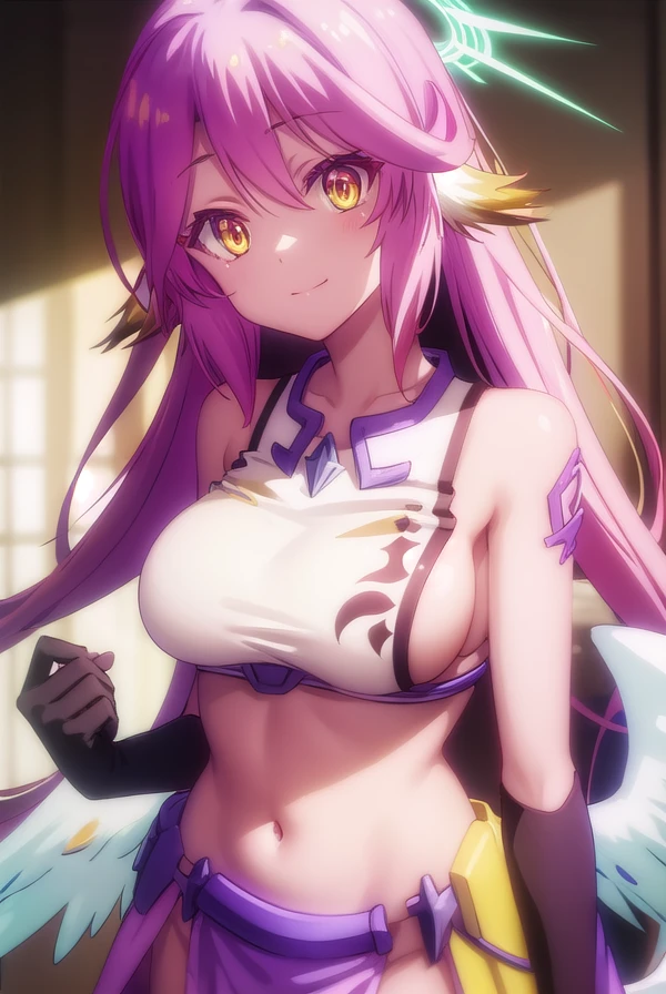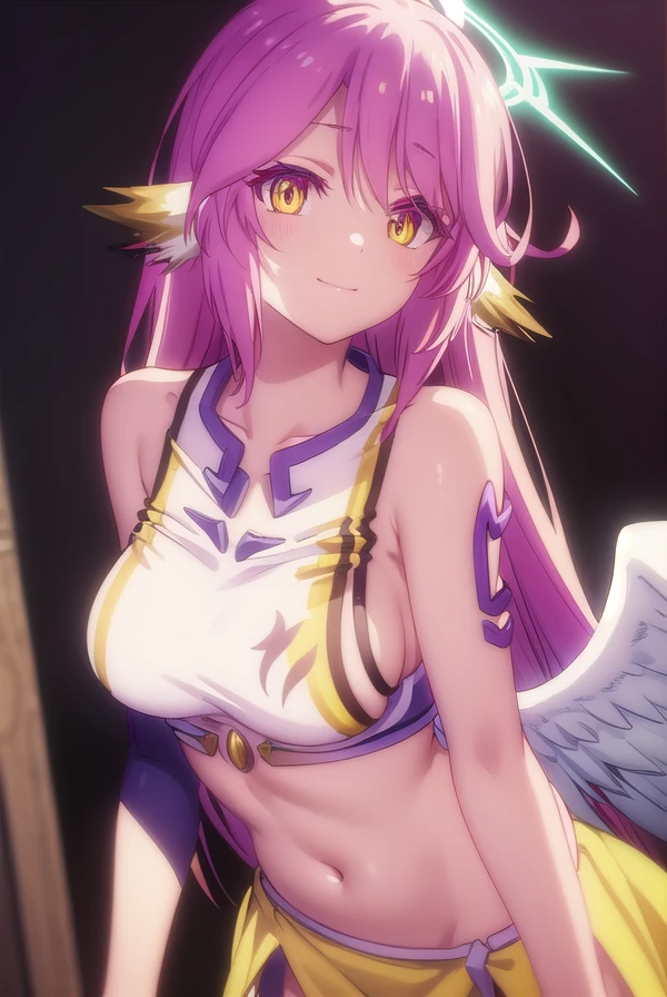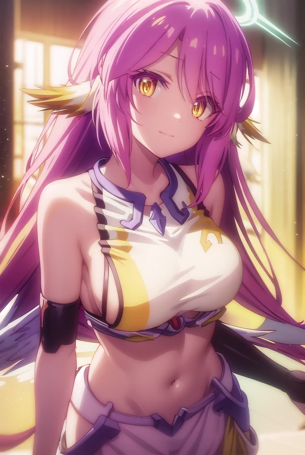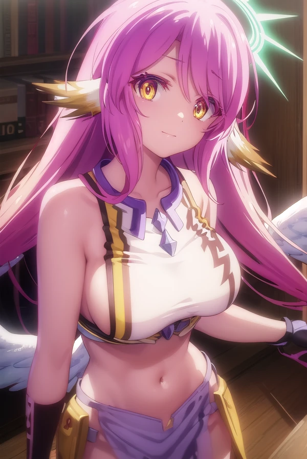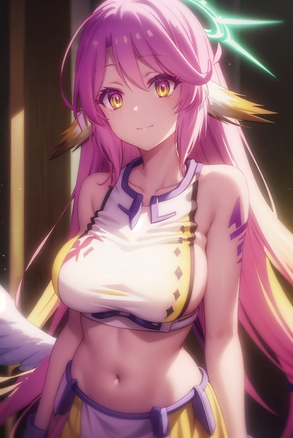 jibril, angel, angel wings, animal ears, bird ears, compass rose halo, feathered wings, feathers, gradient hair, halo, long hair, low wings, multicolored hair, navel, pink hair, symbol-shaped pupils, tattoo, white wings, wing ears, wings, (yellow eyes:1.5),
