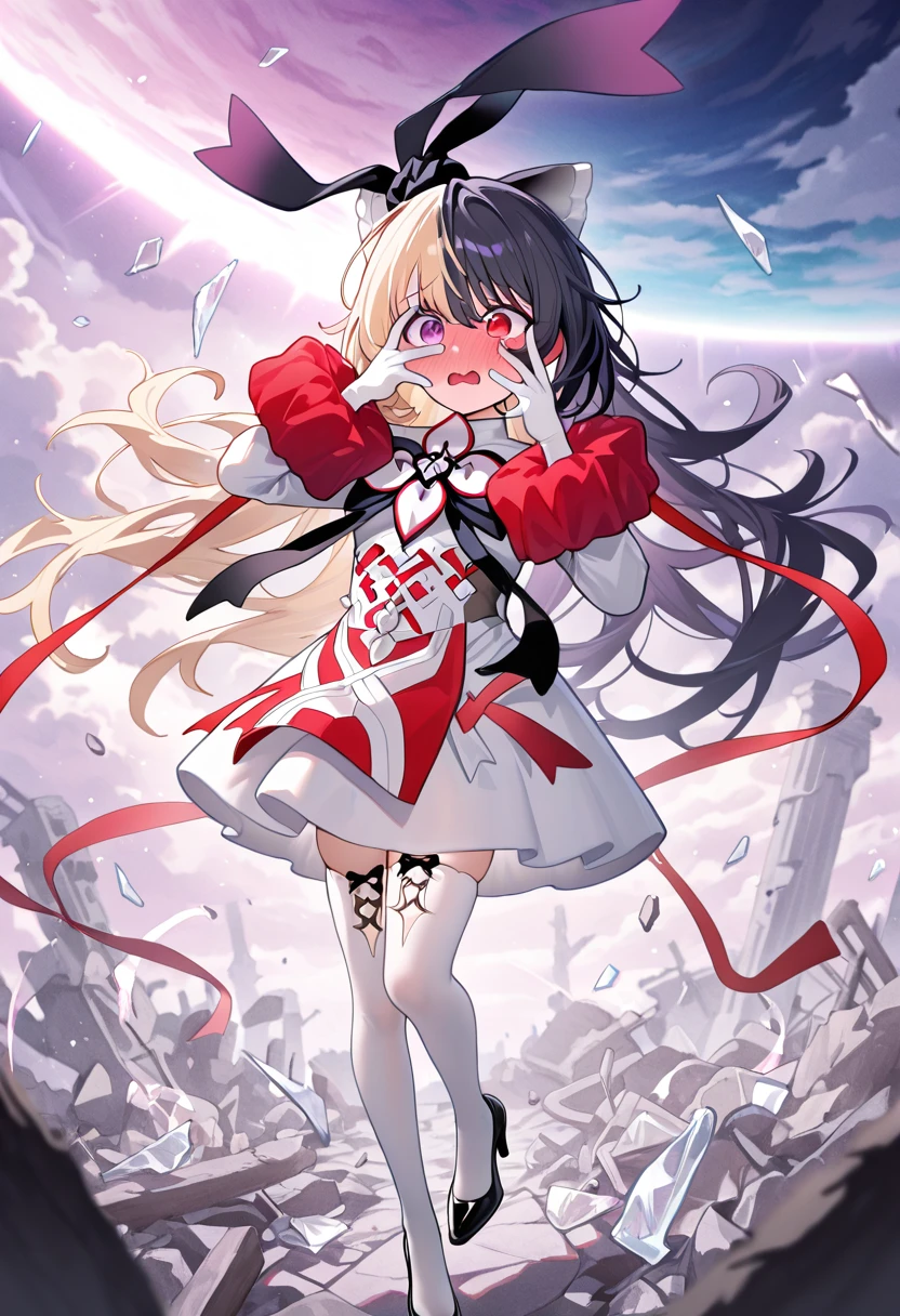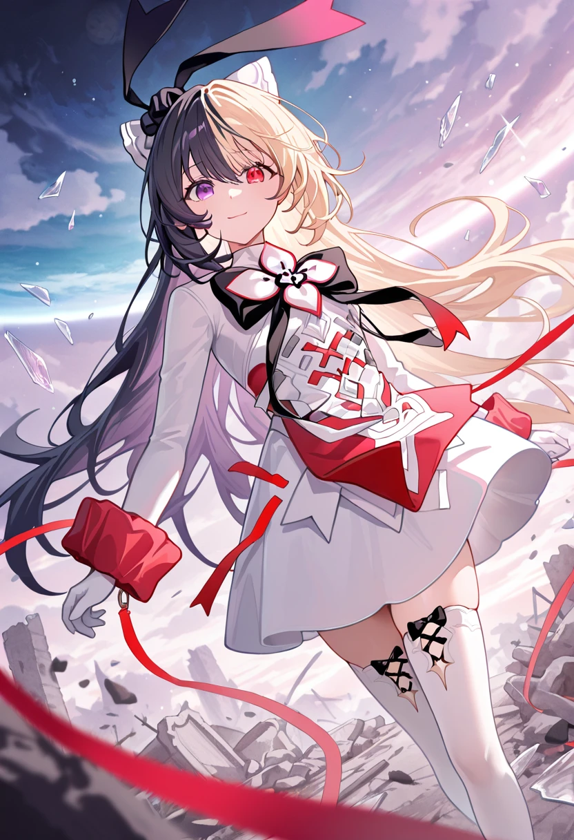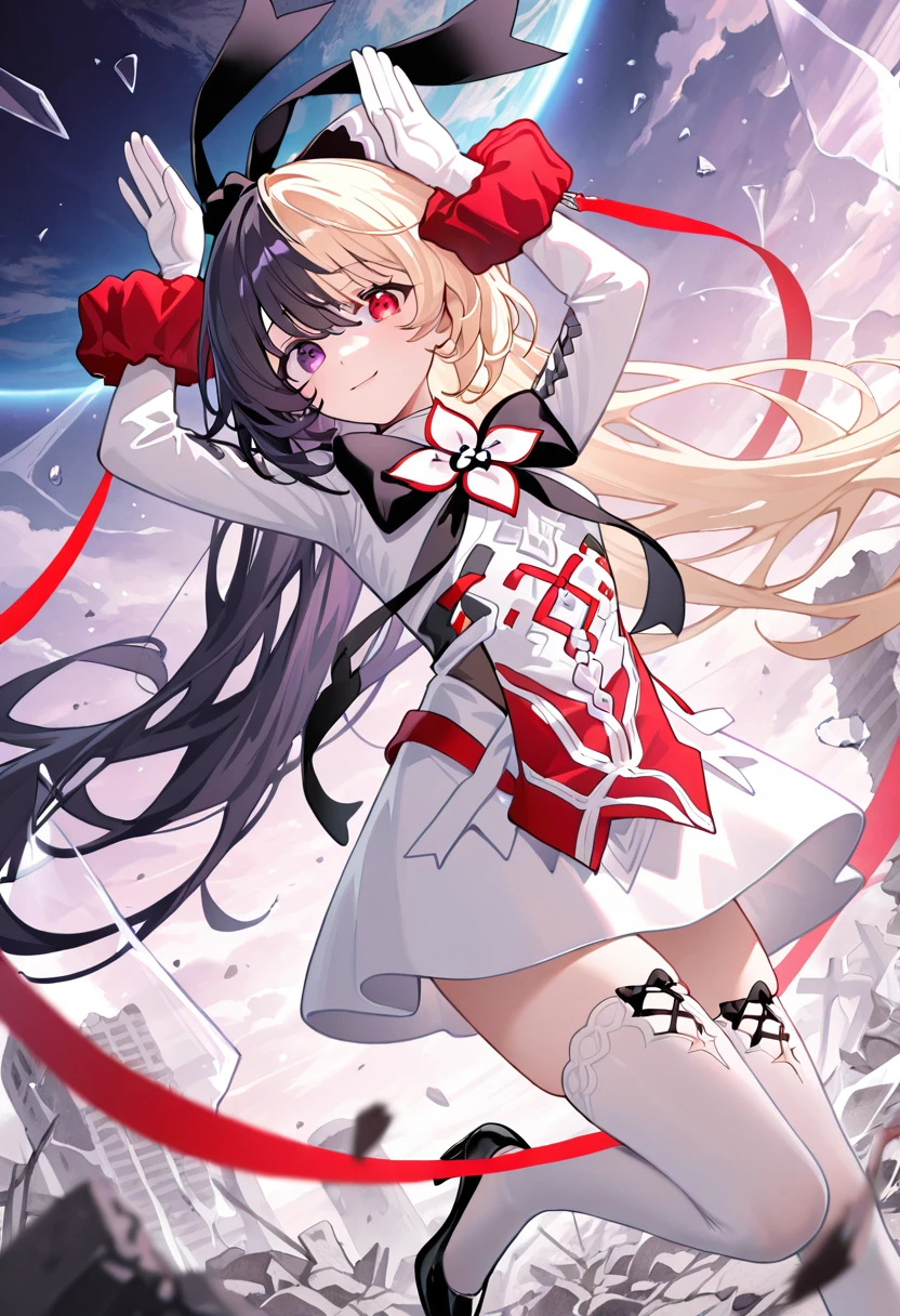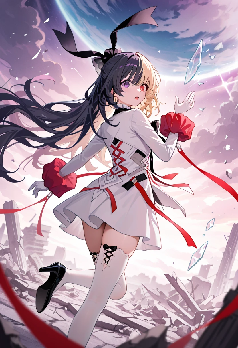 maya_arcaea,1girl,solo,two-tone hair,blonde hair,black hair,very long hair,heterochromia,red eyes,purple eyes,black hair ribbon,white dress,short dress,cross-laced clothes,long sleeves,white gloves,red ribbon,frilled sleeves,white thighhighs,high heels,black footwear,
