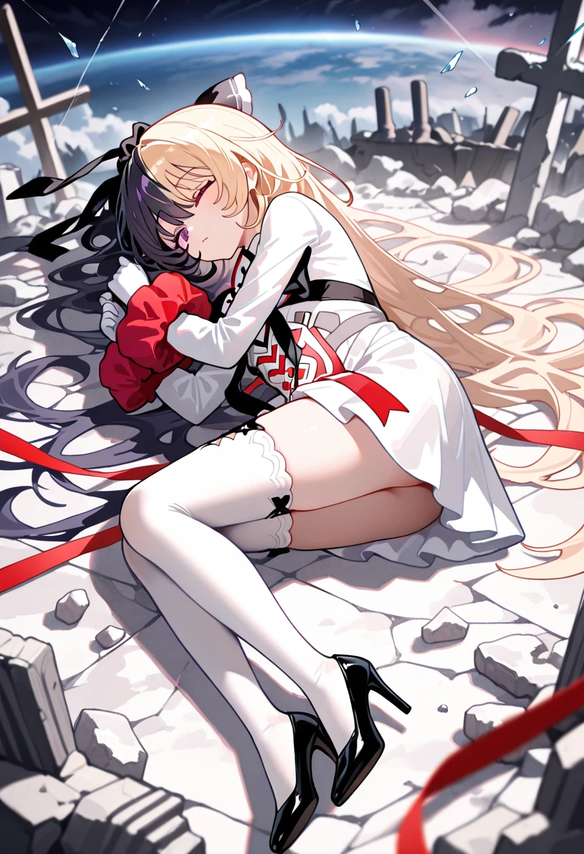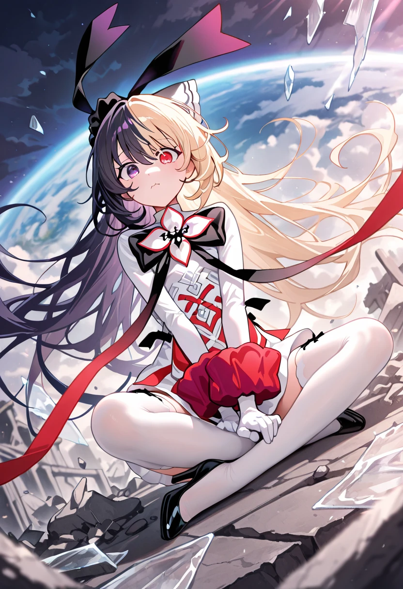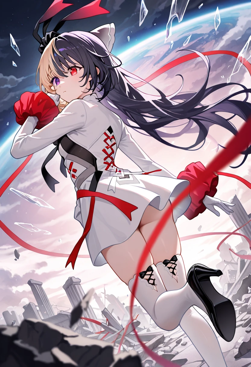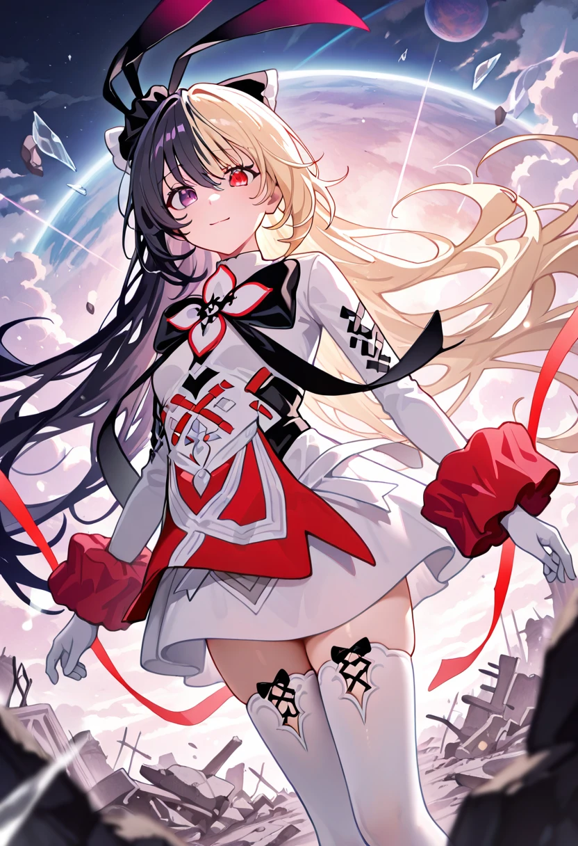 maya_arcaea,1girl,solo,two-tone hair,blonde hair,black hair,very long hair,heterochromia,red eyes,purple eyes,black hair ribbon,white dress,short dress,cross-laced clothes,long sleeves,white gloves,red ribbon,frilled sleeves,white thighhighs,high heels,black footwear,