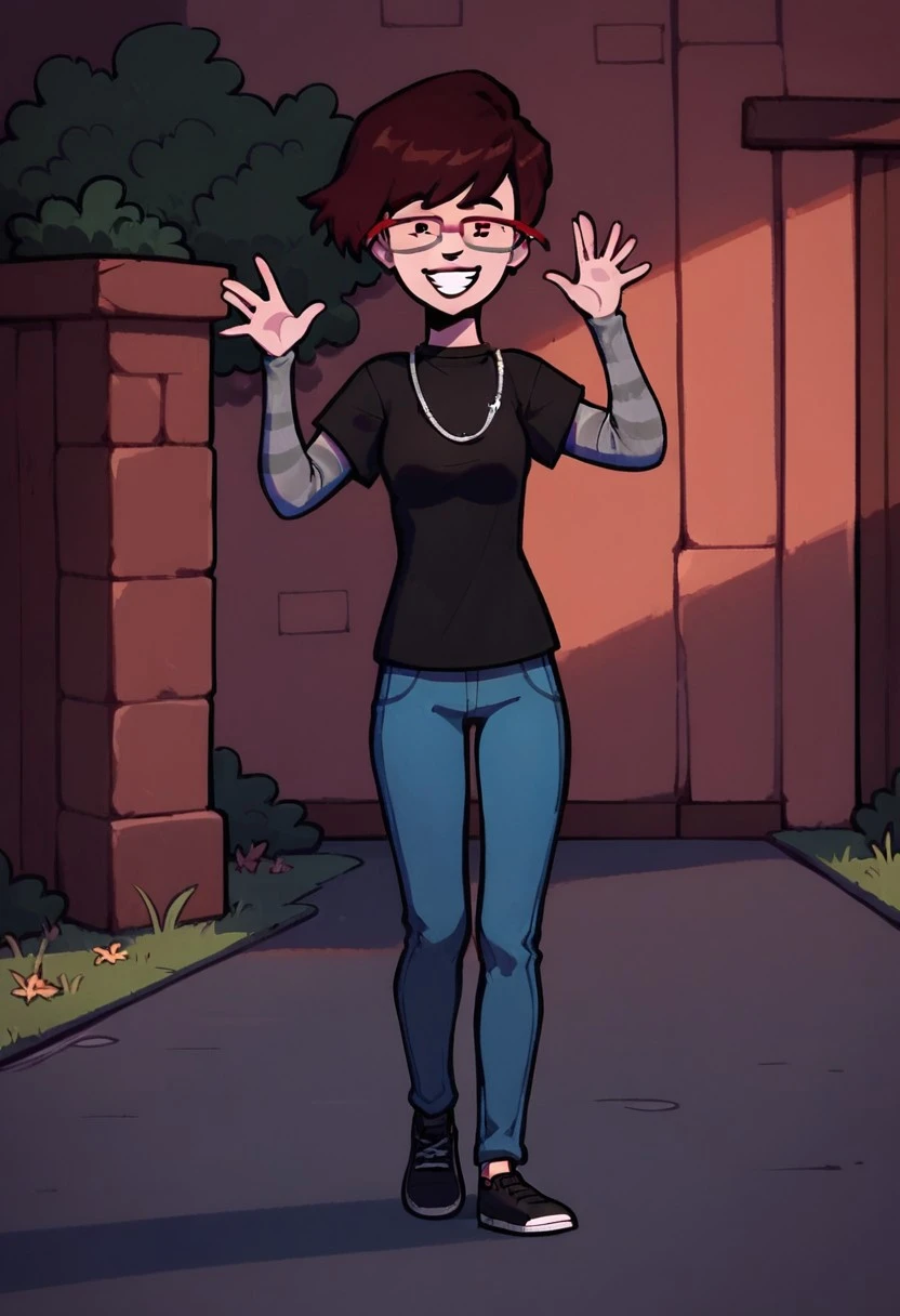 StoryboothAnna, 1girl, red-framed eyewear, glasses, short hair, brown hair, dot eyes,
