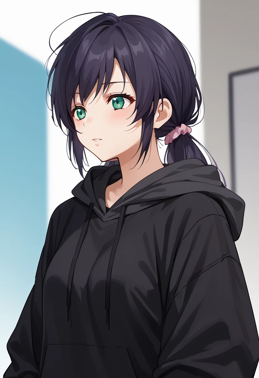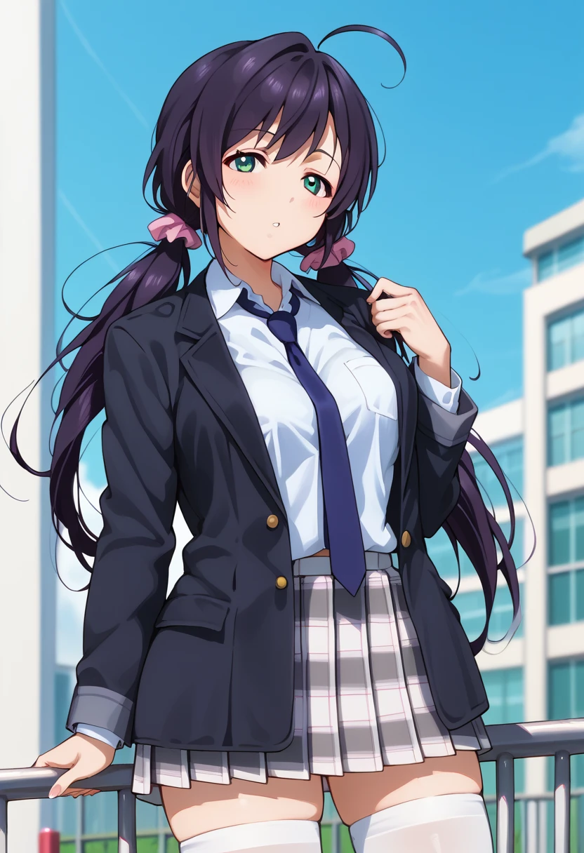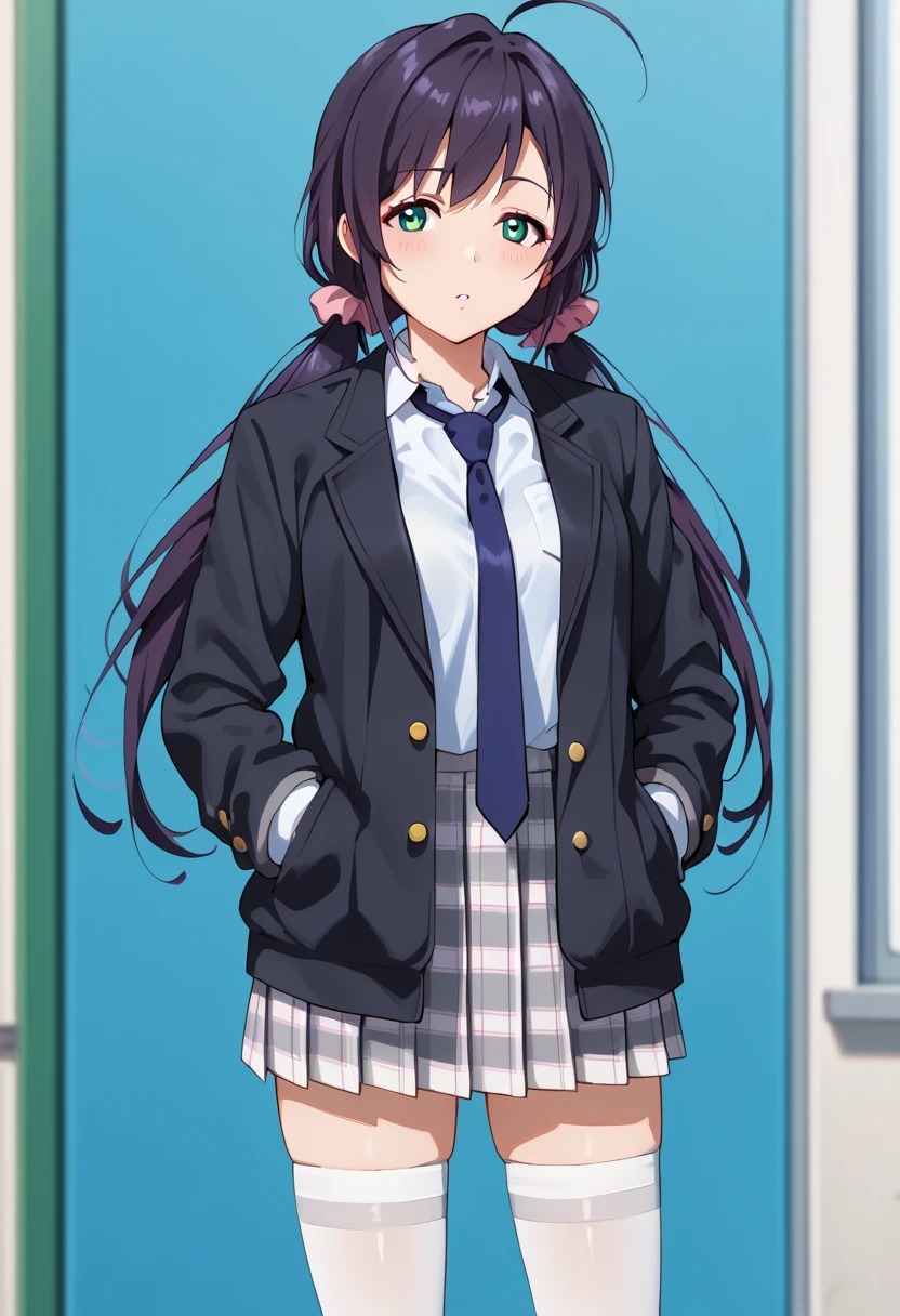school uniform, white shirt, black jacket, open jacket, blue necktie, plaid skirt, white thighhighs