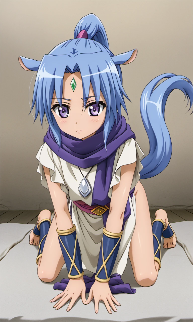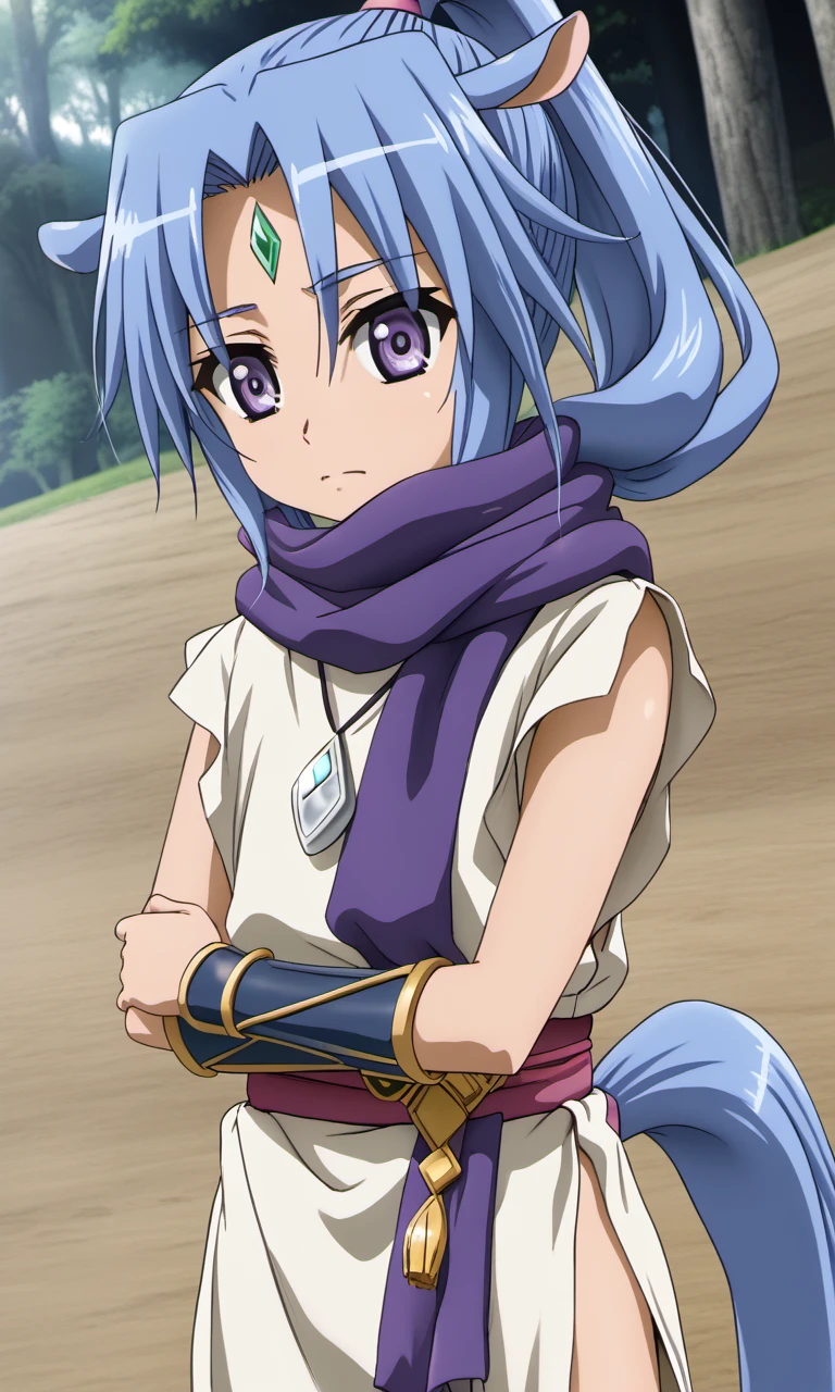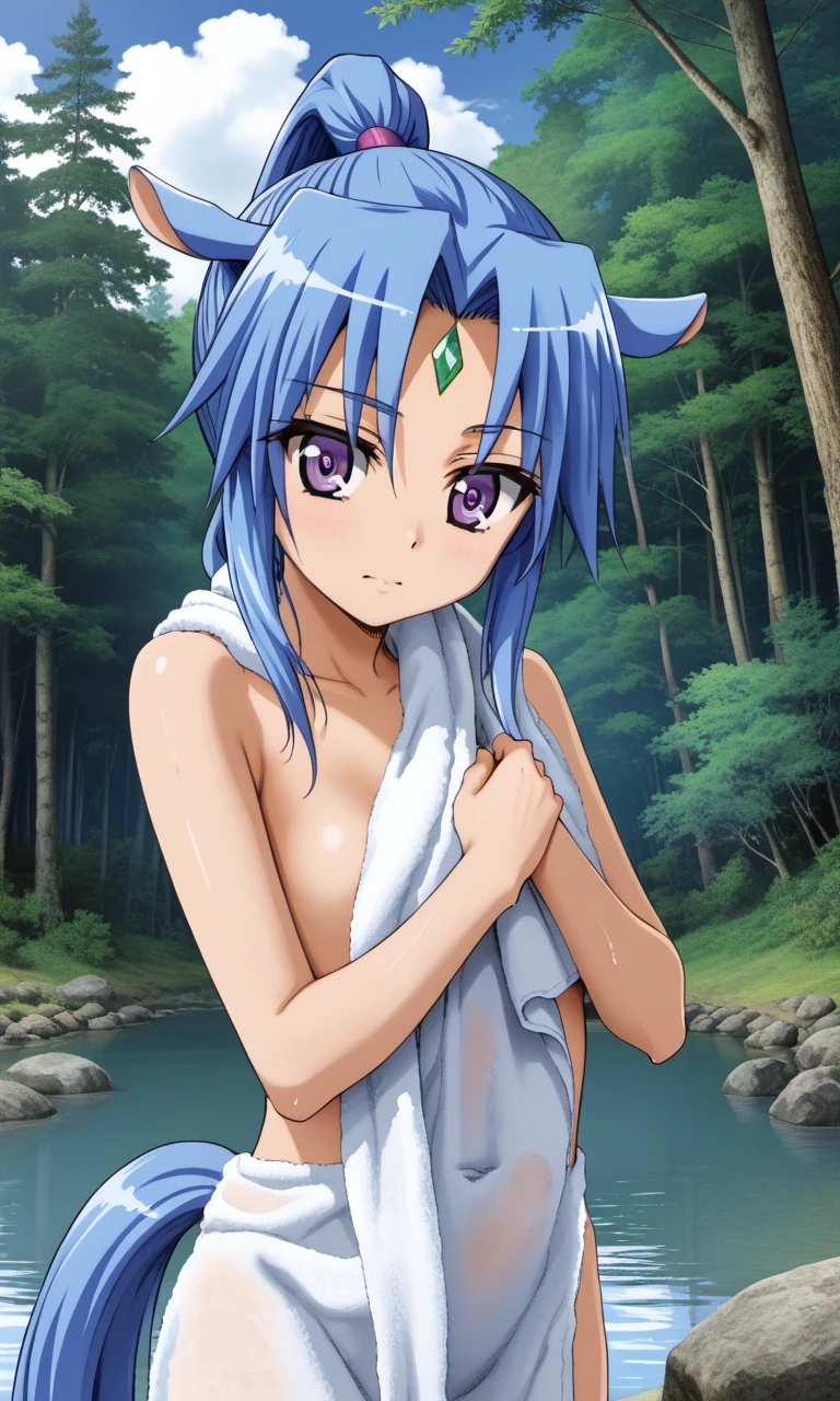 sharu, 1girl, purple eyes, blue hair, high ponytail, horse ears, horse tail, forehead jewel,