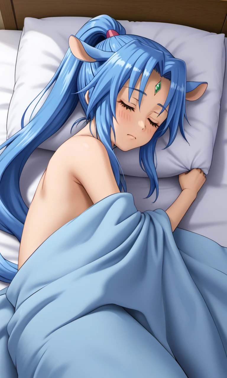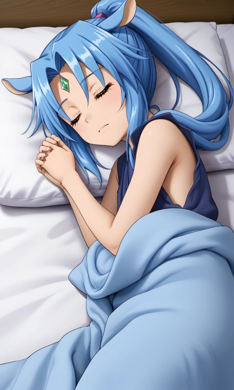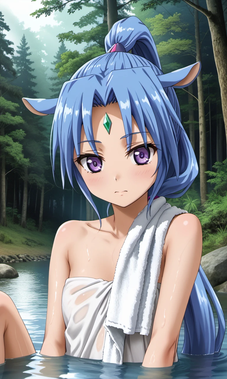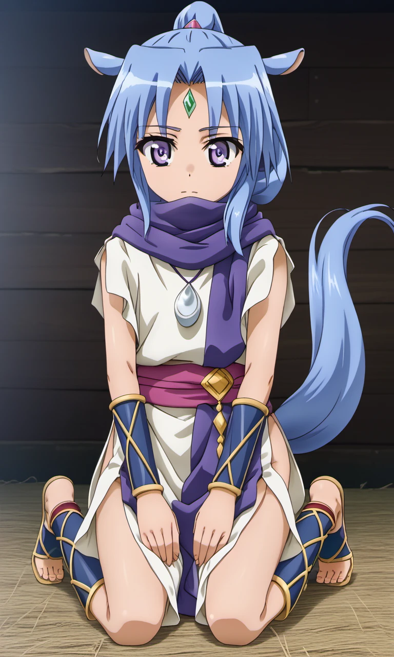 sharu, 1girl, purple eyes, blue hair, high ponytail, horse ears, horse tail, forehead jewel,