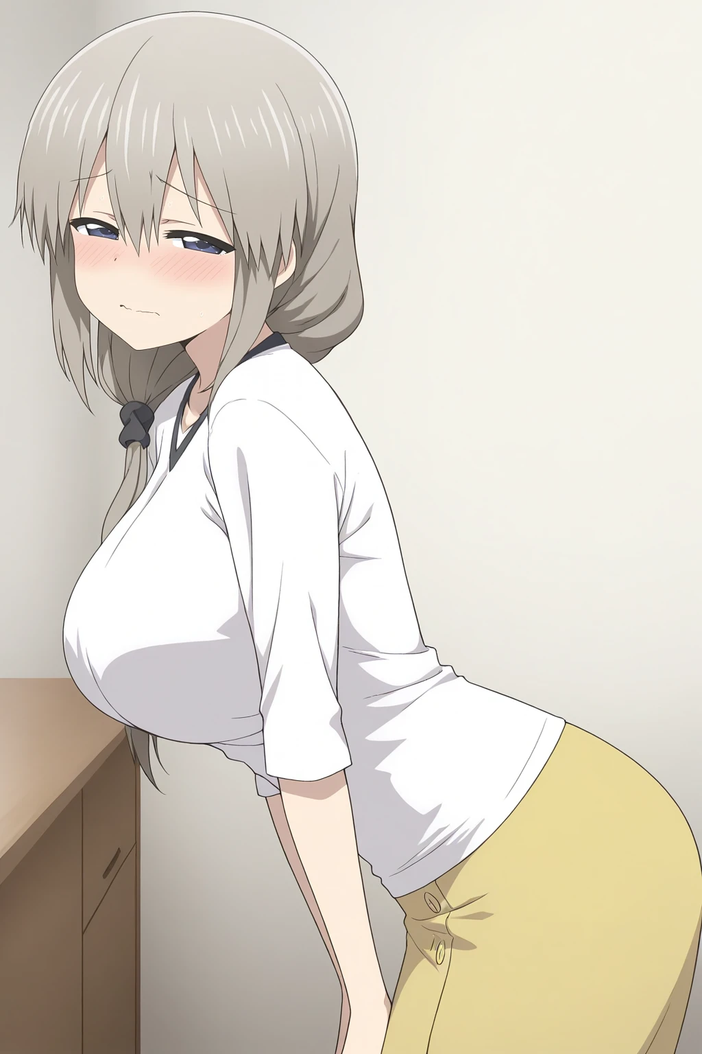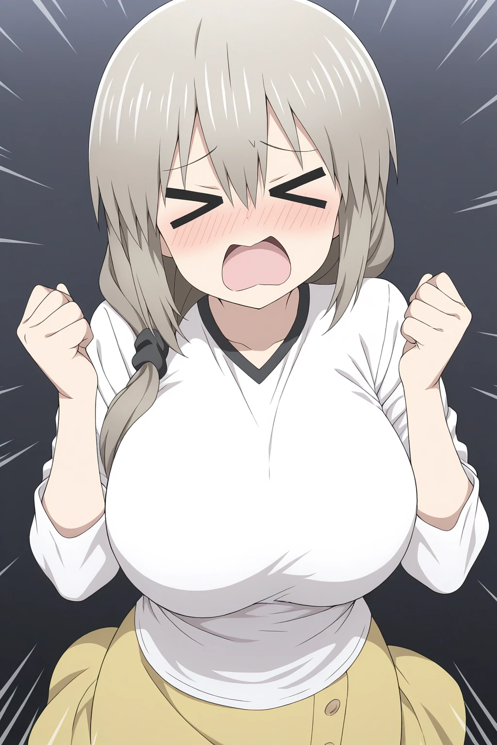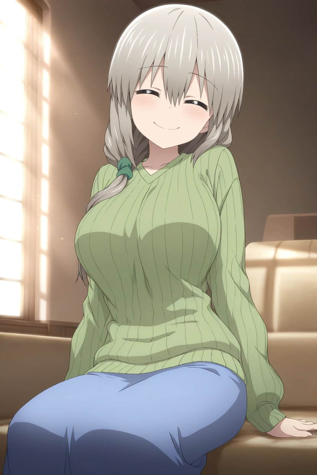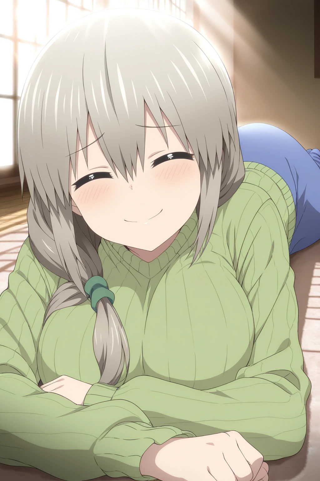 uzaki tsuki, grey hair, closed eyes, hair between eyes, hair over shoulder