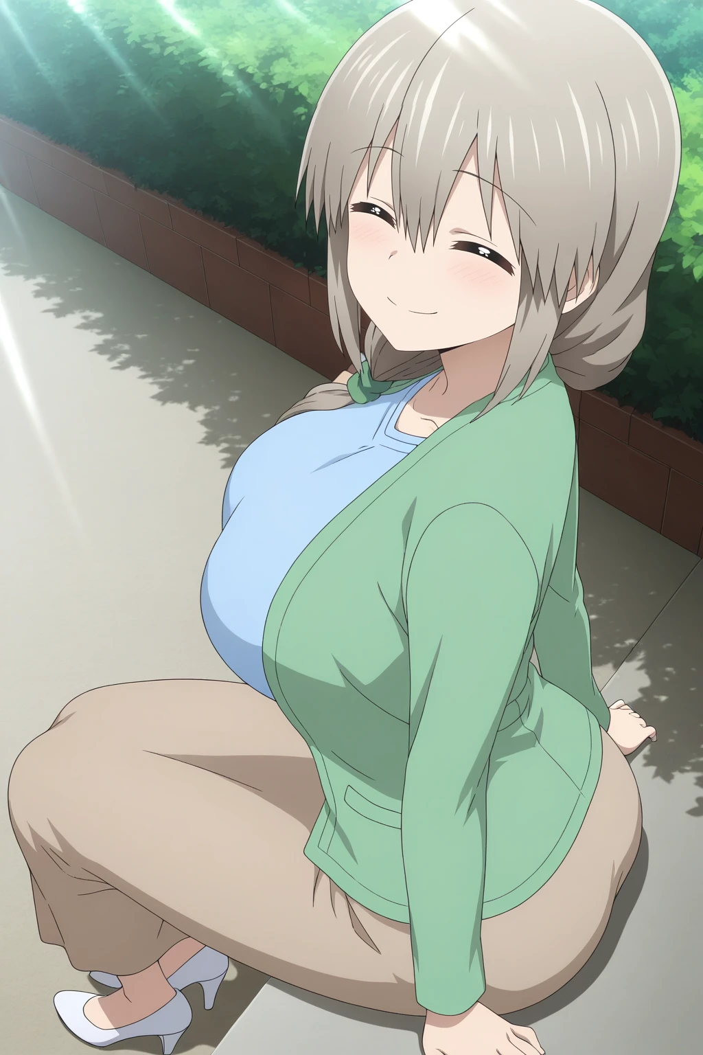 blue shirt, green jacket, long sleeves, brown skirt, long skirt, green scrunchie, white heels