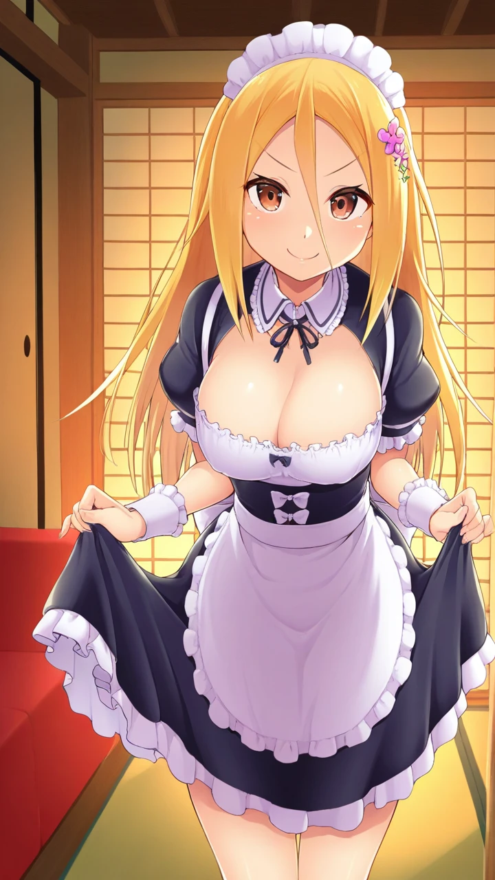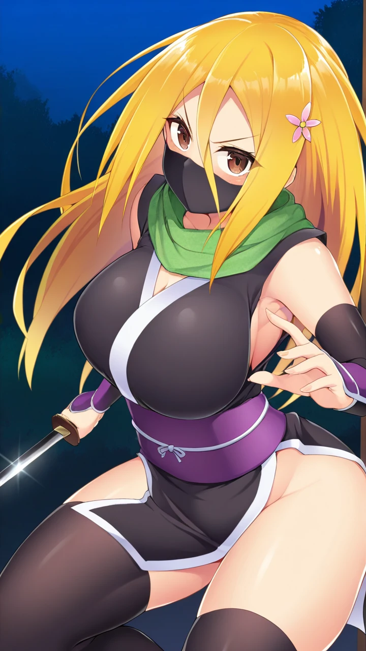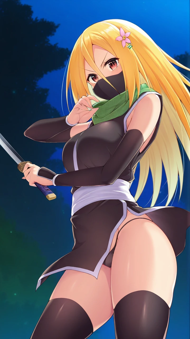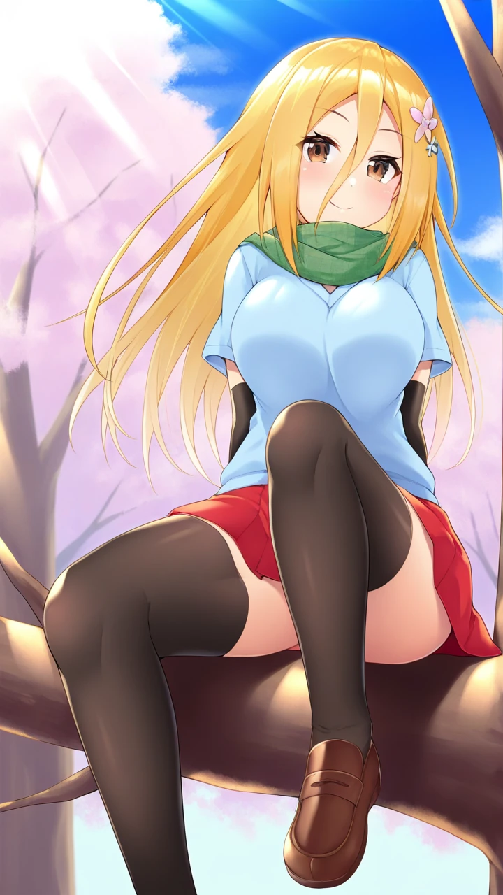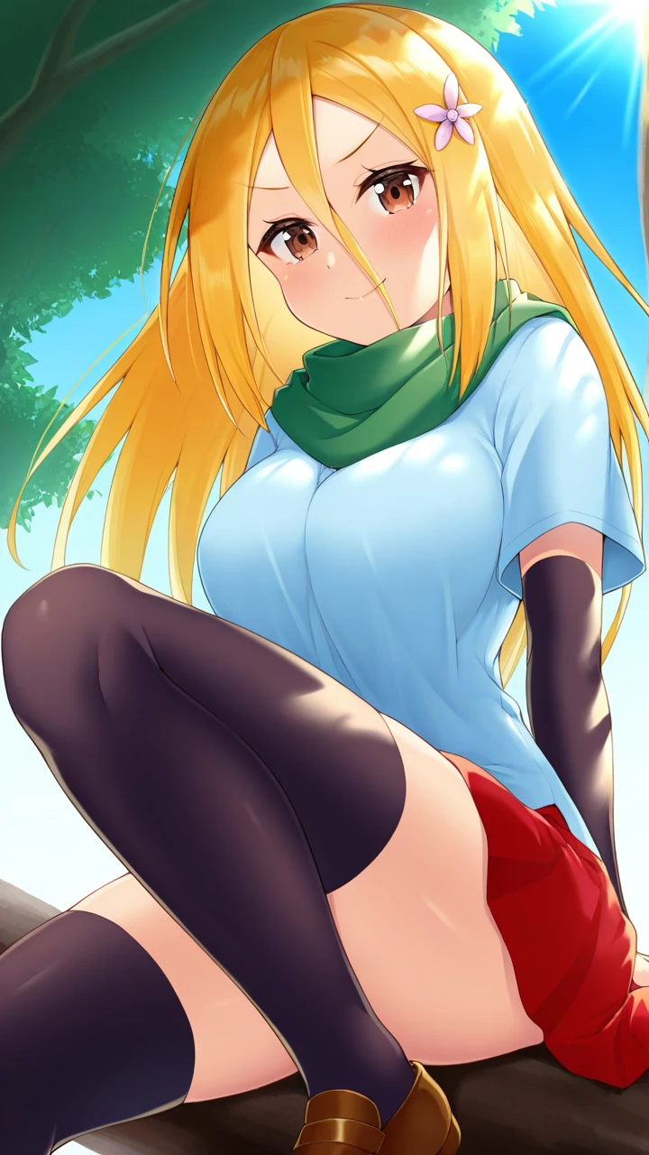 Renka Ichi, 1girl, solo female, blonde hair, long hair, brown eyes, , slim figure, light blue shirt, black sleeves, green scarf, red skirt, brown shoes, black thighhighs, flower hairpin