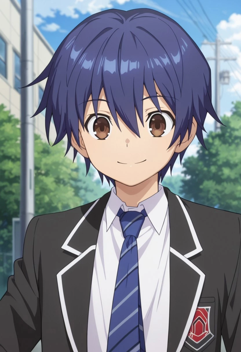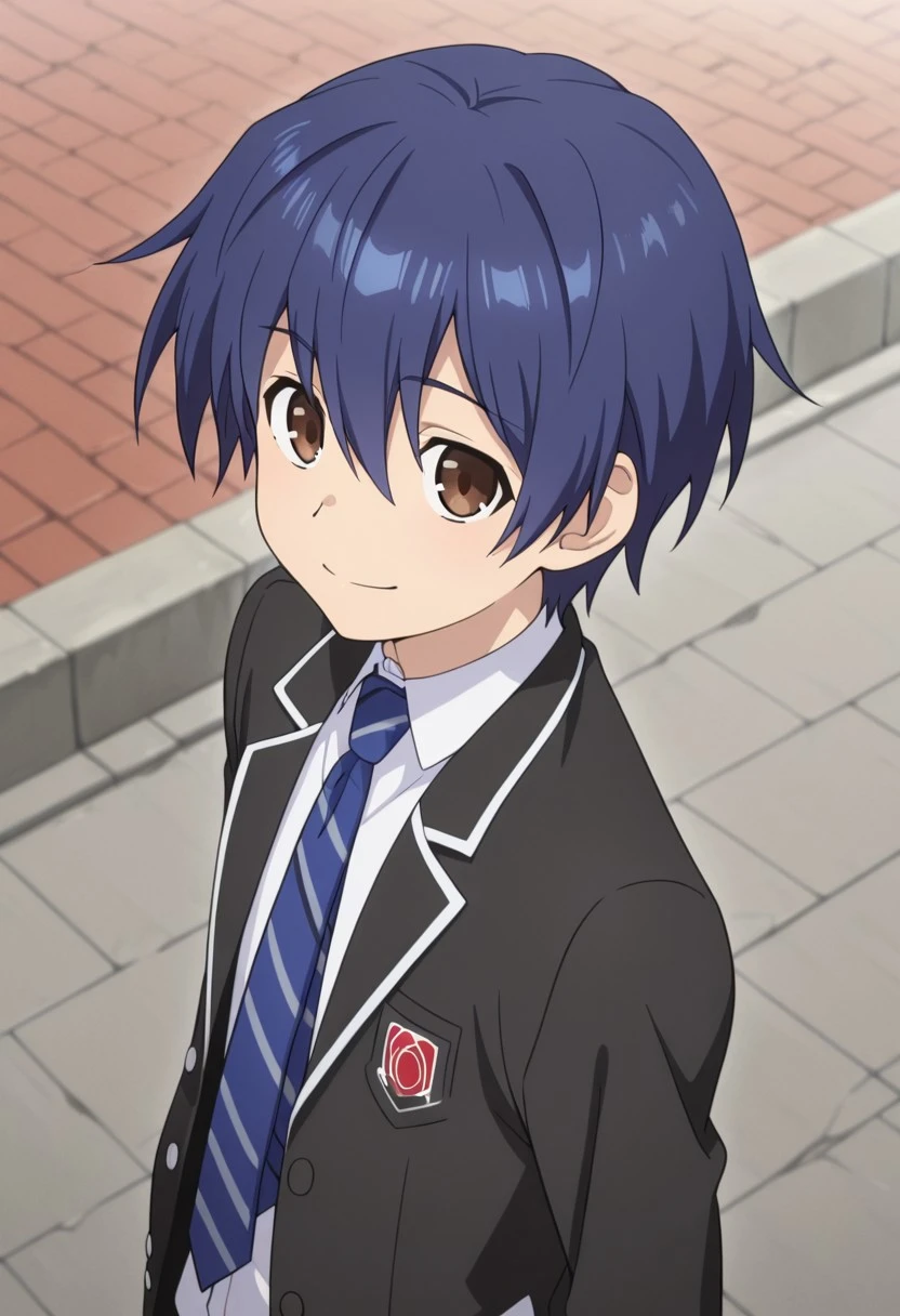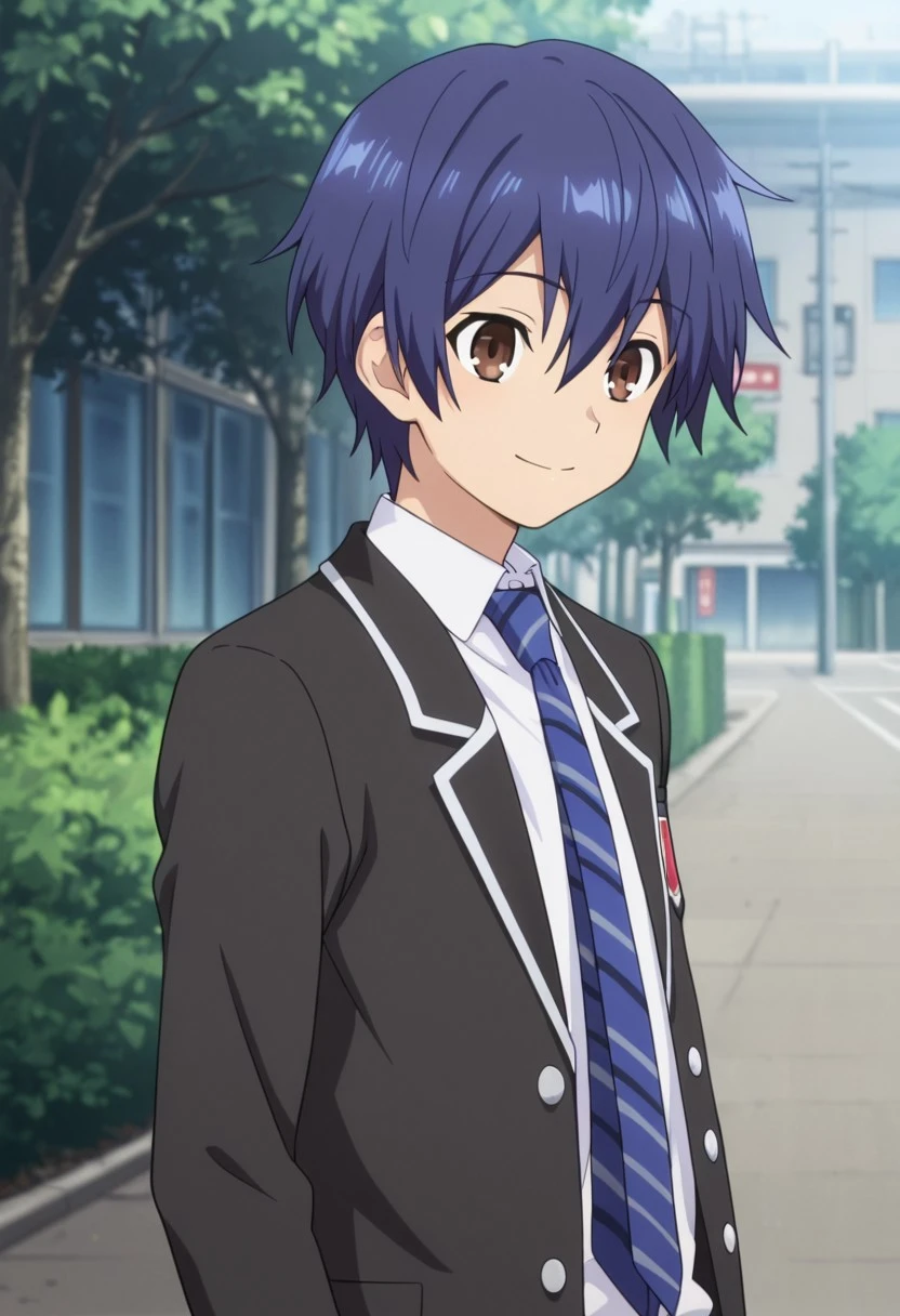 ShidItsu, 1boy, male focus, solo, brown eyes, blue hair, school uniform, white shirt, collared shirt, blue necktie, striped necktie, jacket, blazer, black jacket, open jacket, grey pants, shoes, black footwear,