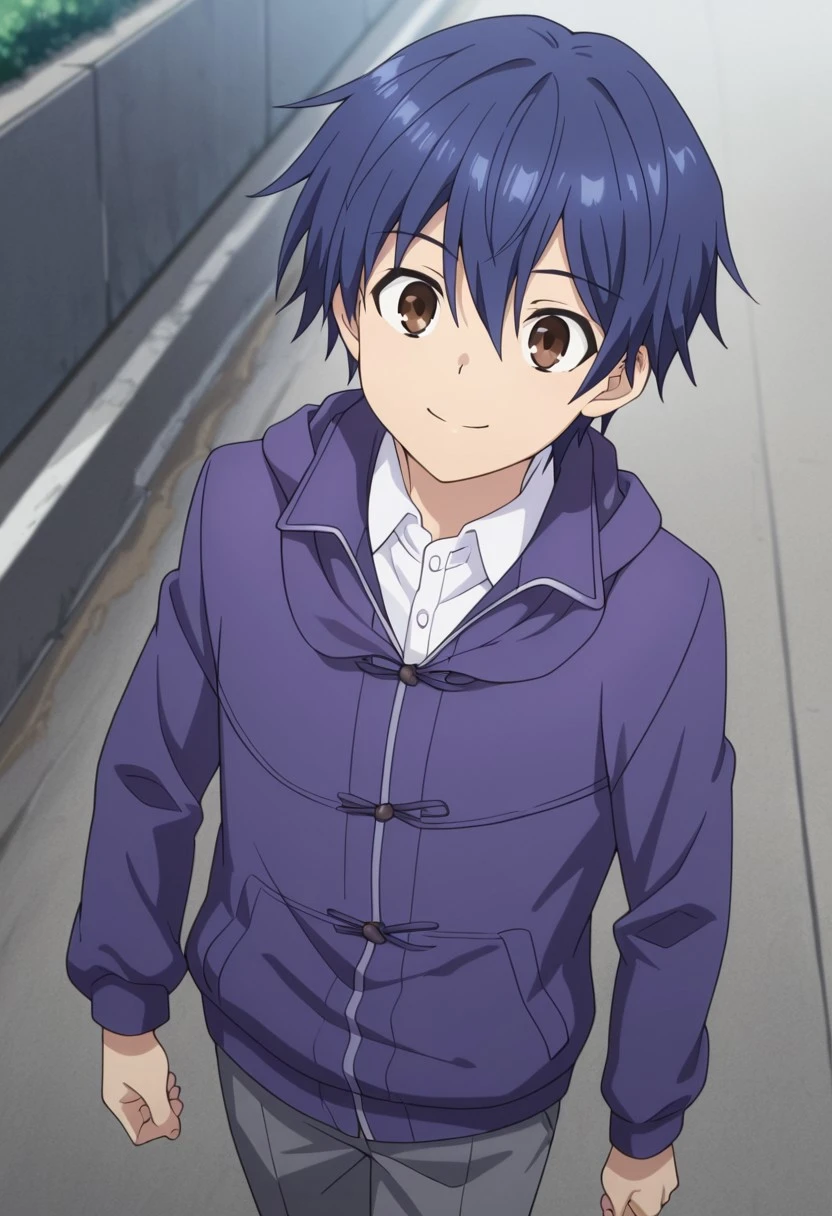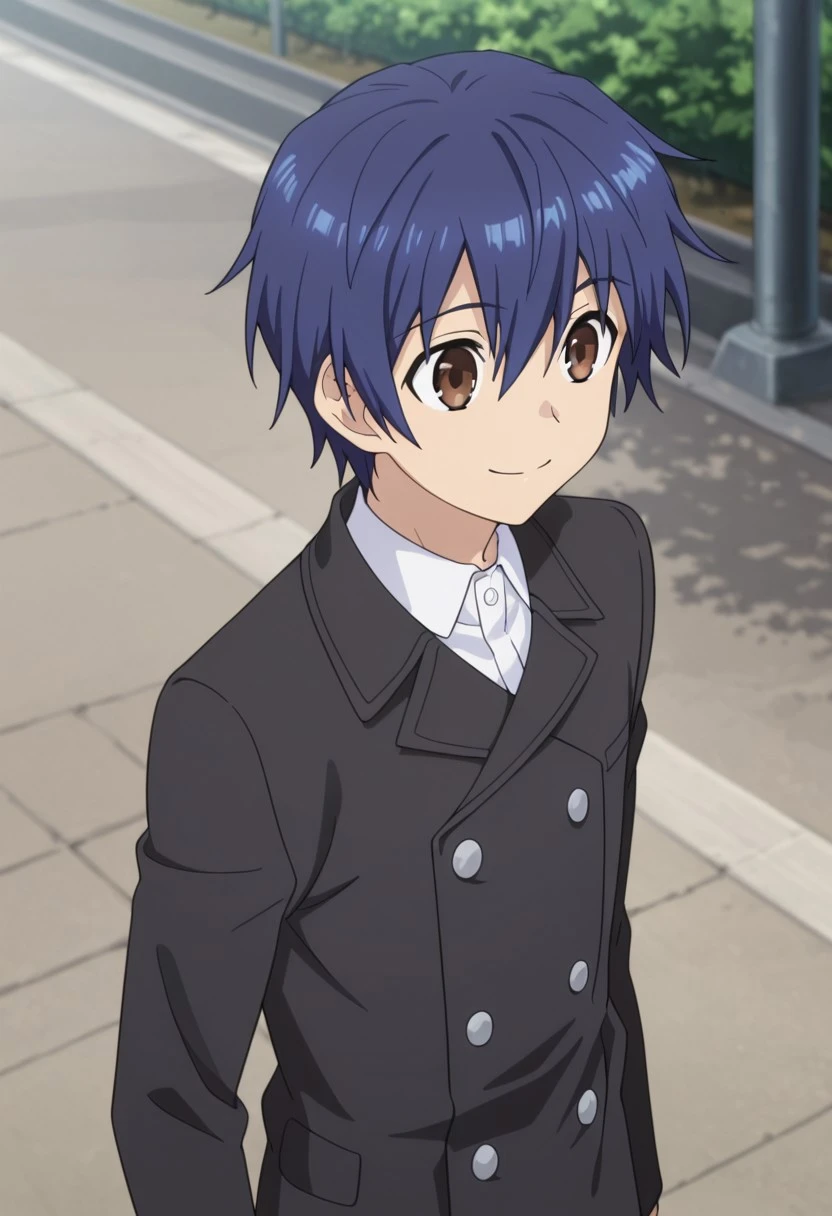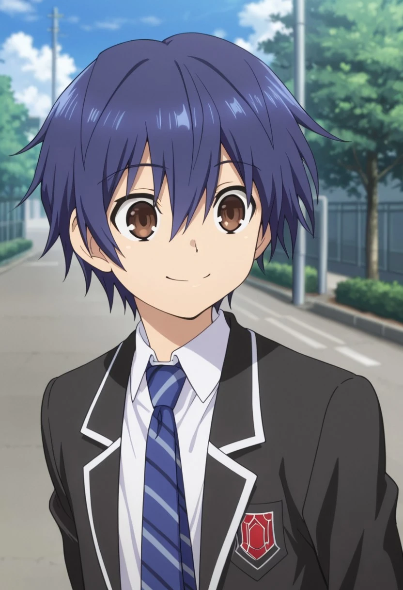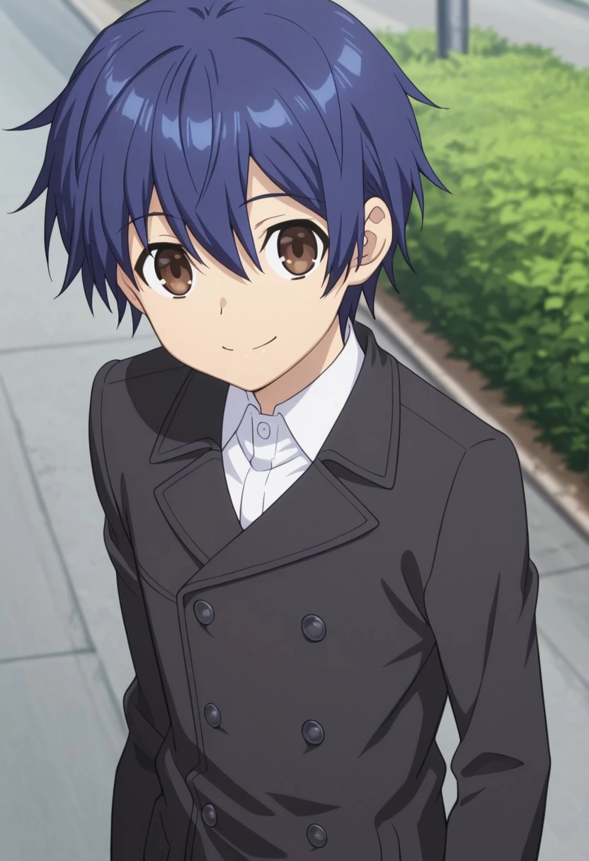ShidItsu, 1boy, male focus, solo, brown eyes, blue hair, school uniform, white shirt, collared shirt, blue necktie, striped necktie, jacket, blazer, black jacket, open jacket, grey pants, shoes, black footwear,
