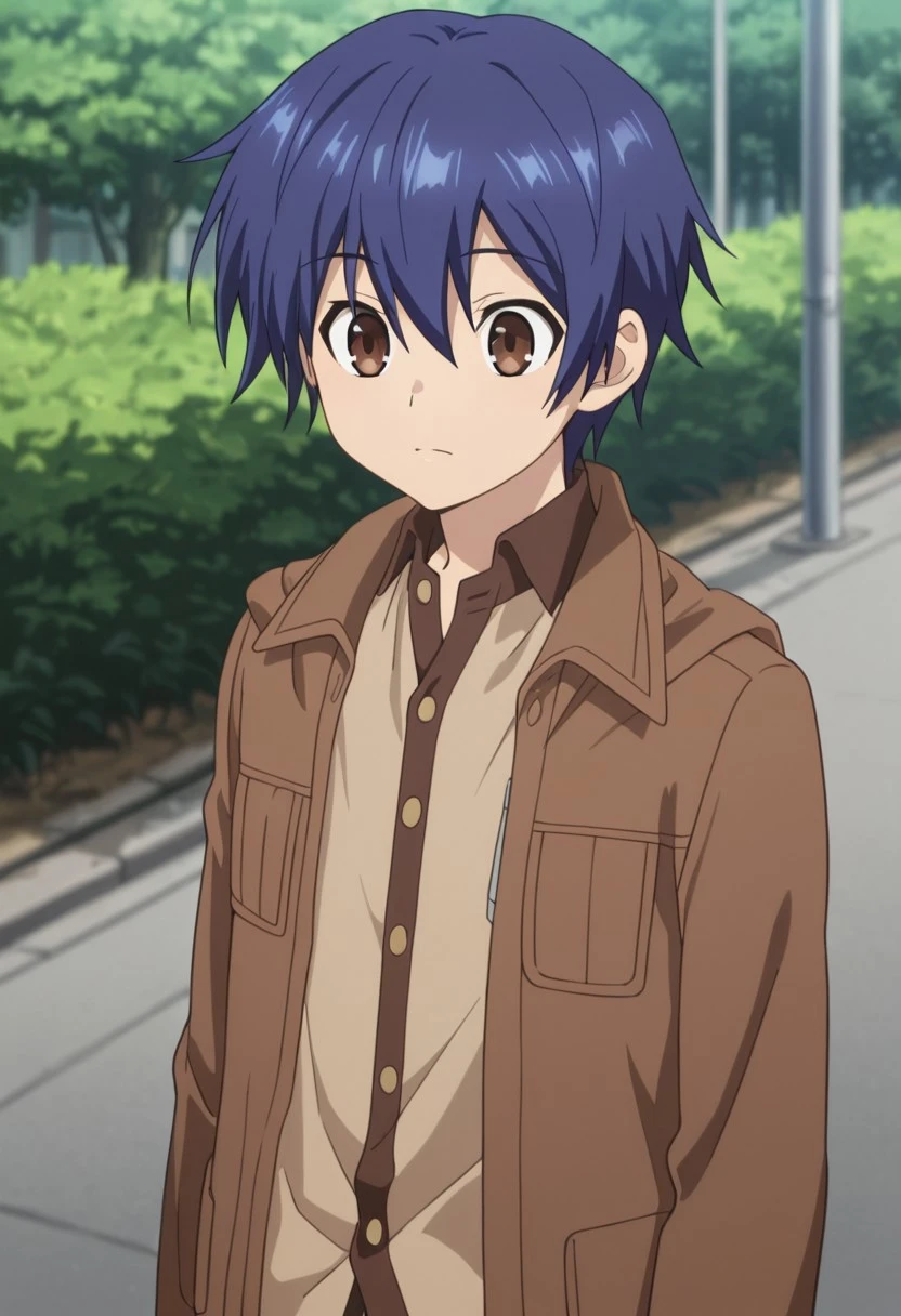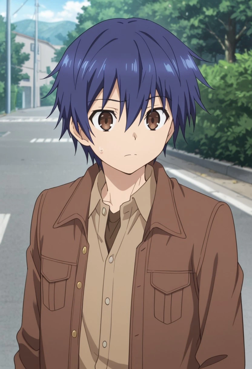 ShidItsu, 1boy, male focus, solo, brown eyes, blue hair, brown shirt, partially unbuttoned, brown jacket, open jacket, brown pants,