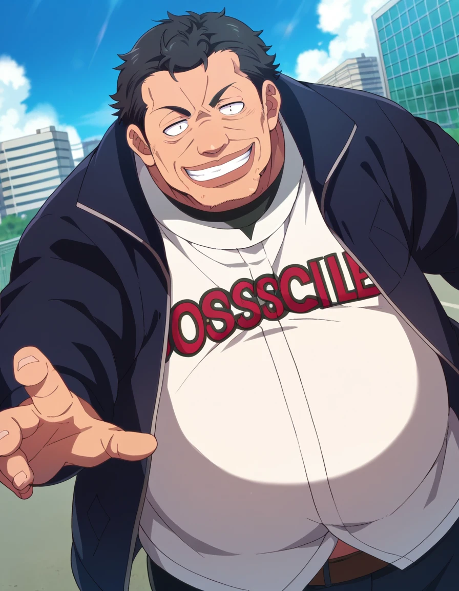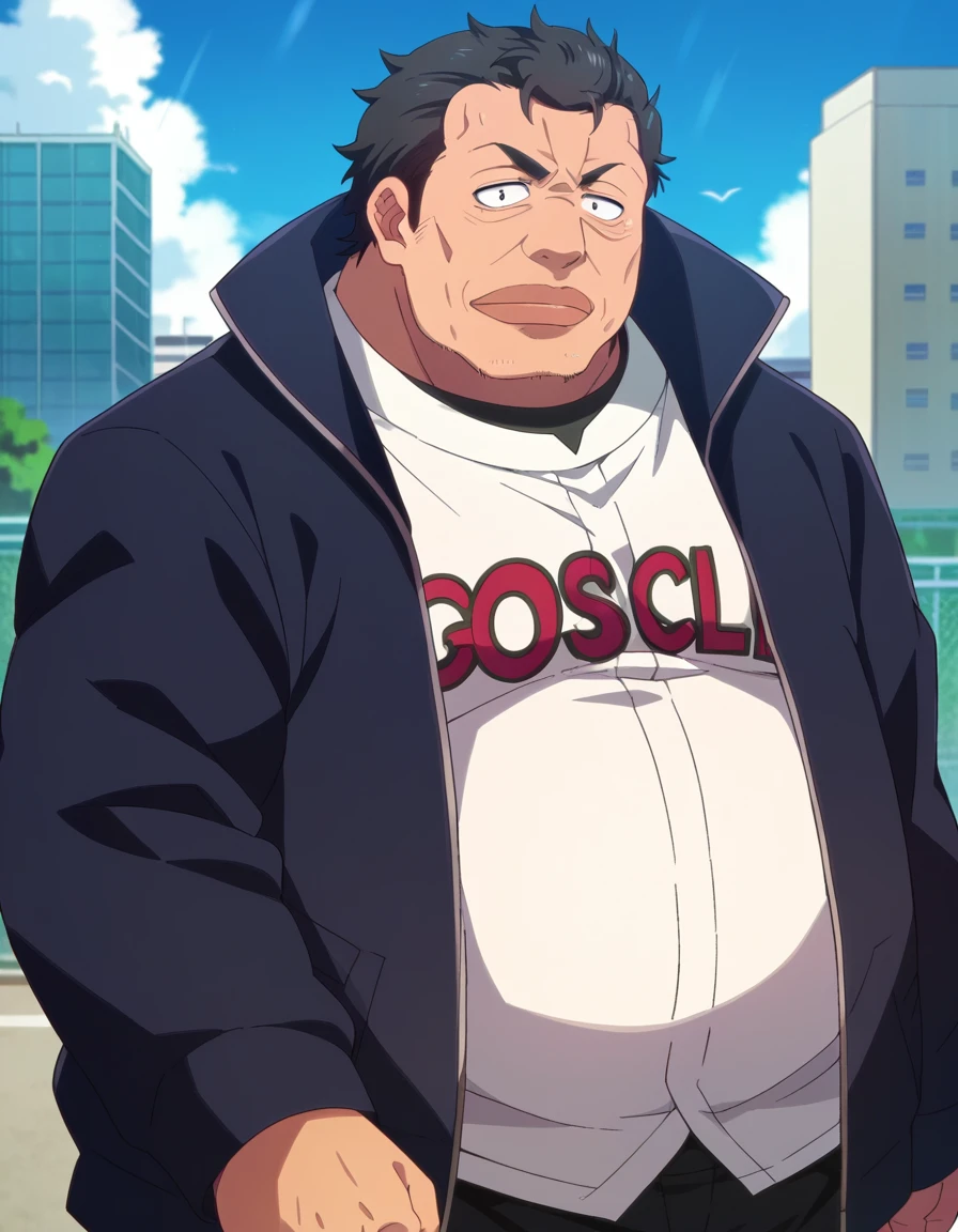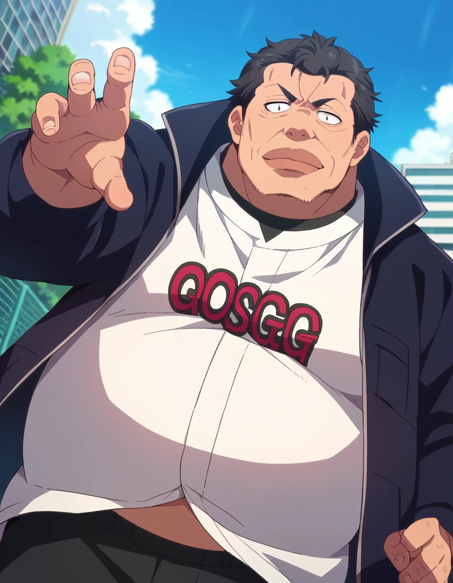 gonzou kosugi, short hair, black hair, male focus, facial hair, stubble, fat, fat man, black eyes,