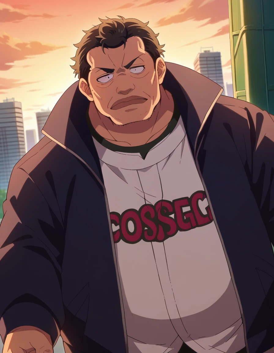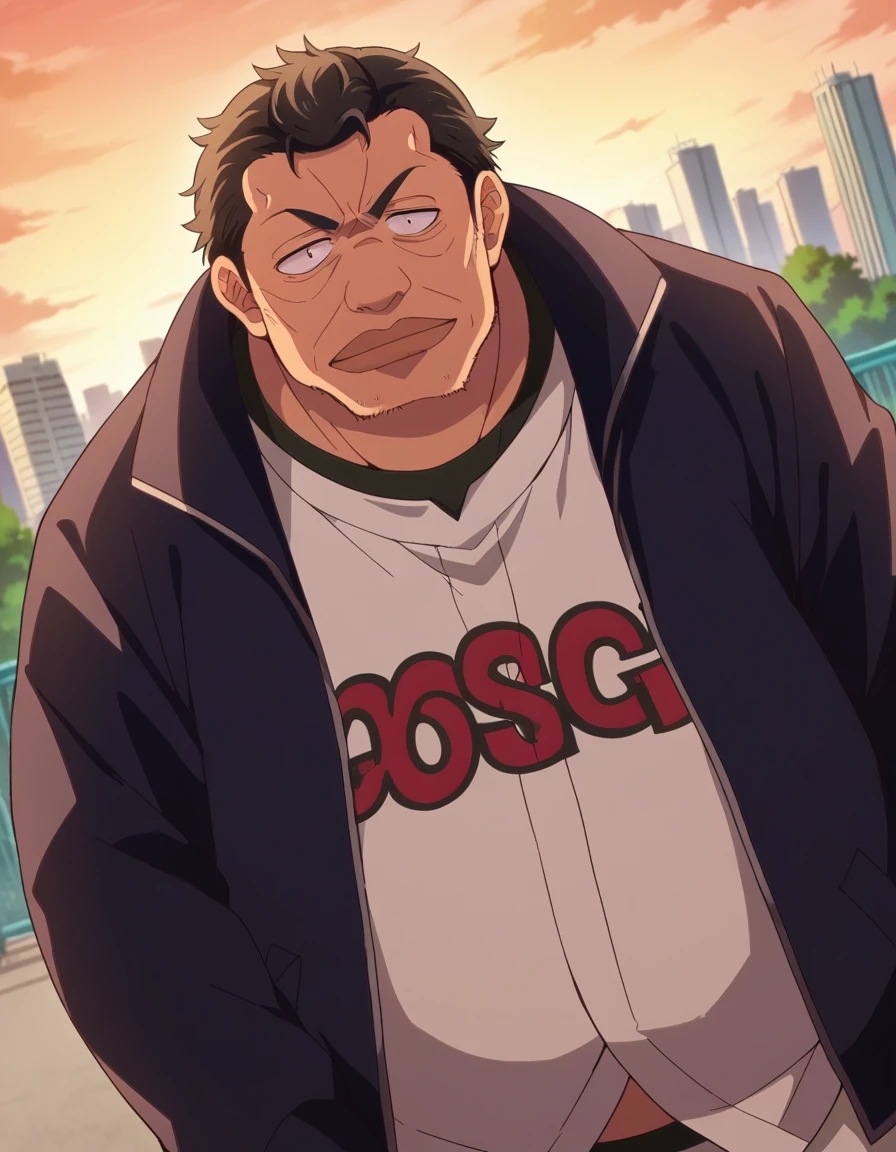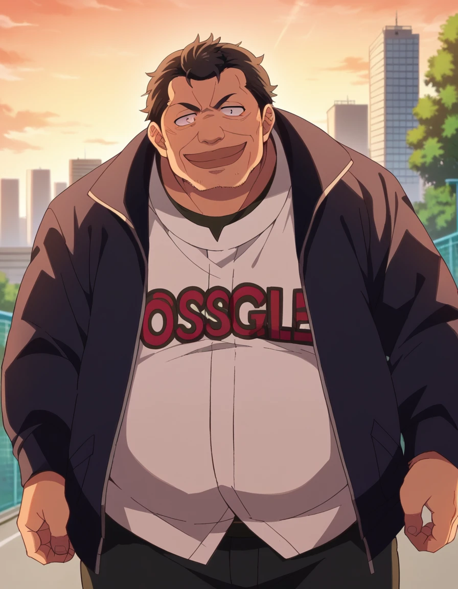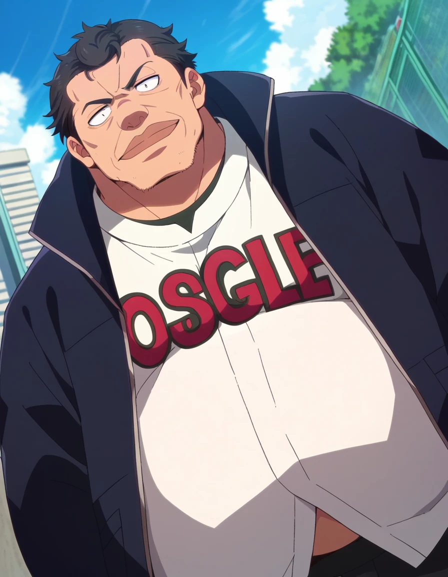 gonzou kosugi, short hair, black hair, male focus, facial hair, stubble, fat, fat man, black eyes,