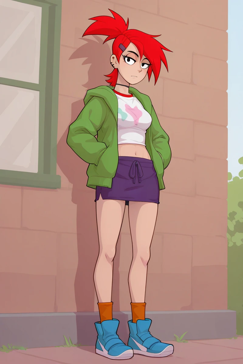 kotaotake_fr4nk13_f0st3r, not furry, female, eyelashes, solo, human, black eyes, red hair, hairclip, ponytail, swept bangs, messy hair, ear piercing, slim, 5 fingers, choker, open hoodie, green hoodie, white t-shirt, print topwear, skirt, purple bottomwear, midriff, medium breasts,
