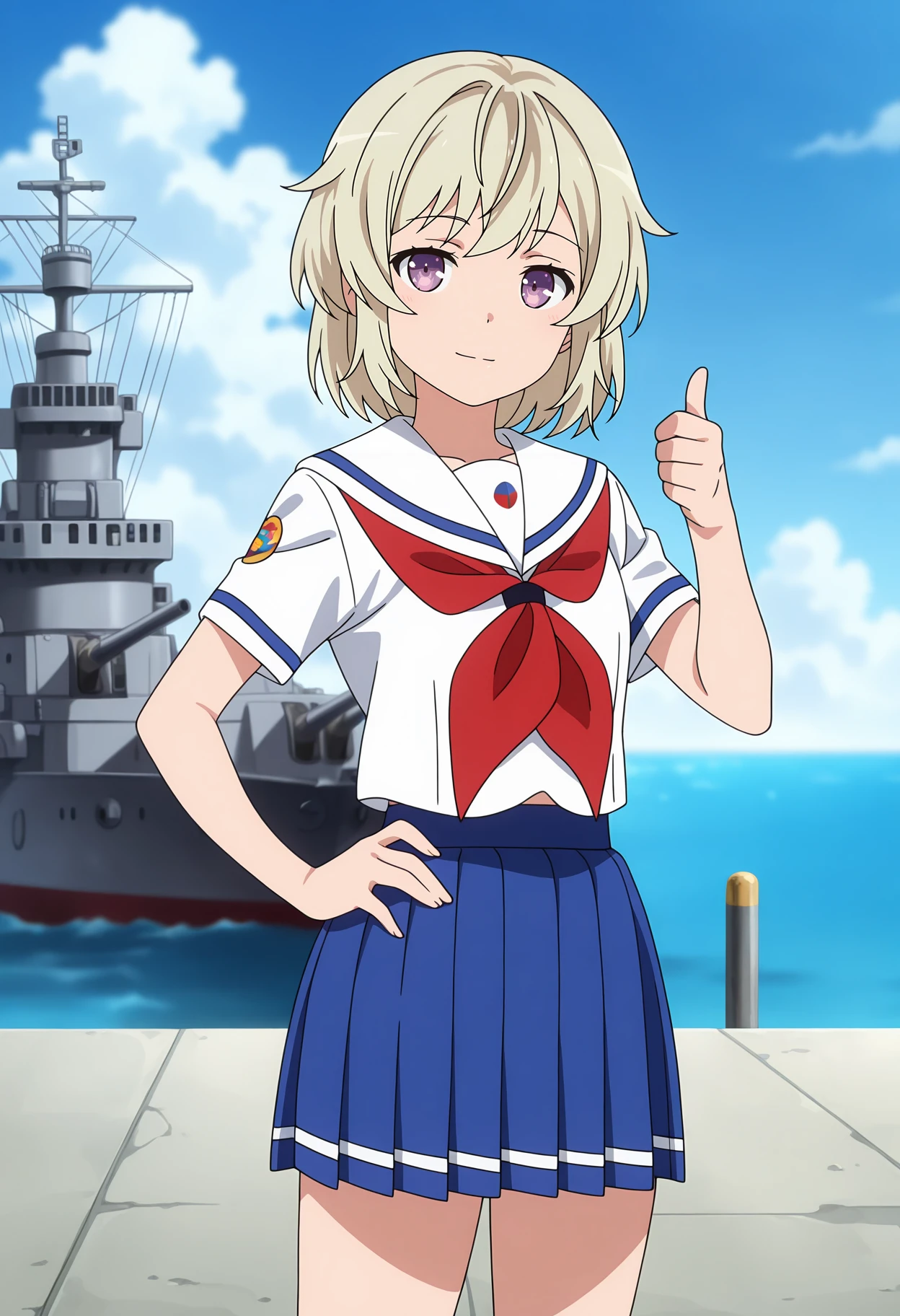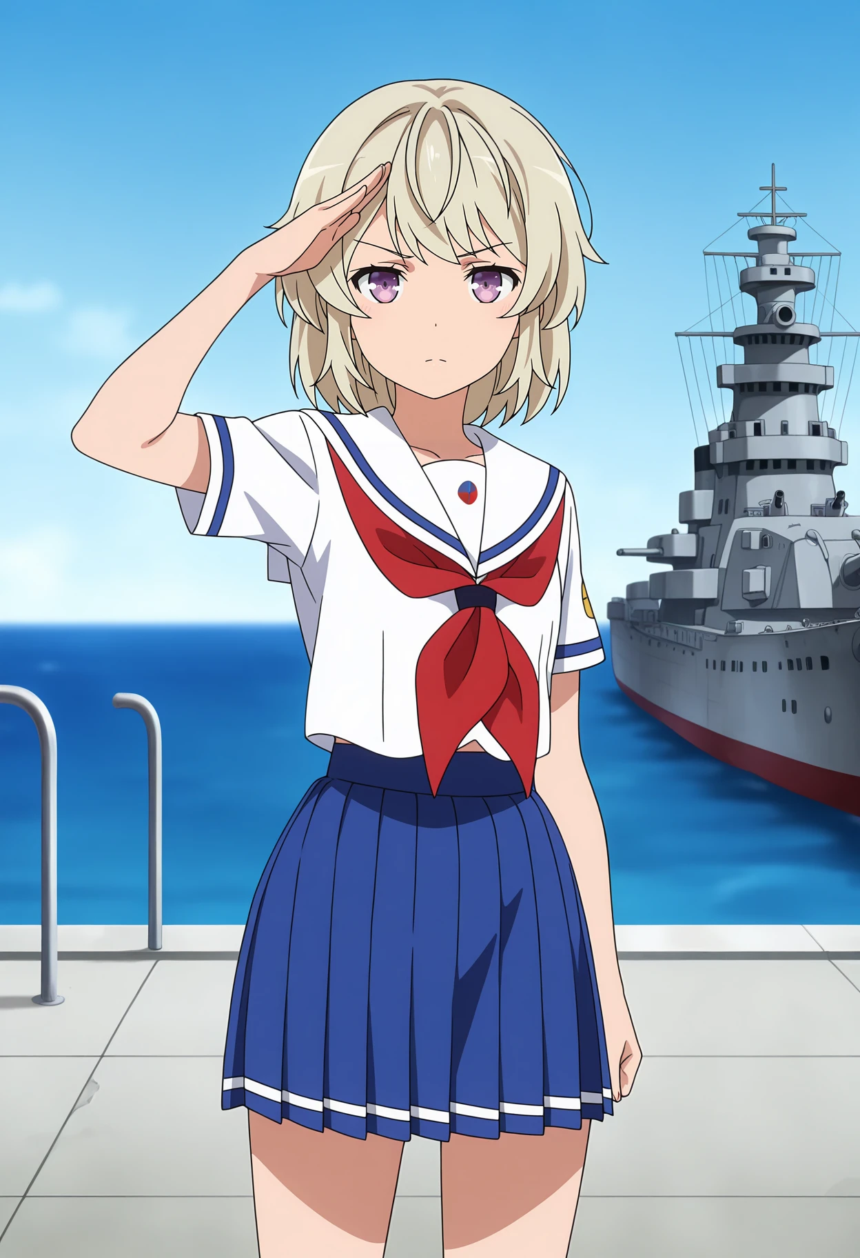 short hair, blonde hair, purple eyes, white sailor collar, white shirt, red neckerchief, short sleeves, pleated skirt, blue skirt
