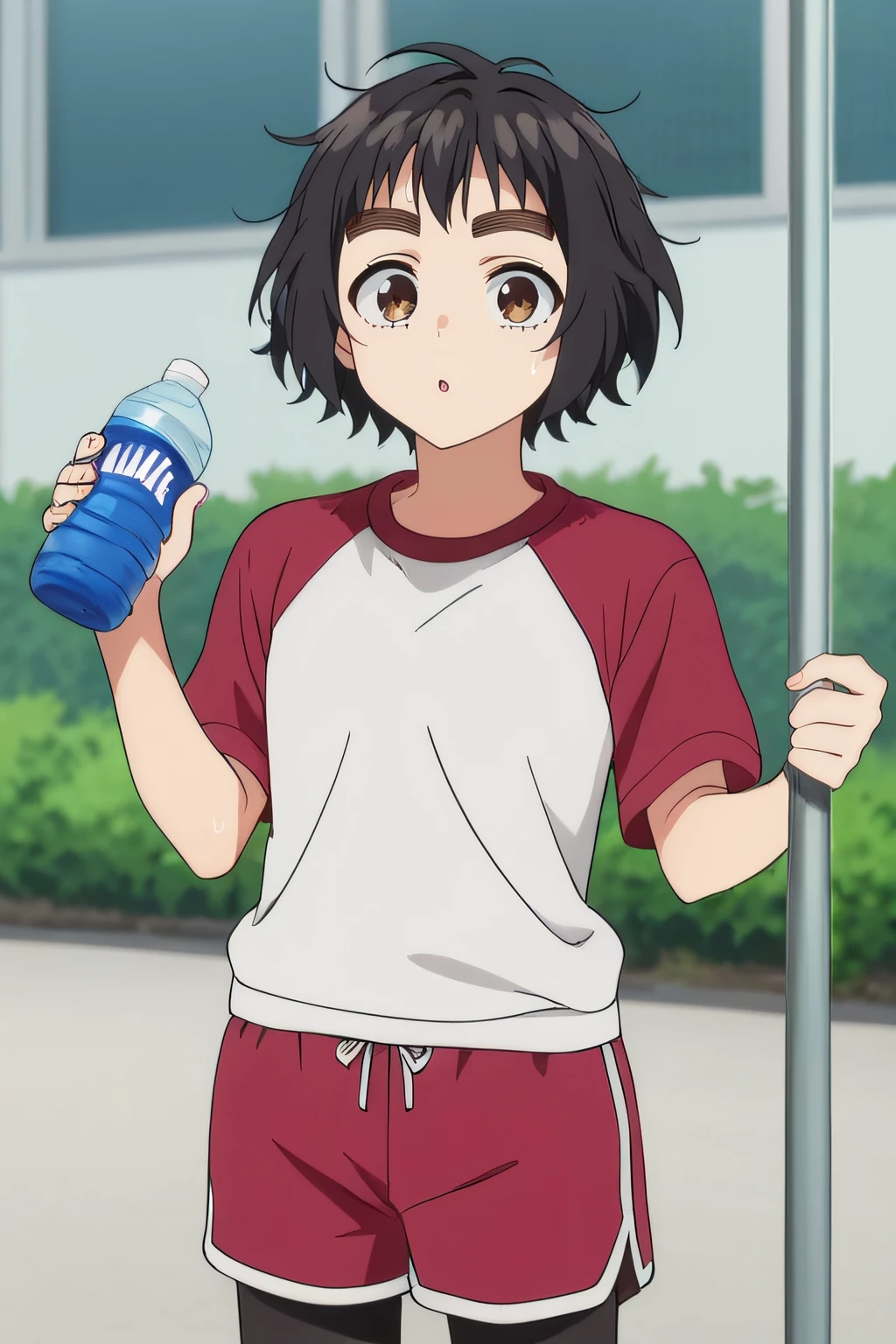 black pantyhose, white shirt, red shorts, raglan red sleeves, gym shorts