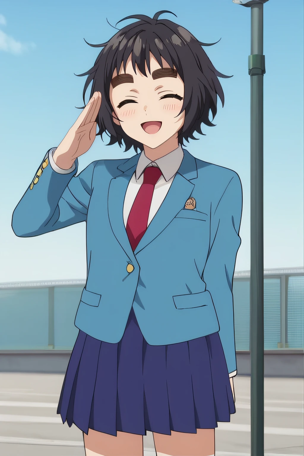 school uniform, pleated skirt, blue skirt, black kneehighs, light blue blazer, red necktie