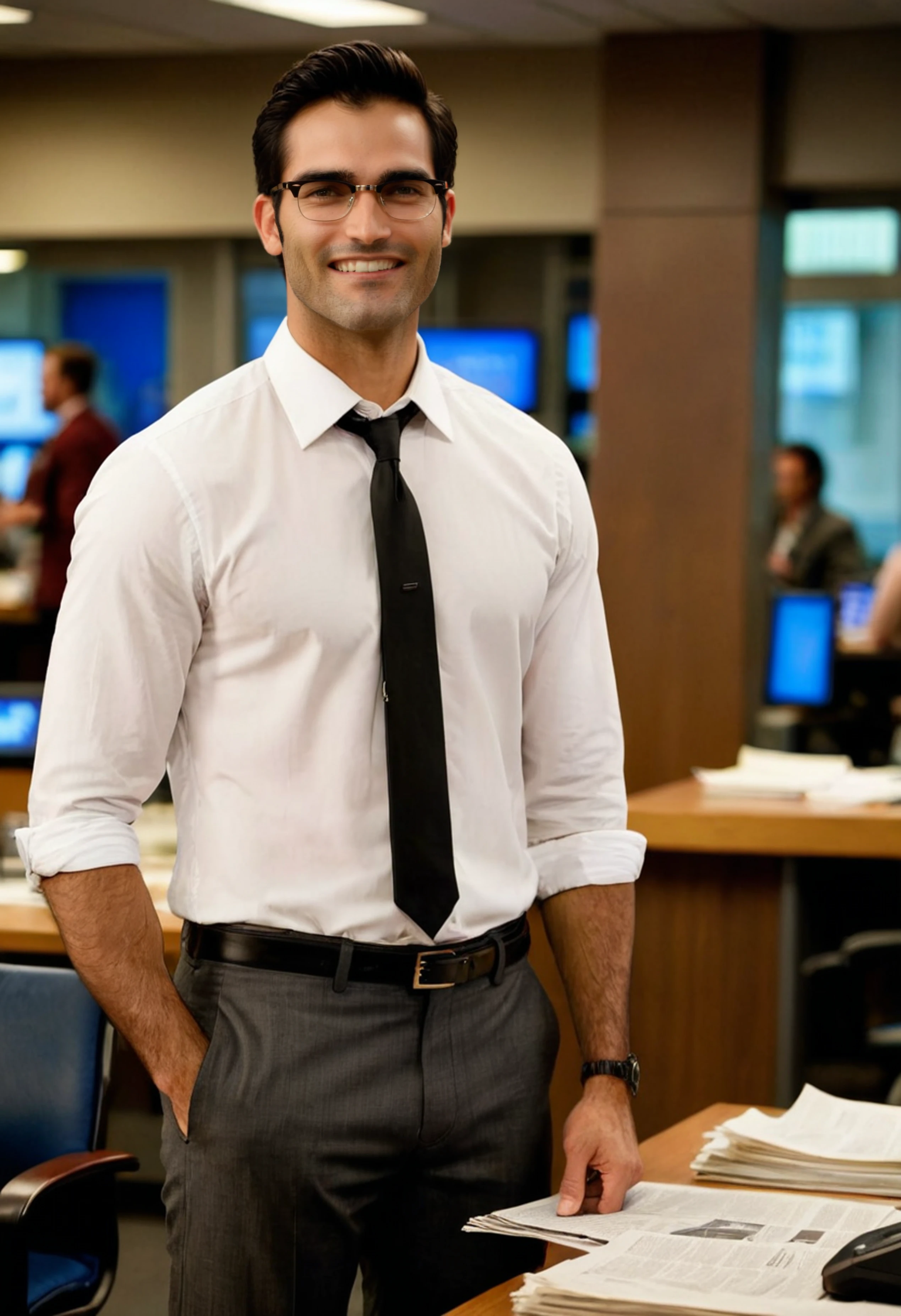 His facial expression defaults to more "grumpy cat", so you may want to add "smiling" to the prompt if you're going more Clark Kent than Derek Hale.