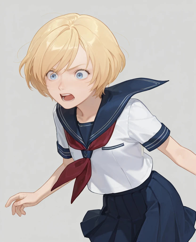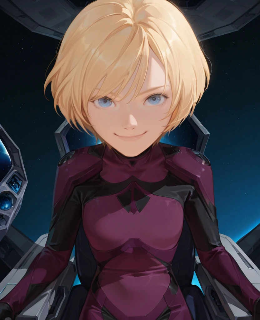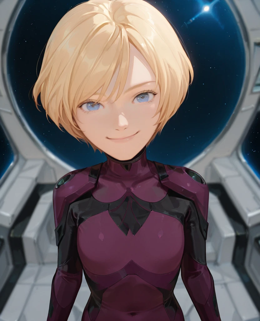 Cosette Cosmos, 1girl, solo, short hair, blonde hair, blue eyes, bodysuit,