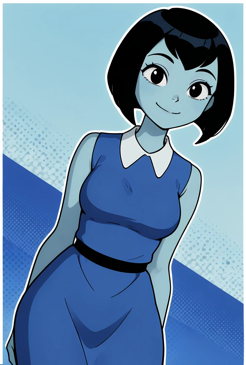 probity, 1girl, short hair, black hair, black eyes, blue skin, blue dress, sleeveless, bob cut, collared dress
