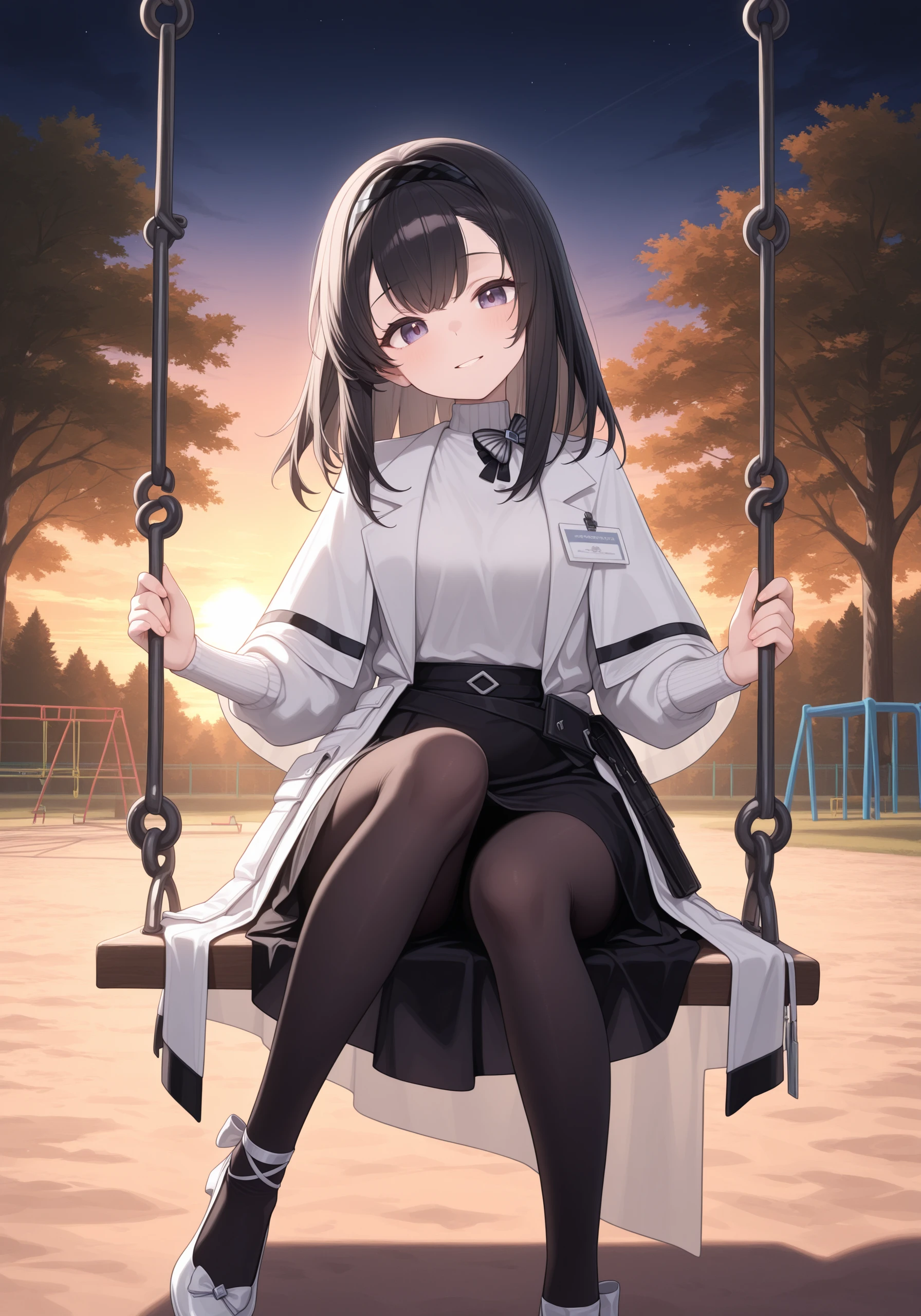 white coat, white turtleneck sweater, capelet, striped bowtie, id card, black skirt, black pantyhose, white heels