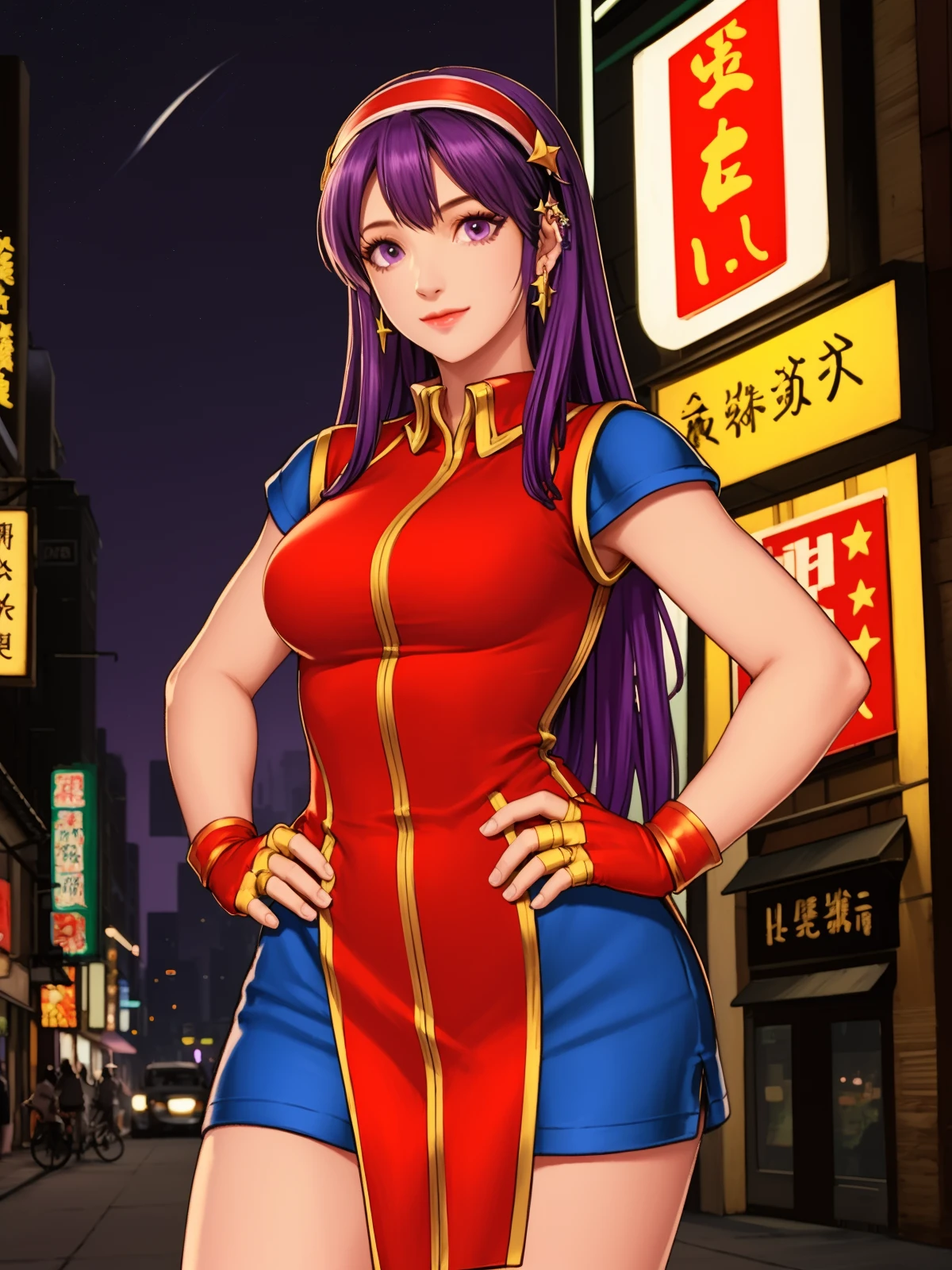 QHmagongyadianna,1girl,solo,purple hair,fingerless gloves,long hair,hairband,star hair ornament,purple eyes,earrings,dress,jewelry,chinese clothes,hair ornament,lips,looking at viewer,cityscape, night, hand on hip, cowboy shot,